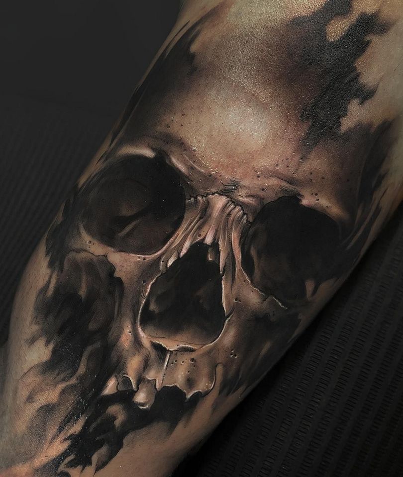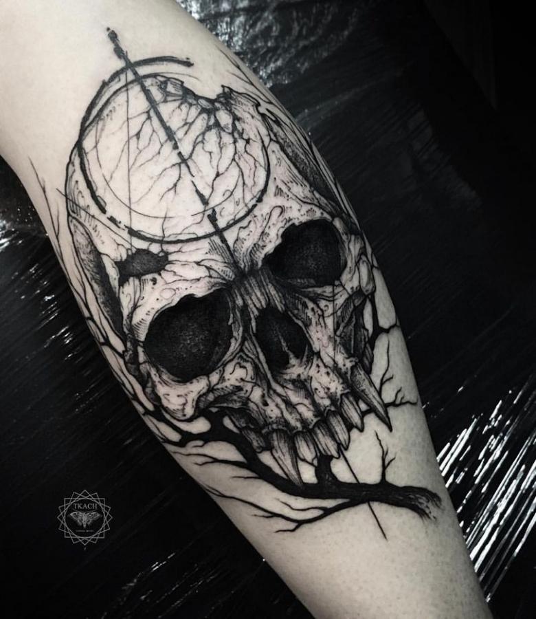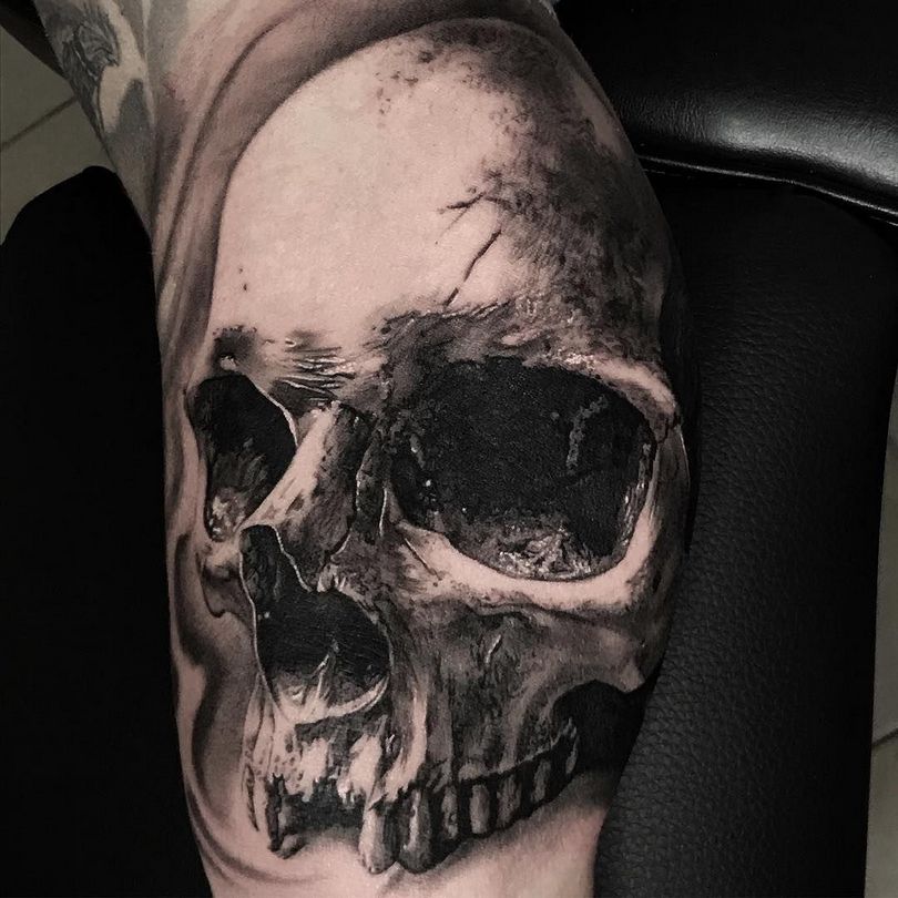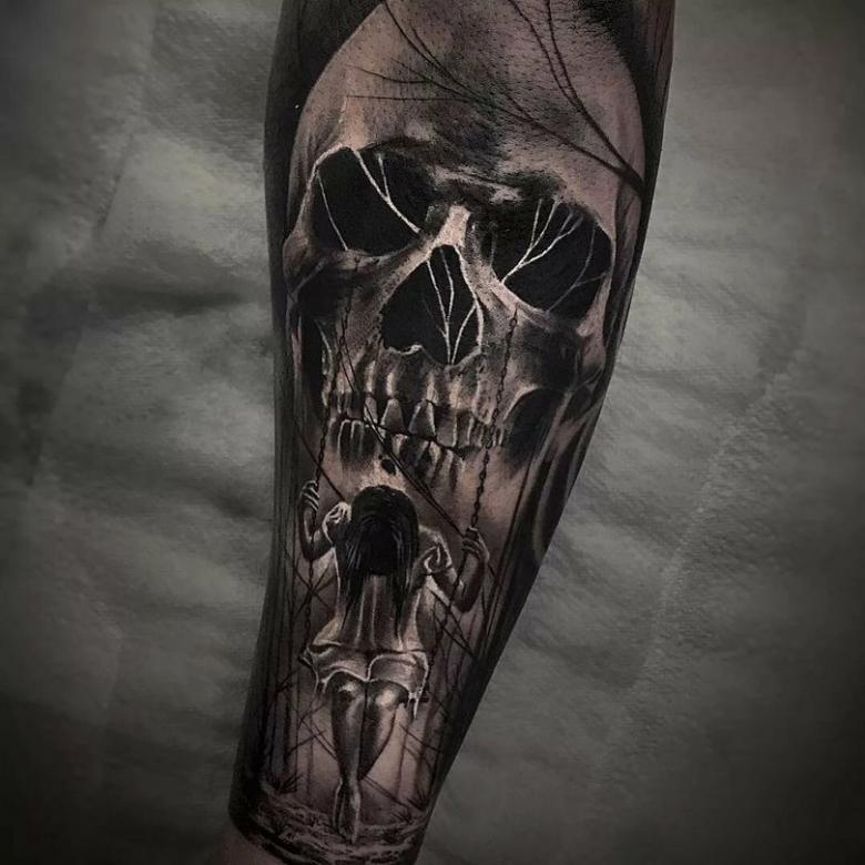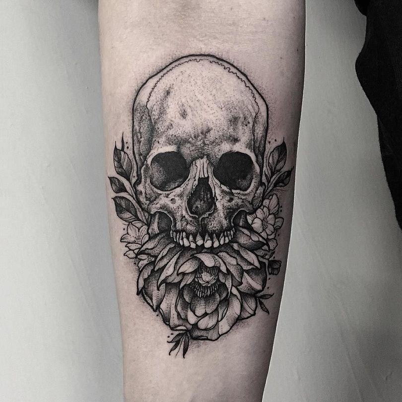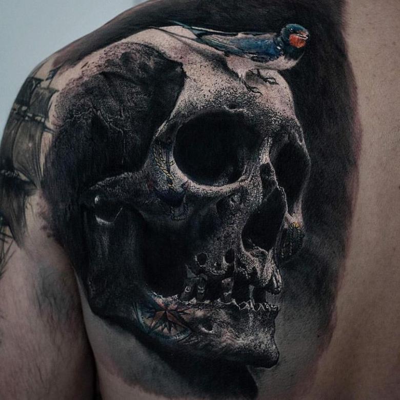 Un crâne est un élément intéressant et distinctif. Il peut être épinglé seul ou inséré dans une composition complexe. Le résultat est une image symbolique au sens profond, qui permet à la personne de révéler son caractère, de raconter sa vie, son destin et ses rêves.