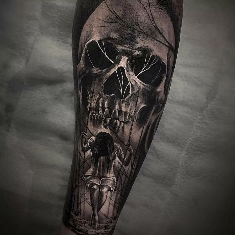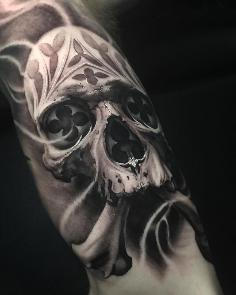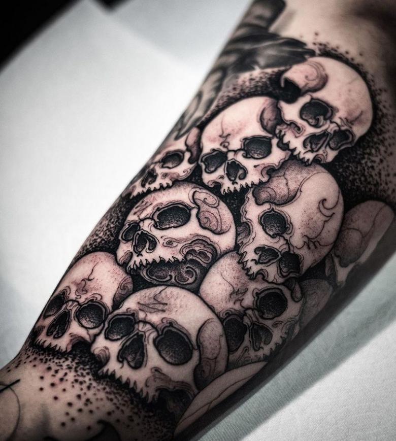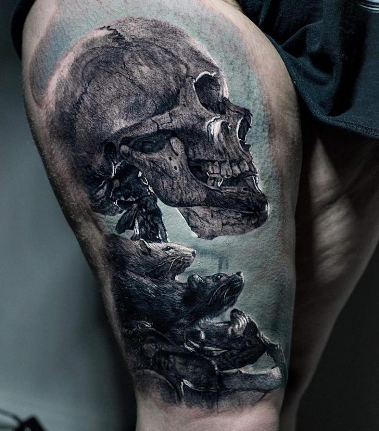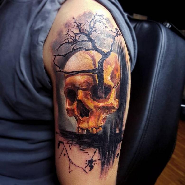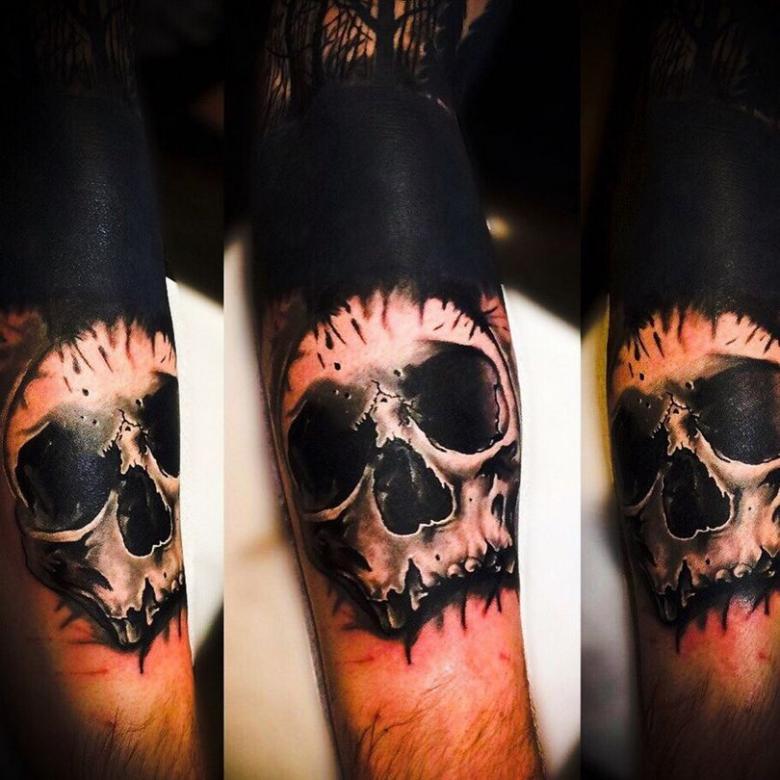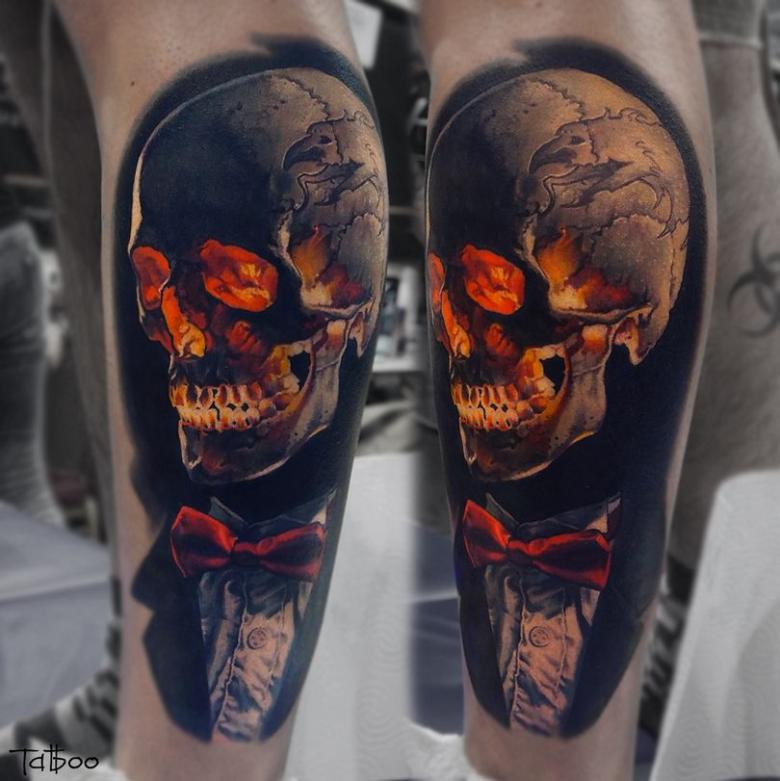 Un crâne est un élément intéressant et distinctif. Il peut être épinglé seul ou inséré dans une composition complexe. Le résultat est une image symbolique au sens profond, qui permet à la personne de révéler son caractère, de raconter sa vie, son destin et ses rêves.
