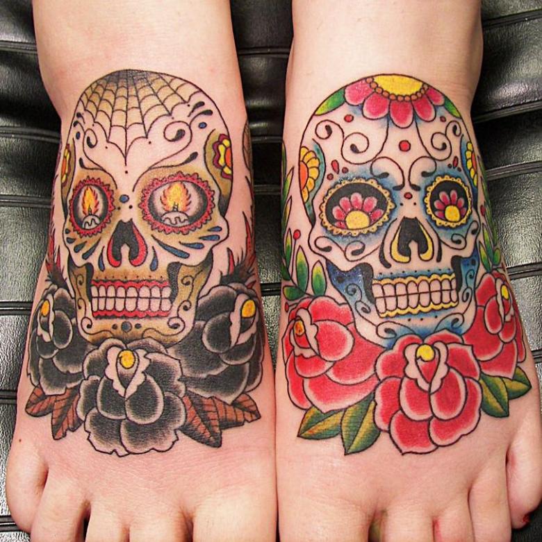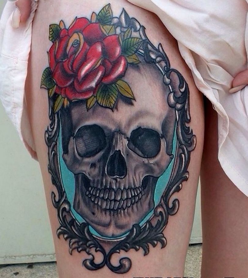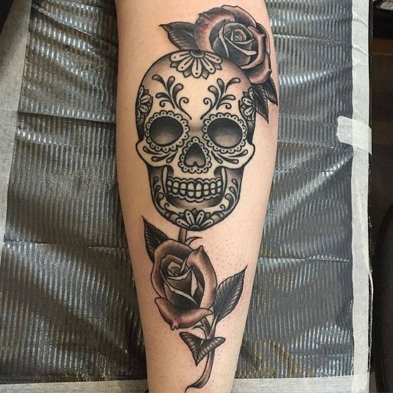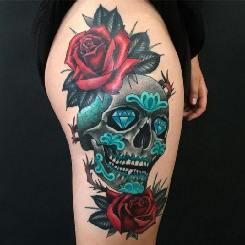 Pour une femme ou une fille, un tatouage est un bijou. Ils apprécient la beauté, l'originalité, l'élégance. Même si la base de la composition est un crâne, celui-ci est entouré de feuilles et de fleurs. Les autres éléments doivent symboliser la jeunesse, la vie éternelle, l'amour, la renaissance :