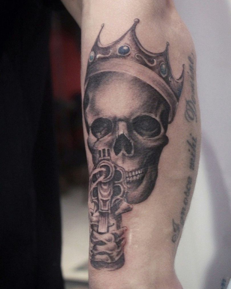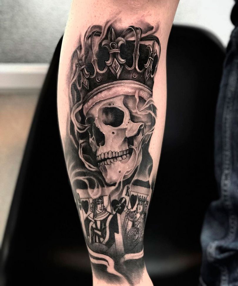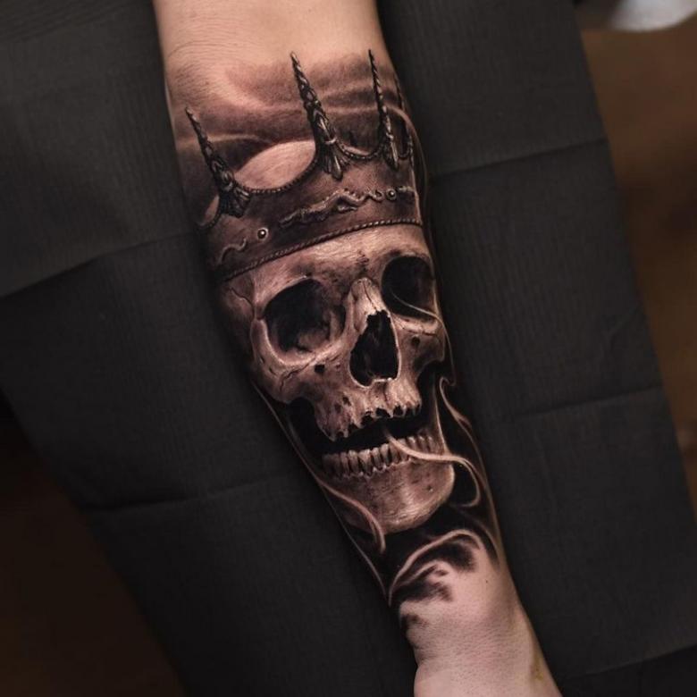 - Un crâne dans une couronne. Ce motif est considéré comme classique. Il est choisi par les hommes confiants et ambitieux pour signifier leurs objectifs. Mais la couronne n'est pas seulement un symbole de pouvoir. Il est associé à une grande connaissance, à la sagesse et à l'expérience de la vie.