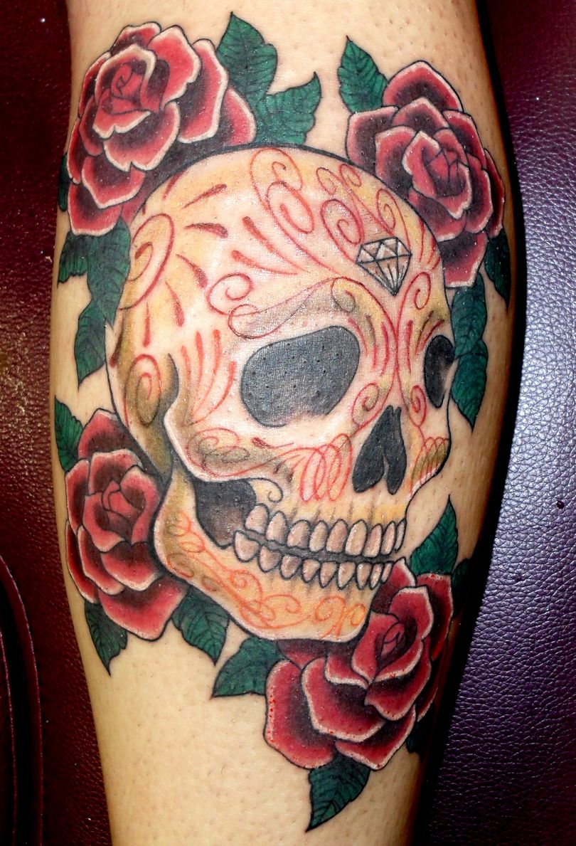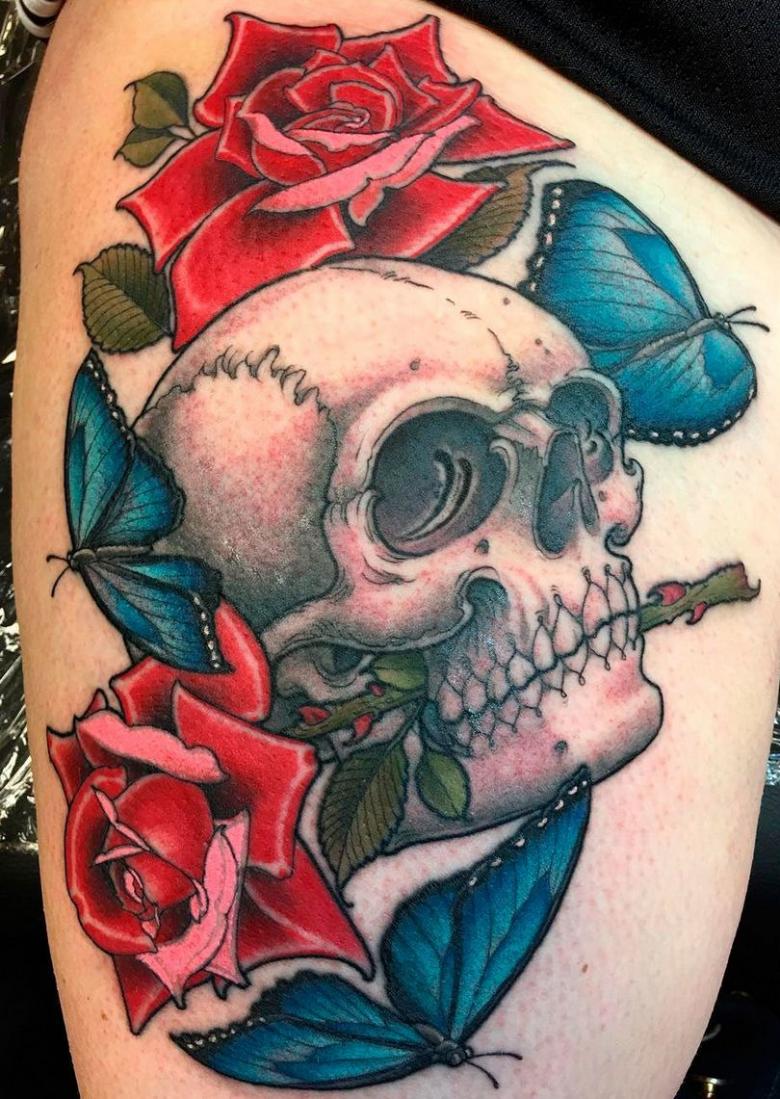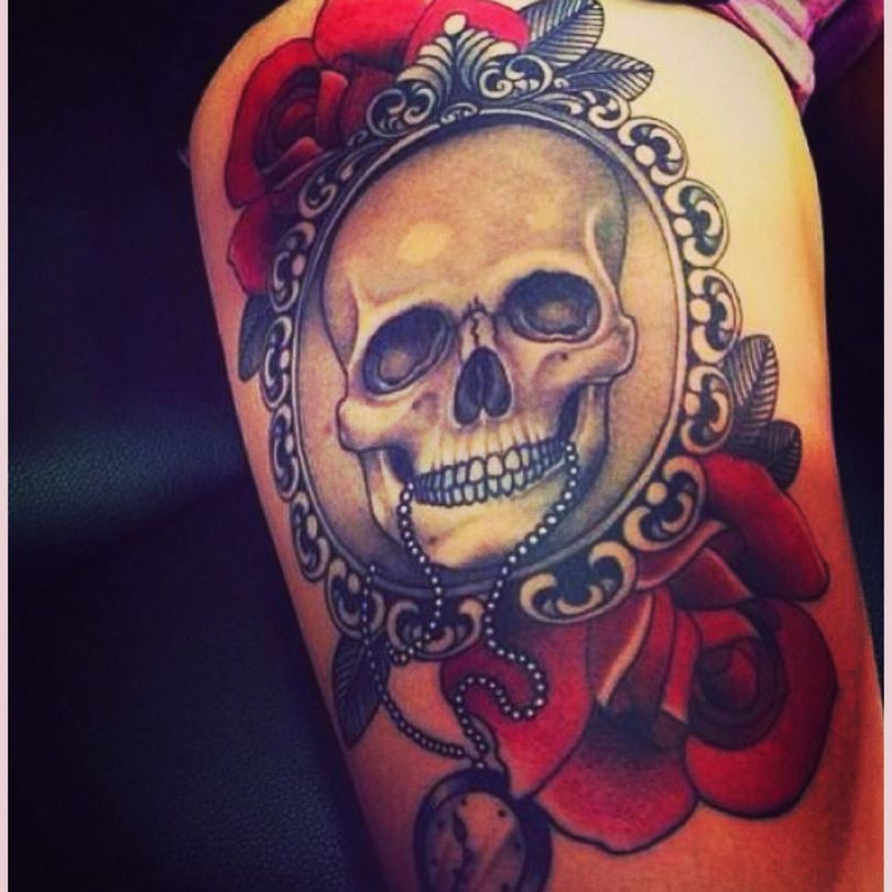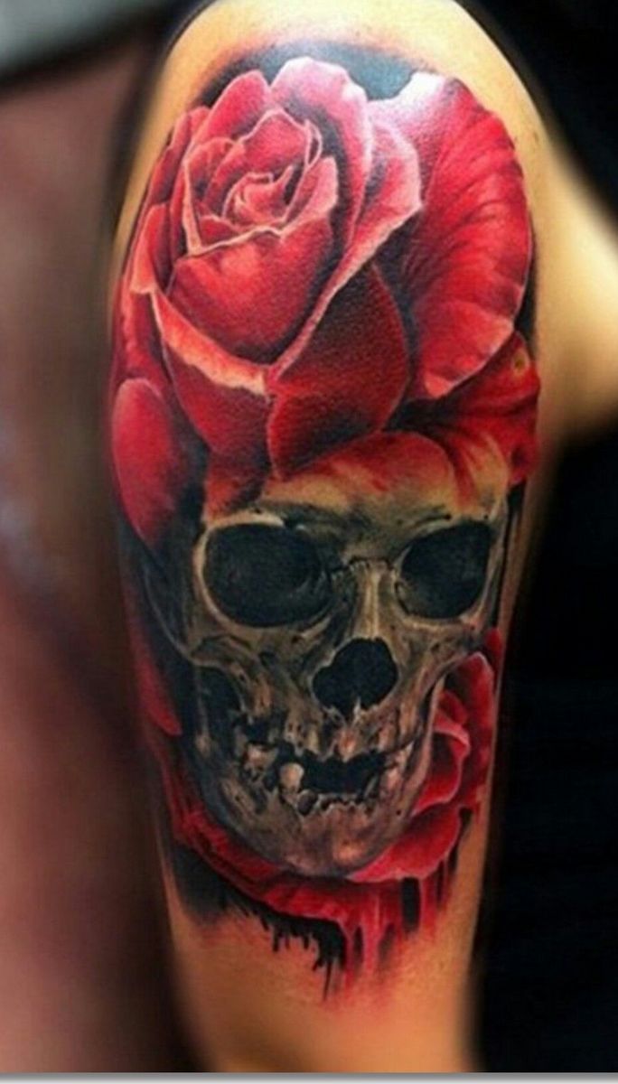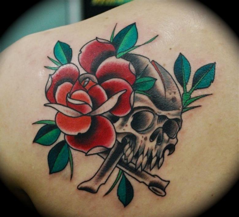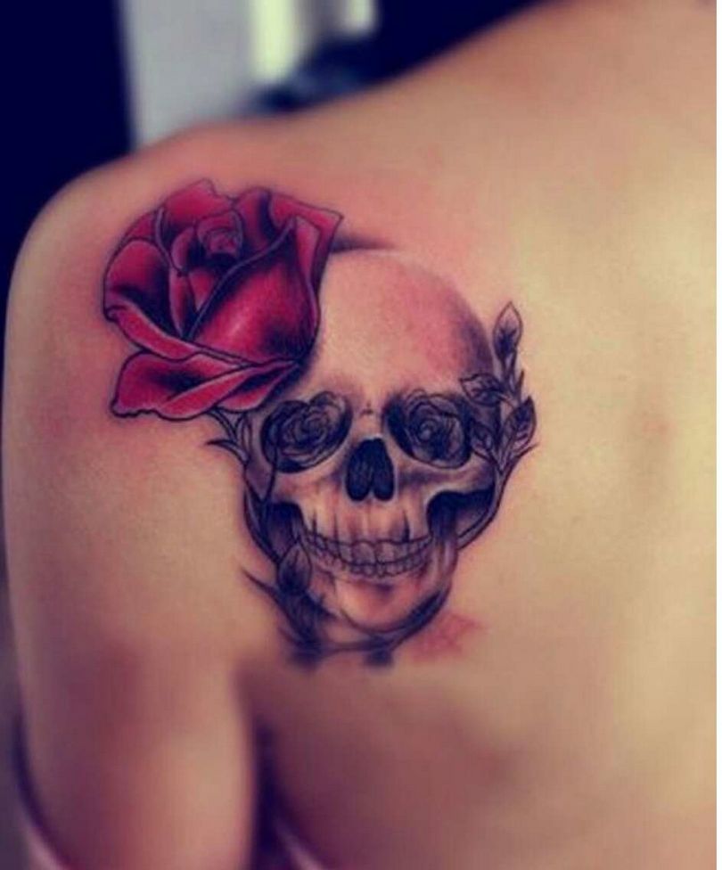 - Crâne et rose. C'est assez courant. Peut signifier "amour jusqu'à la tombe", mais montre le plus souvent que le sentiment est très étroitement associé à la mort. Porte généralement le souvenir d'un événement ou d'une expérience personnelle, d'un deuil.