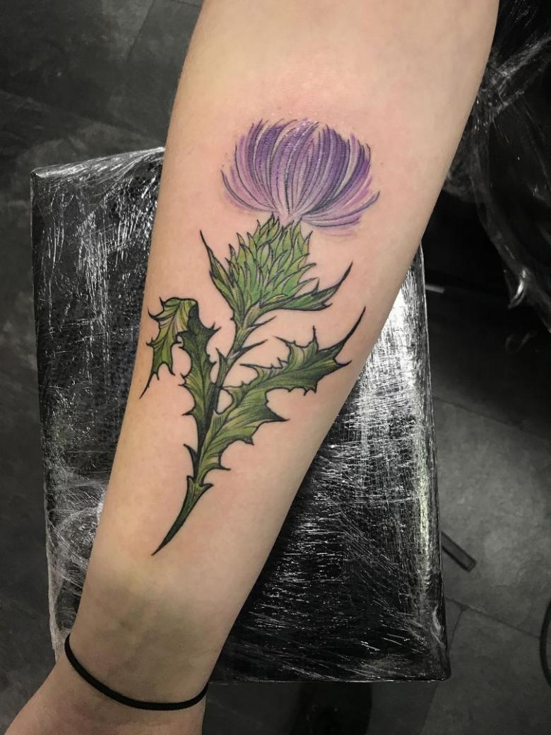 Le tatouage de chardon est beau et sophistiqué dans les versions monochromes et colorées. La combinaison de pétales violets et de verdure, de lignes épurées et d'une silhouette sévère est visuellement très réussie.