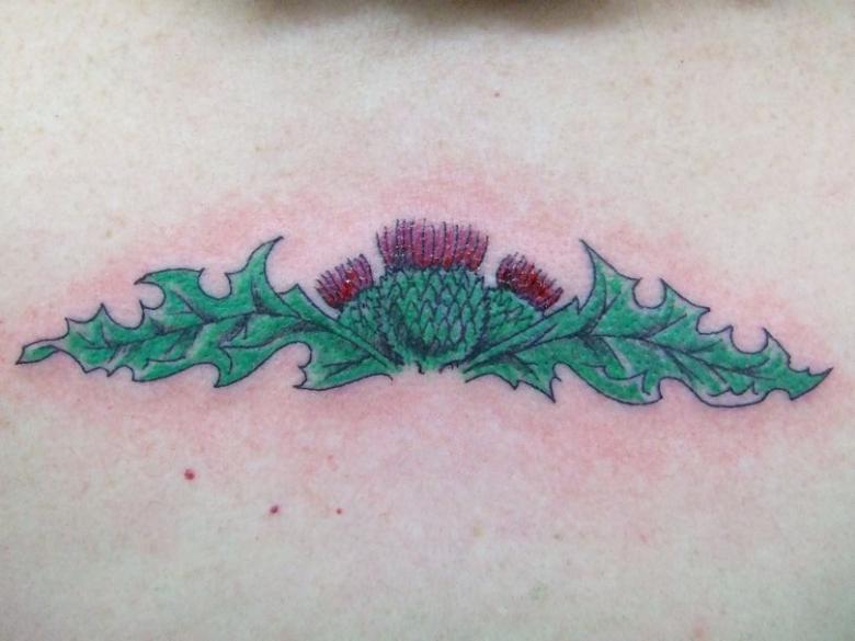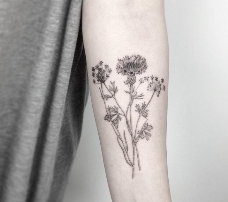 Les dames et les messieurs portent l'image de la fleur. Les femmes aiment combiner le tatouage de chardon avec des détails - croix, rubans, abeilles, papillons, roses, qui ont aussi des épines. Le chardon est un compagnon et un protecteur de la délicate rose. Par ce biais, les filles veulent souligner qu'elles sont fortes d'esprit, qu'elles ont besoin d'une approche spéciale et qu'elles ont également de nombreux secrets et un caractère compliqué.