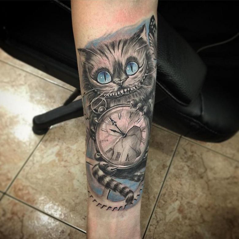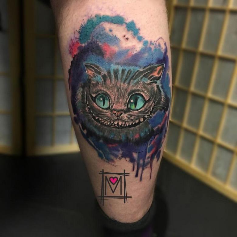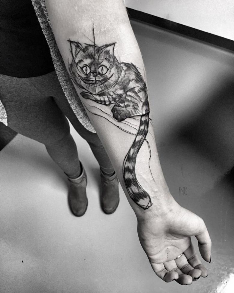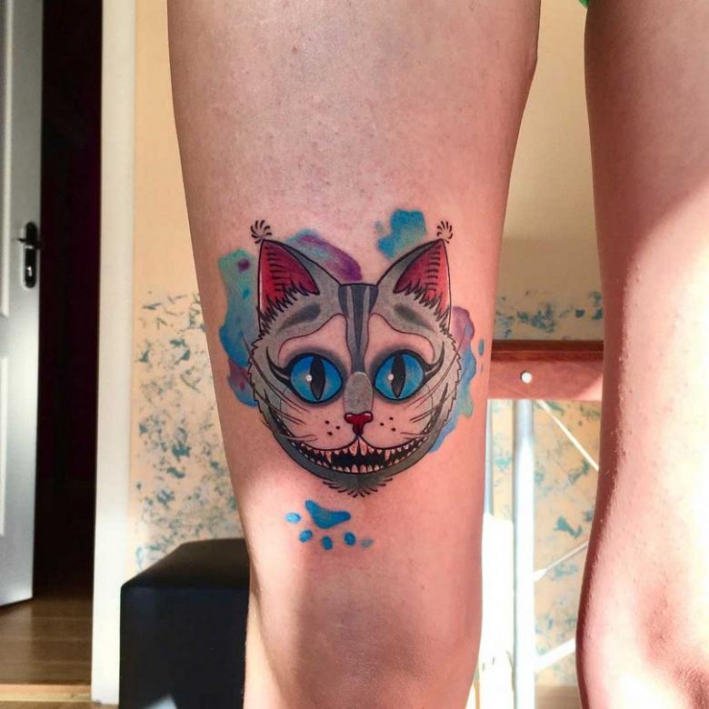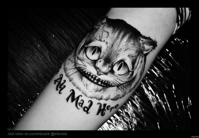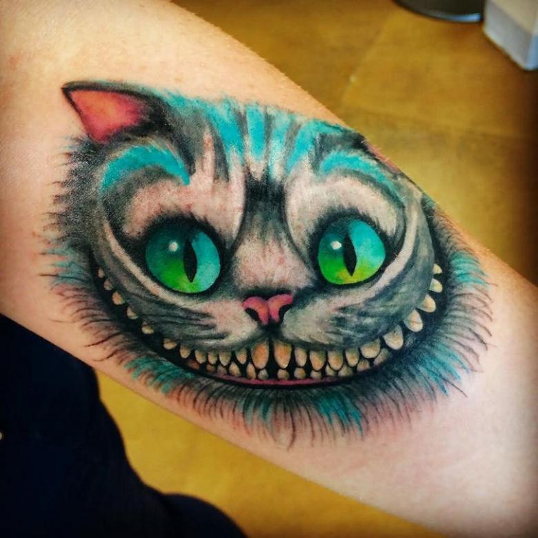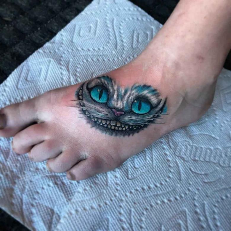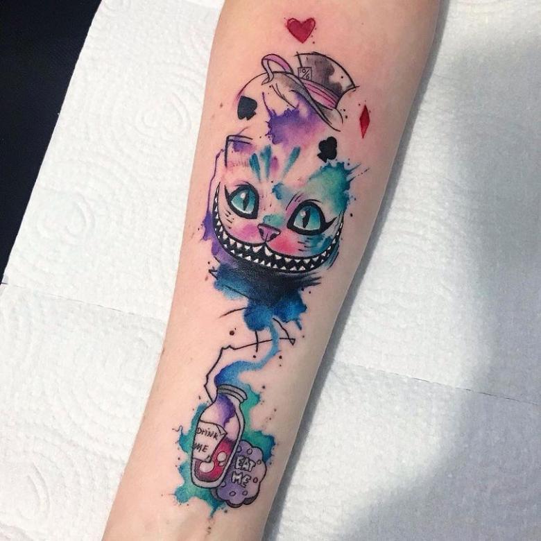 Tatouage chat du Cheshire - design et signification du tatouage pour les filles et les hommes, où l'appliquer (sur le bras, le poignet, le pied), photos