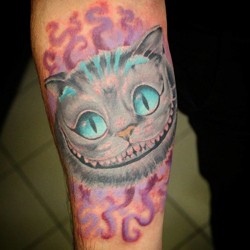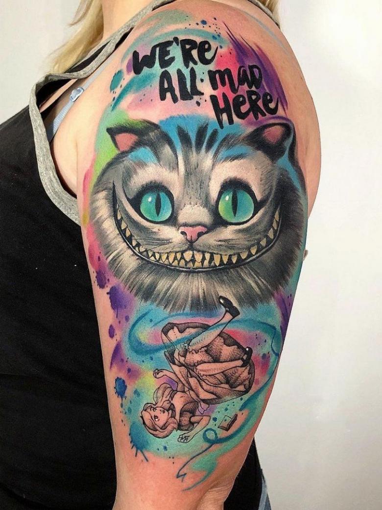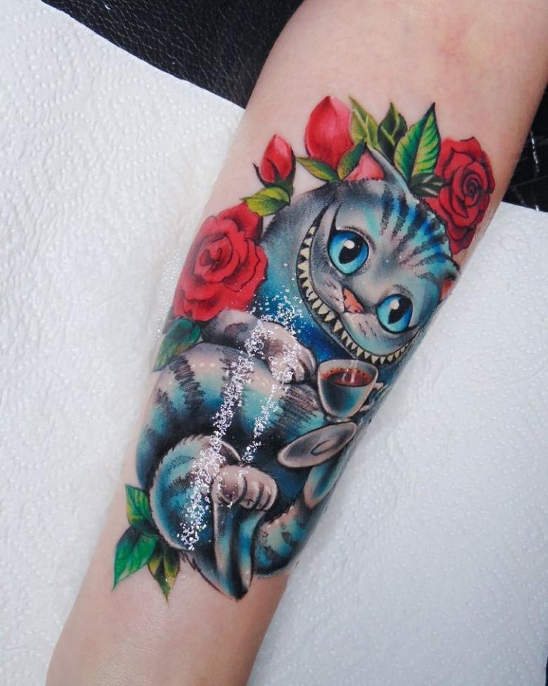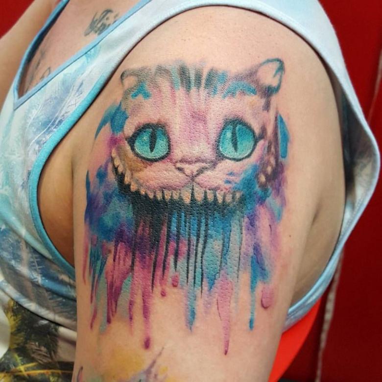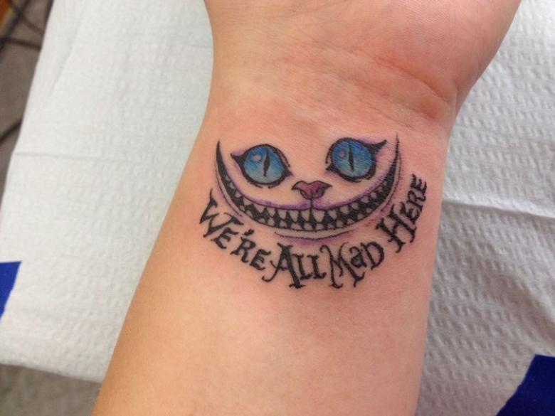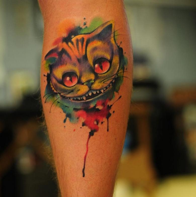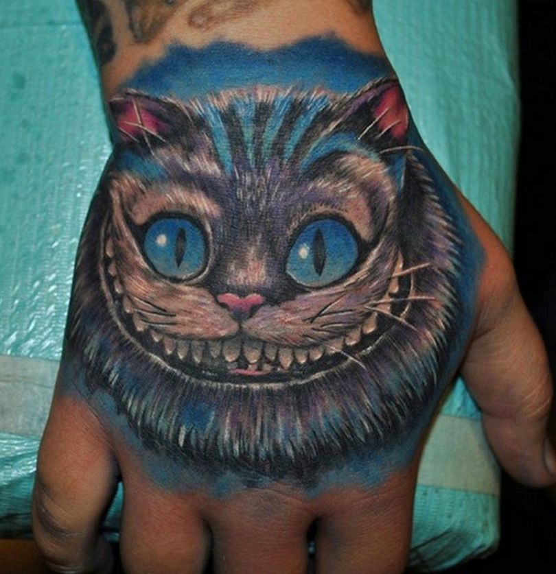 Tatouage chat du Cheshire - design et signification du tatouage pour les filles et les hommes, où l'appliquer (sur le bras, le poignet, le pied), photos