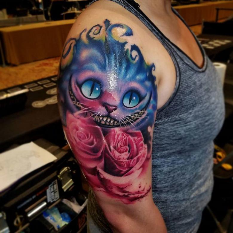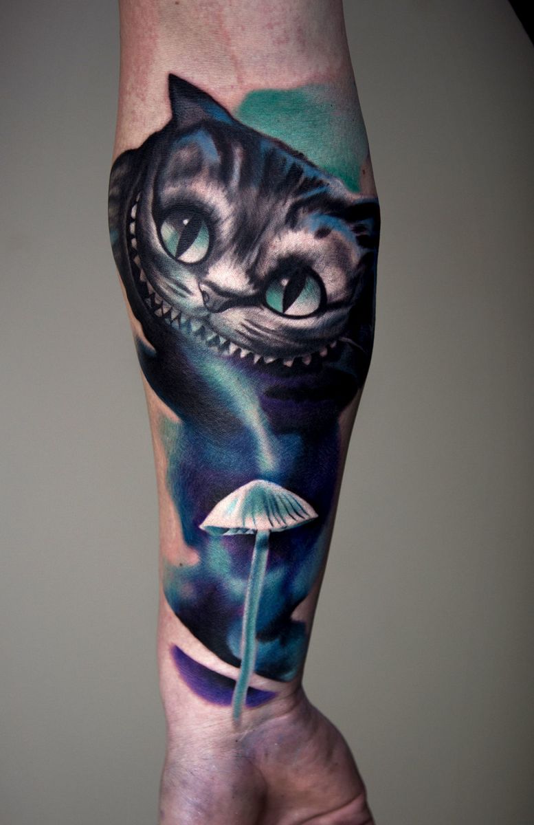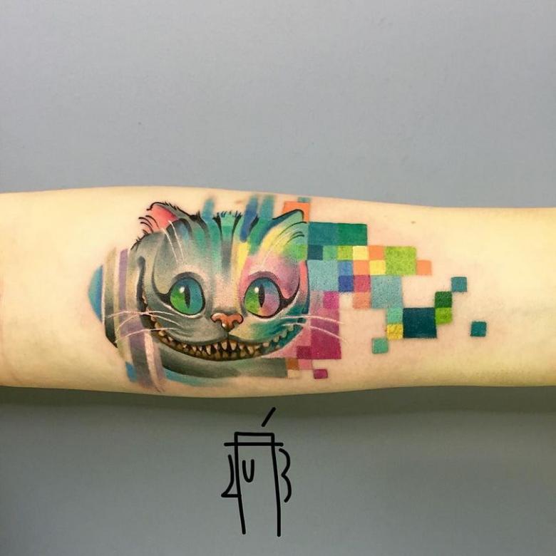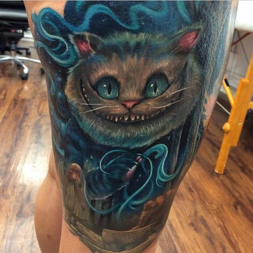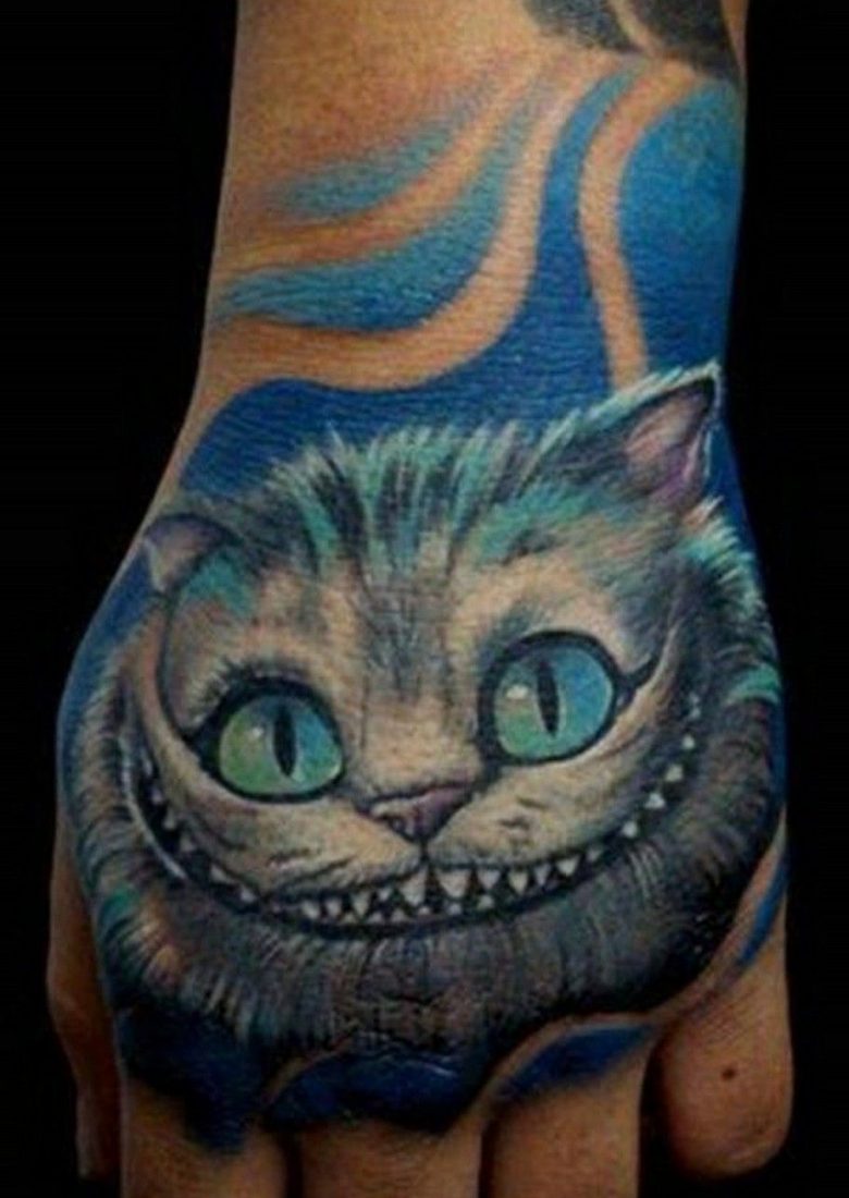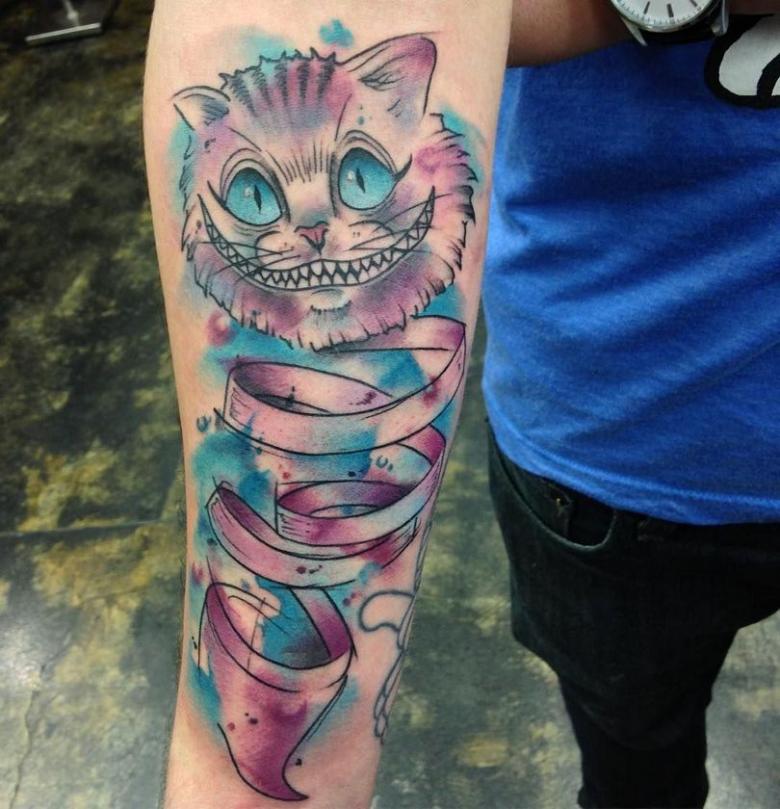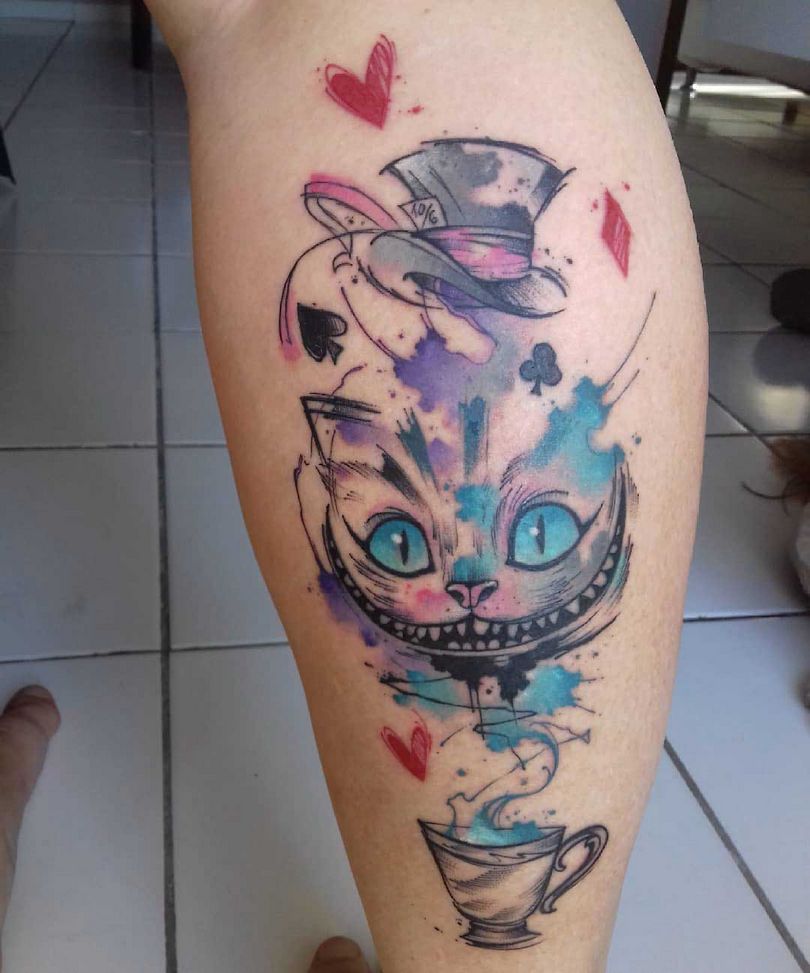 Tatouage chat du Cheshire - design et signification du tatouage pour les filles et les hommes, où l'appliquer (sur le bras, le poignet, le pied), photos