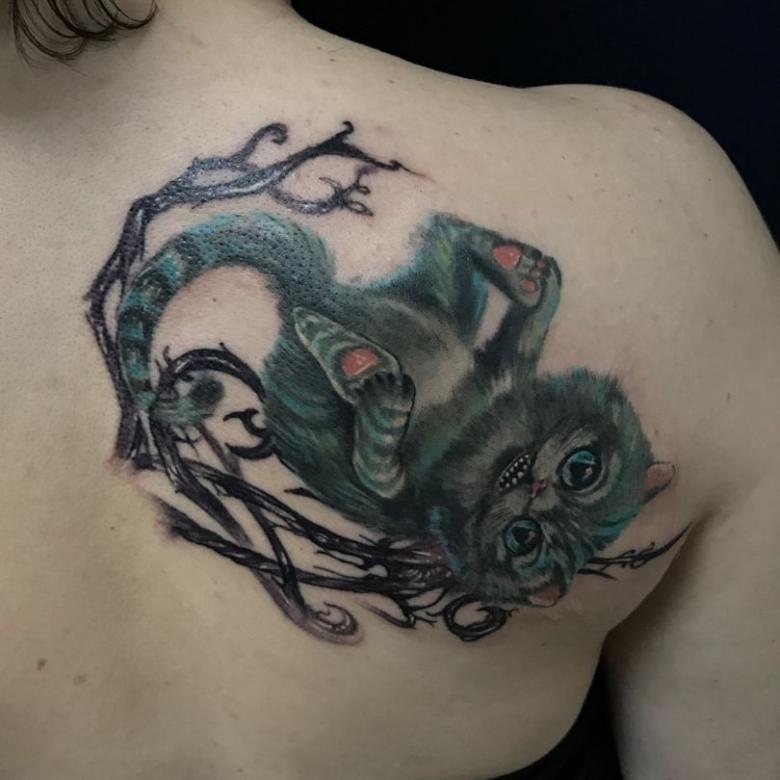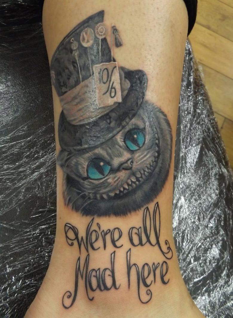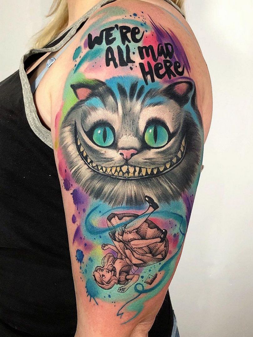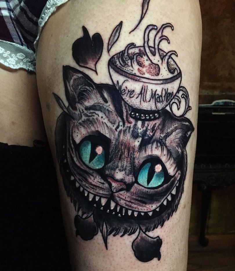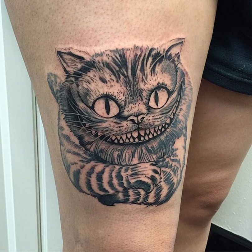 L'image du Cheshire est souvent placée dans la catégorie des tatouages représentant des chats. Généralement positif, le Chat du Cheshire est ambigu et controversé. Le portrait de ce chat sur le corps du porteur porte une signification profonde. Les personnes ayant l'image d'un chat de Cheshire sont spéciales ! Comme il l'a dit lui-même : "Je ne suis pas fou, c'est juste que ma réalité est différente de la vôtre".