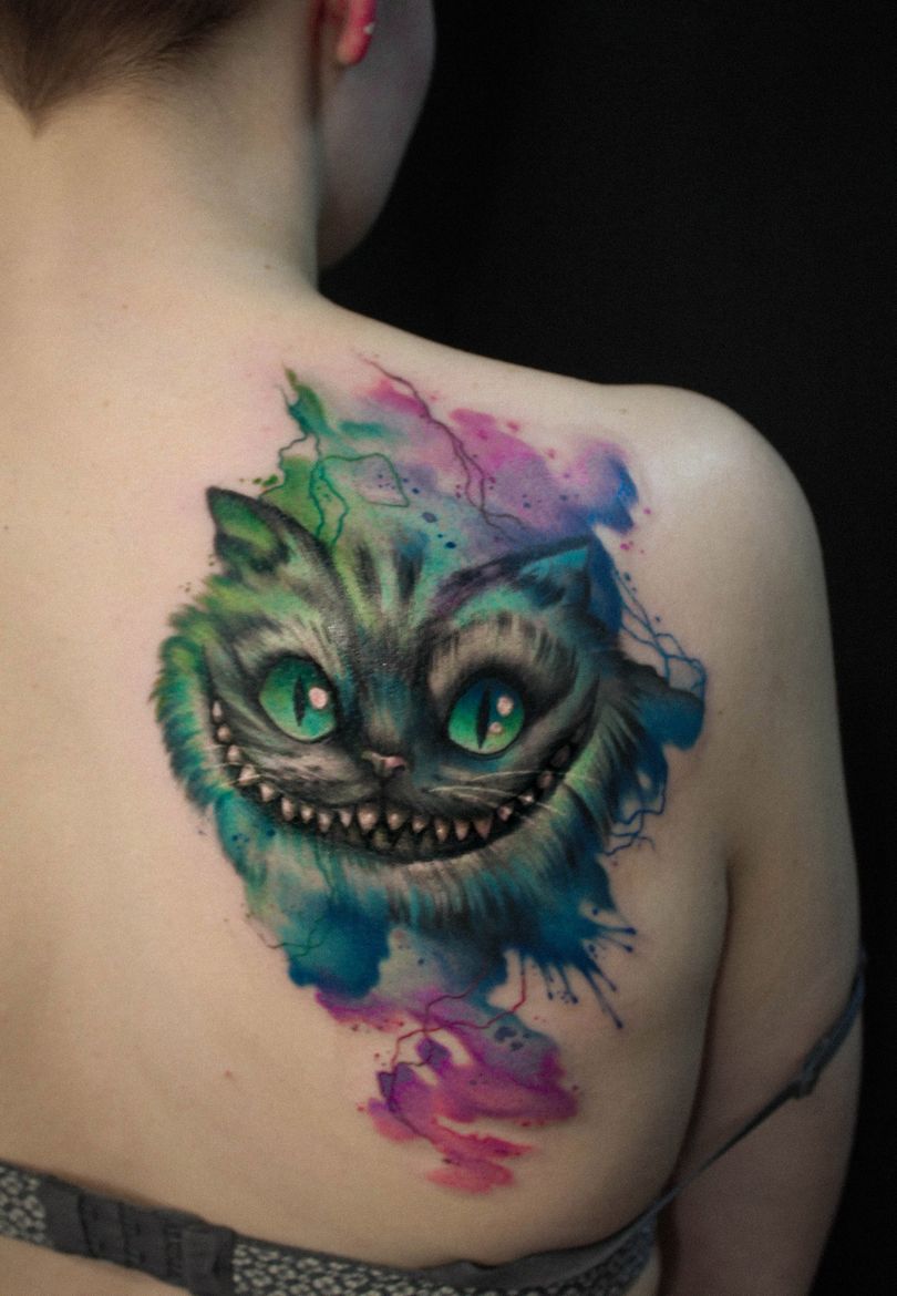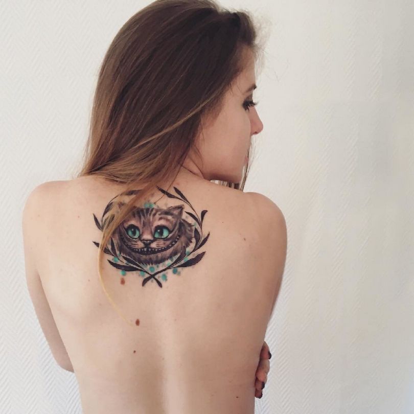 Les personnes d'âge moyen choisissent assez souvent ce tatouage comme symbole d'une approche optimiste de la vie - ce tatouage donne une attitude positive en toute chose et aide à gagner la confiance que tous les problèmes seront résolus en toute sécurité. Vous pouvez appliquer ce motif n'importe où - le sourire caractéristique du chat du Cheshire sera organique sur l'épaule, le bras, le côté, la cuisse.