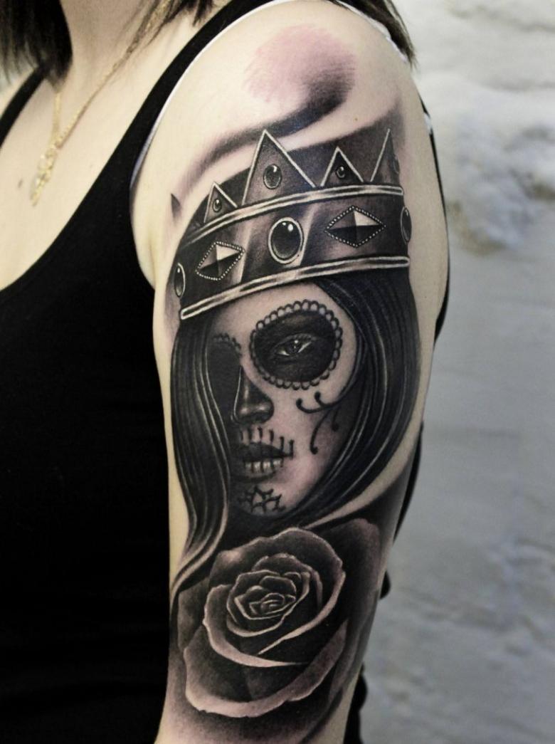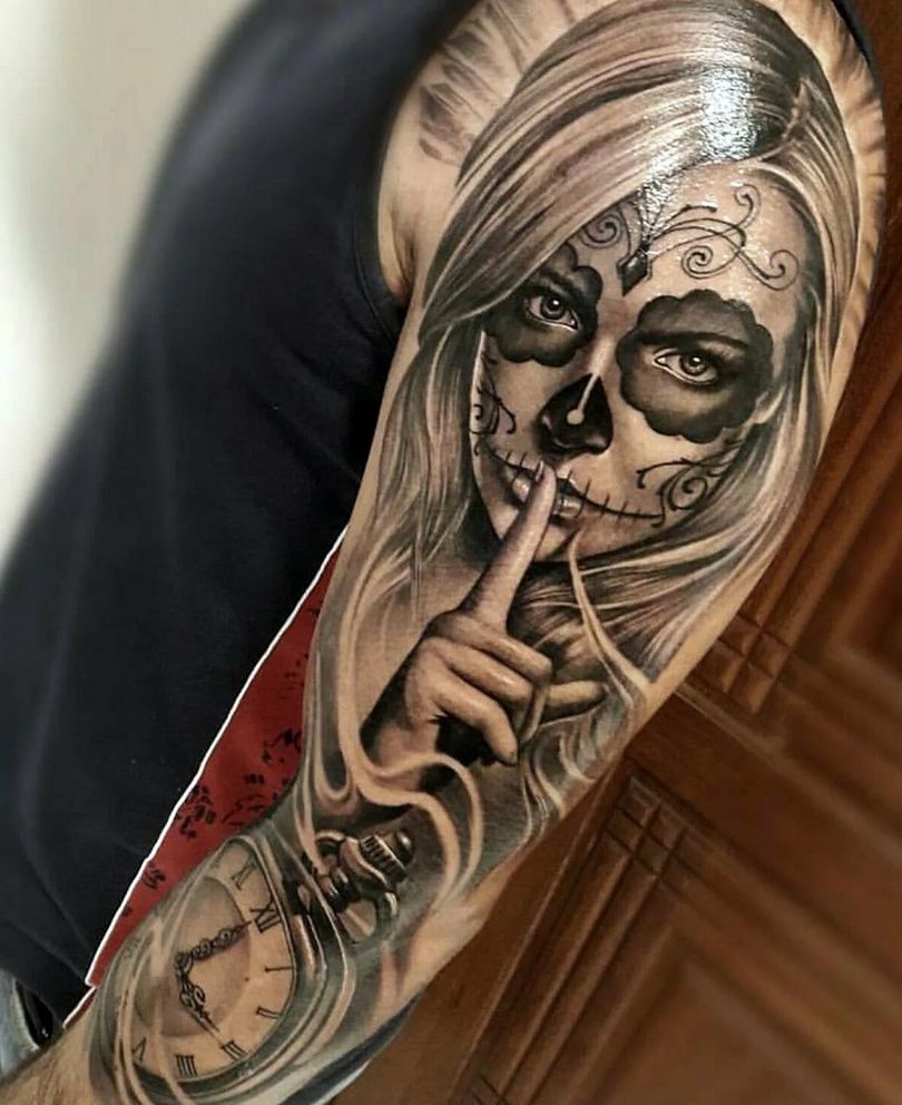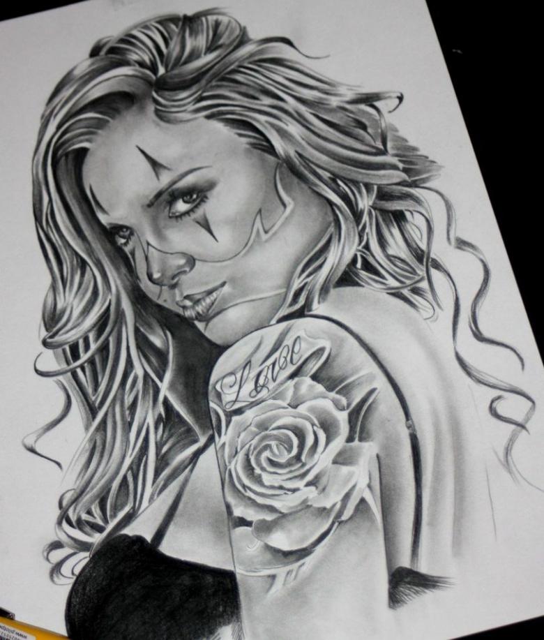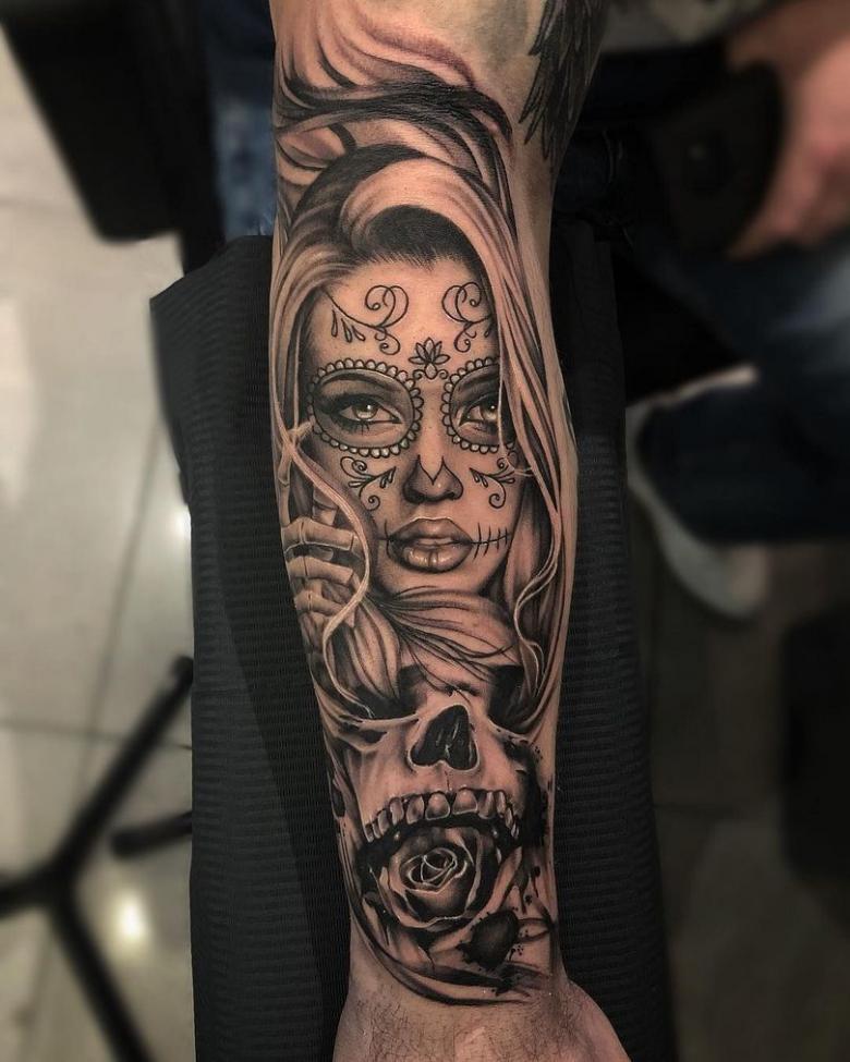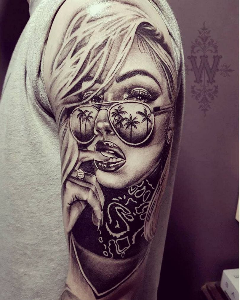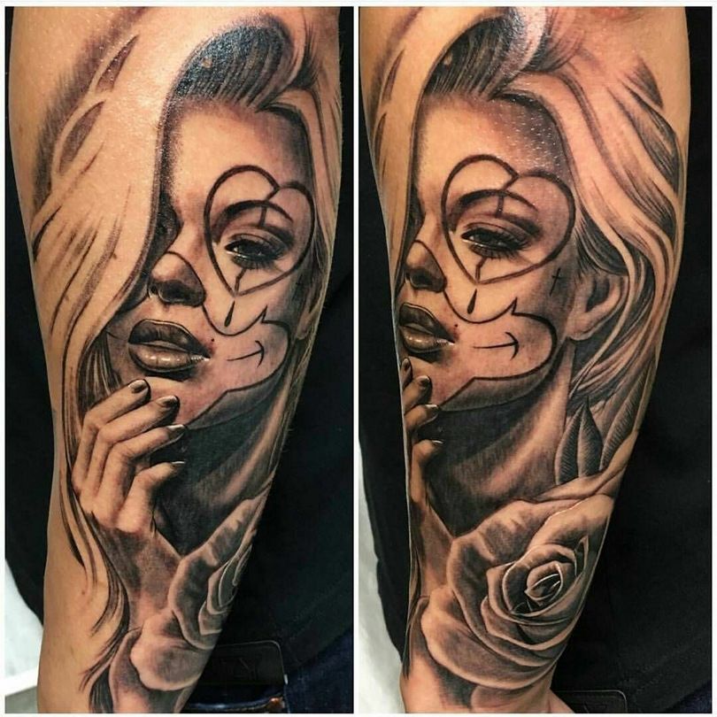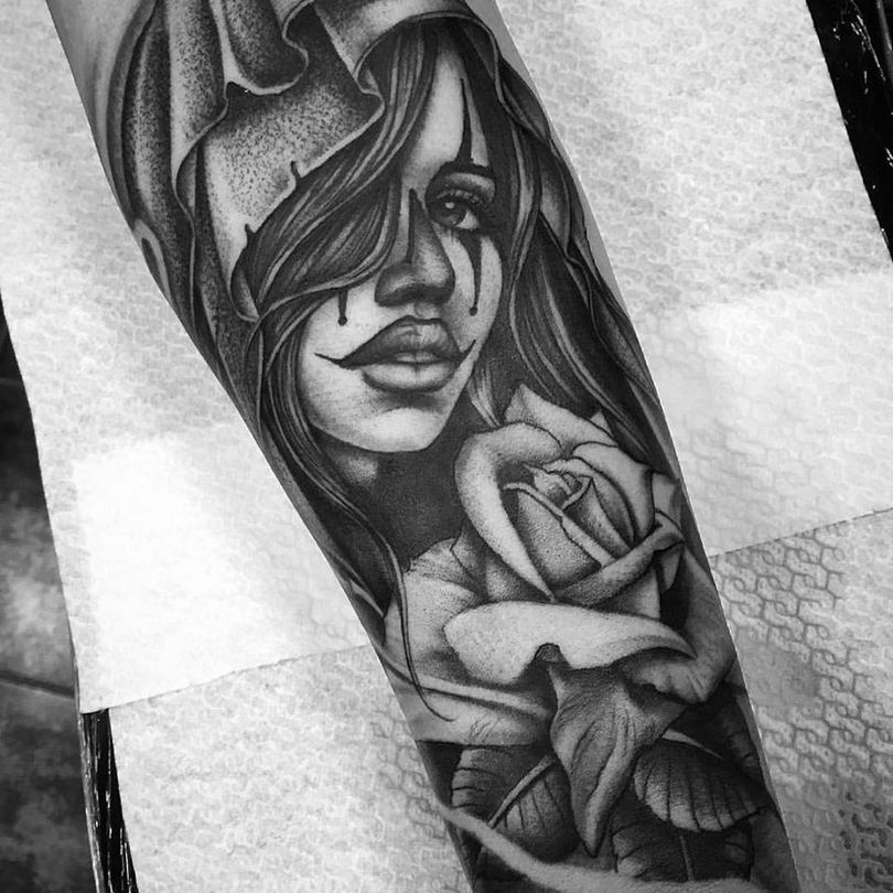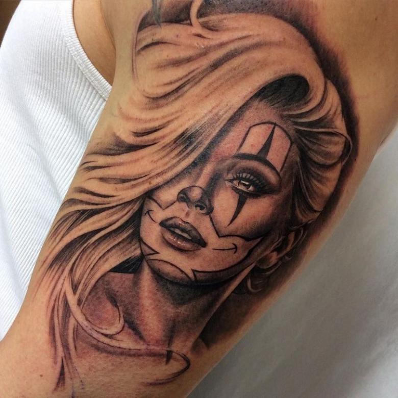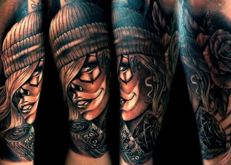 Tattoo Chicano - une description du style pour hommes et femmes, le lieu d'application (épaule, avant-bras, manche, sur le bras), les croquis originaux et des exemples de photos