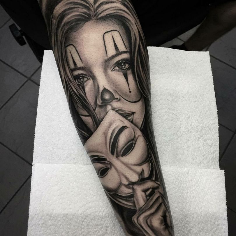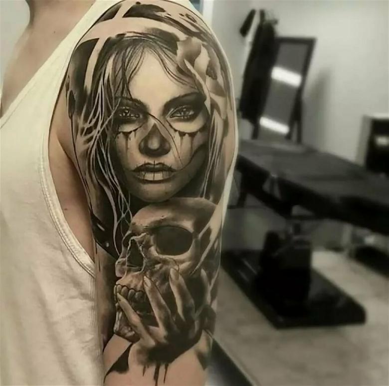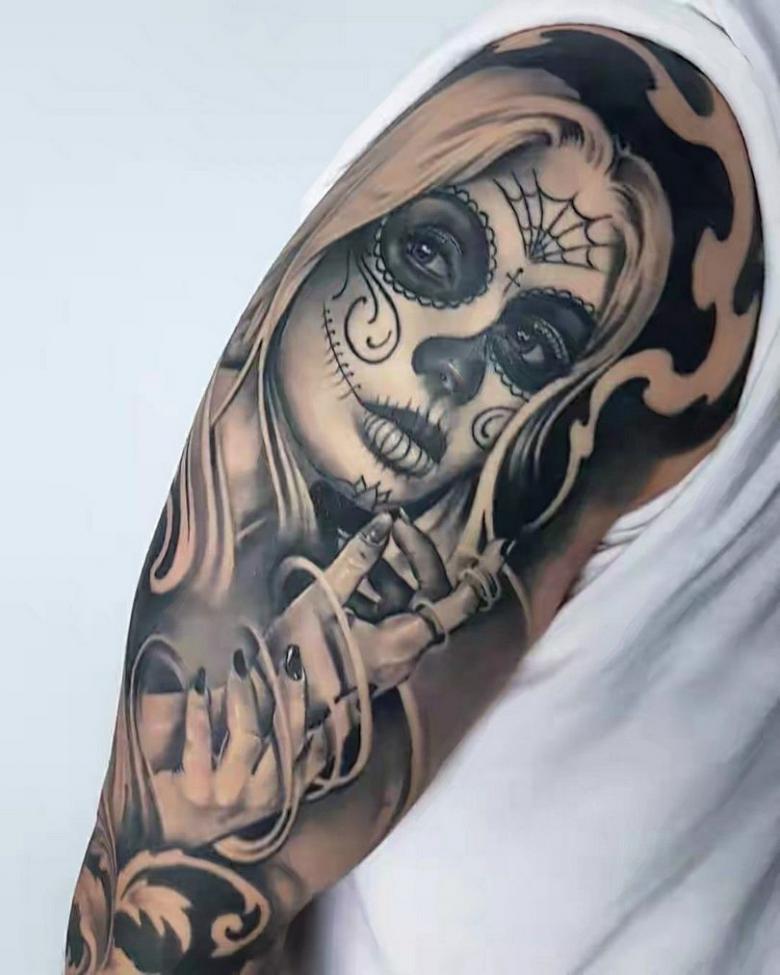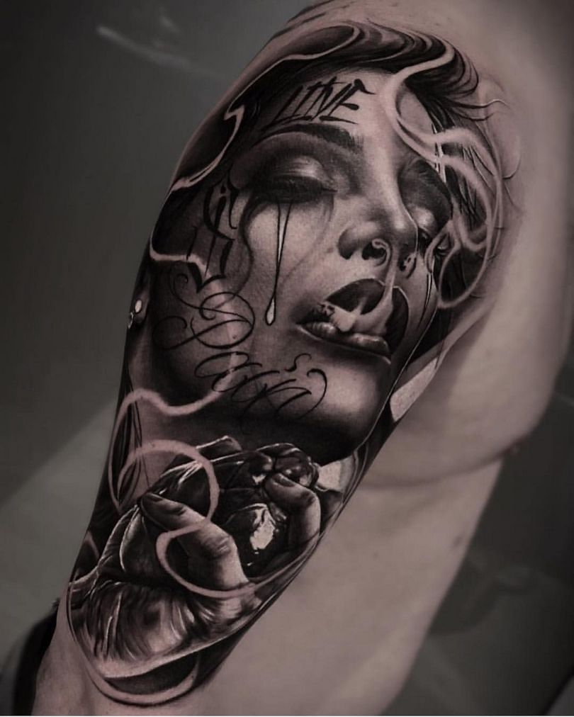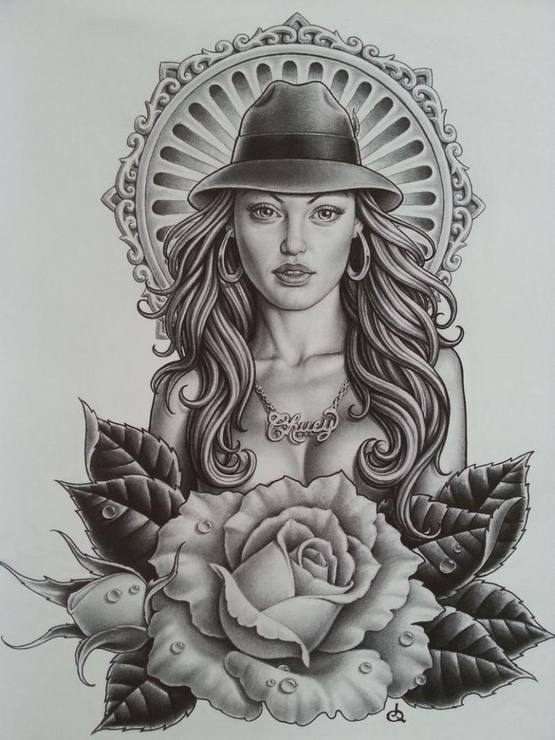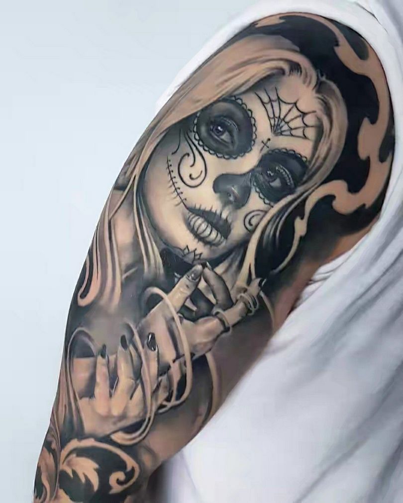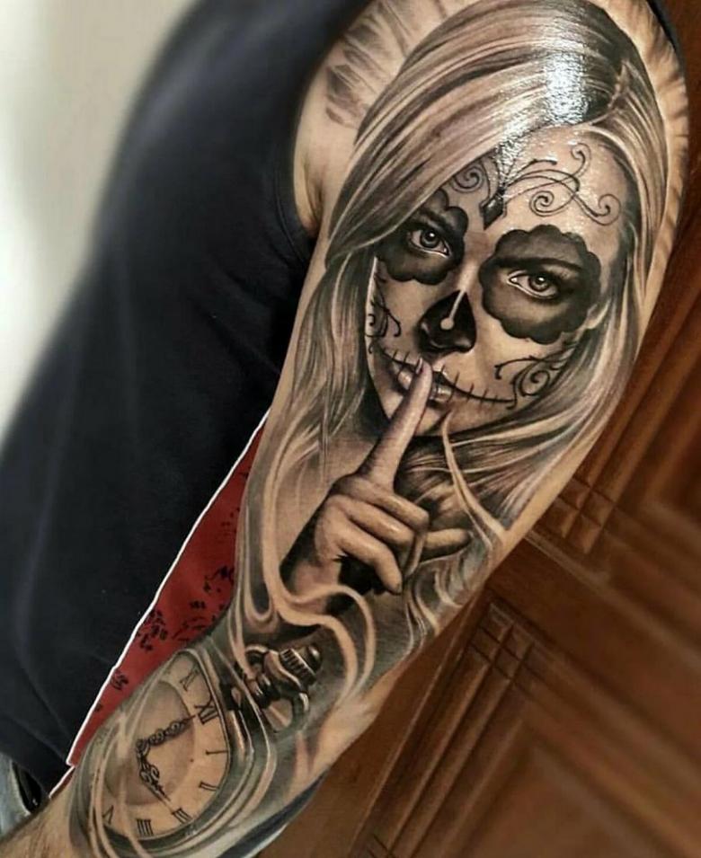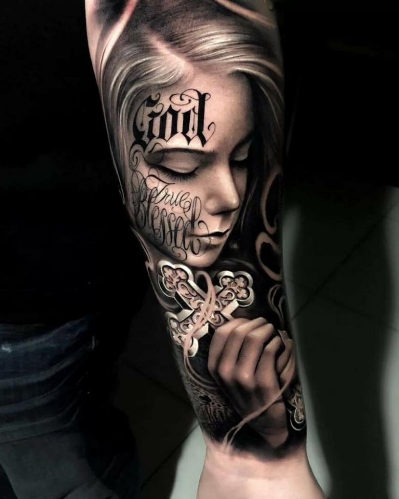 Tattoo Chicano - une description du style pour hommes et femmes, le lieu d'application (épaule, avant-bras, manche, sur le bras), les croquis originaux et des exemples de photos