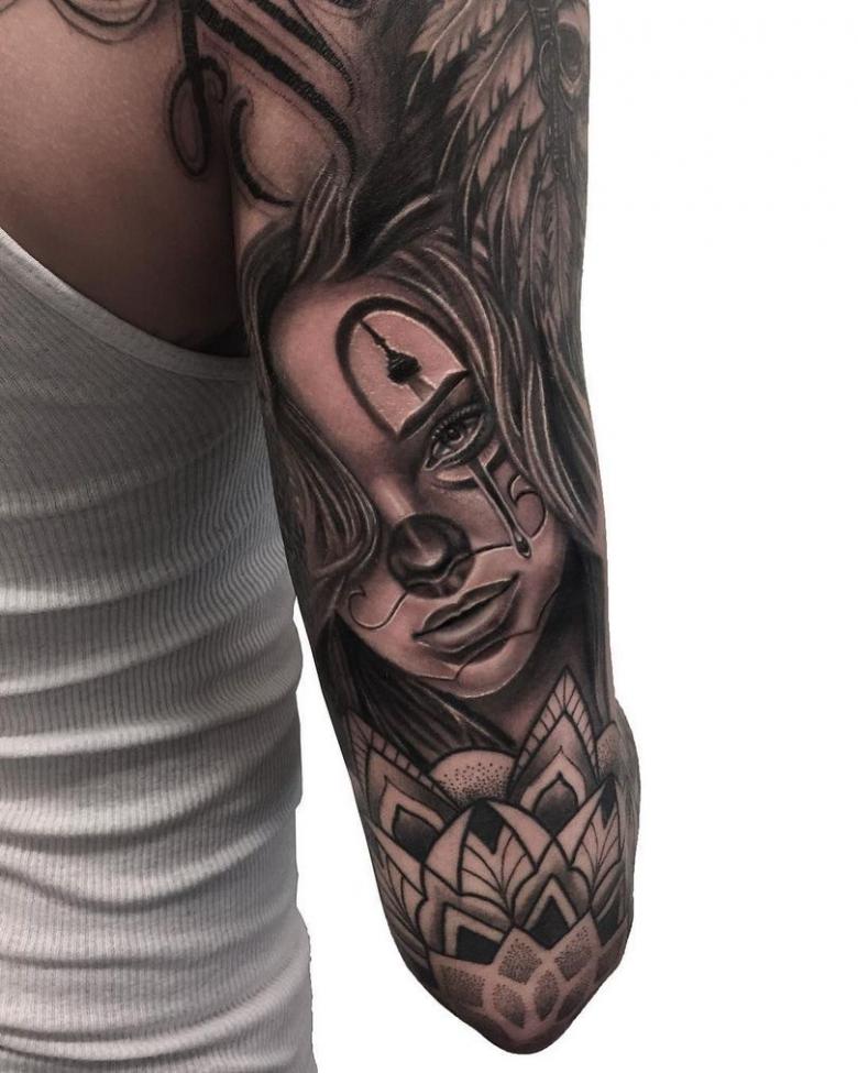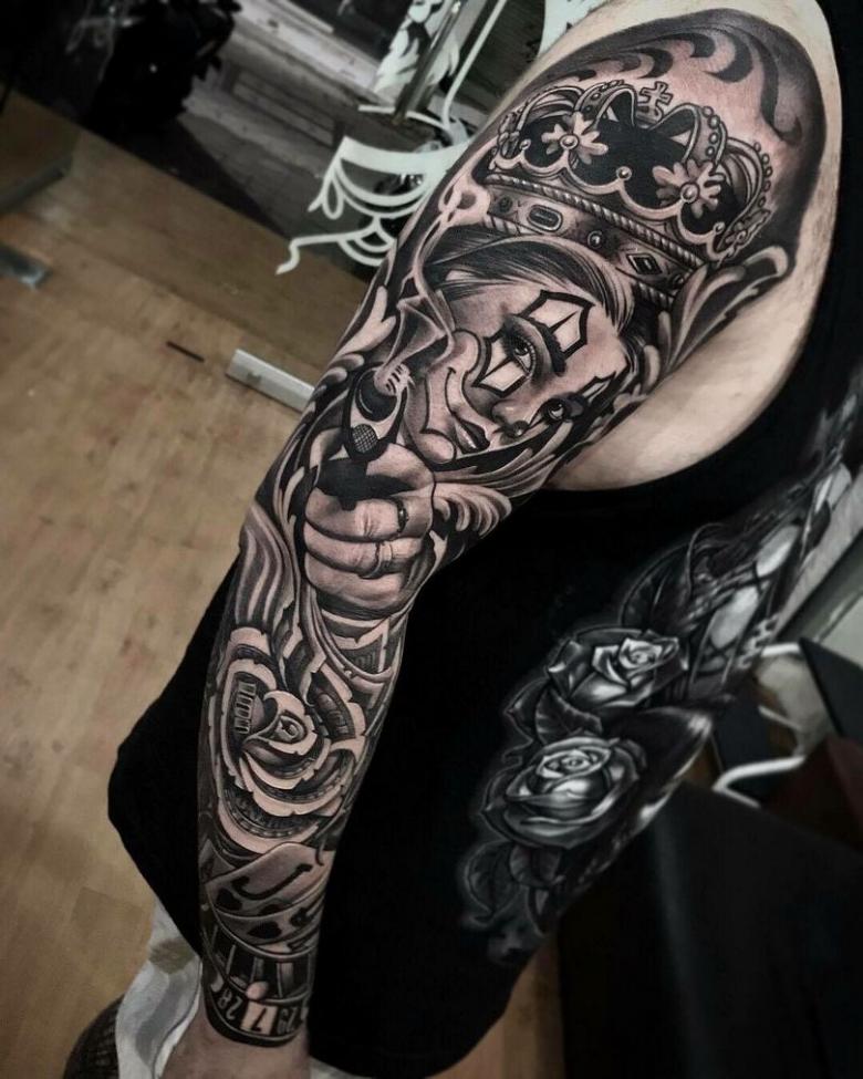 La version "manche" du tatouage chikano est un motif populaire de nos jours. L'image épaisse et saturée capture toute la surface du bras, de l'épaule au poignet. Il est très beau et convaincant, comme en témoignent de nombreuses photos.