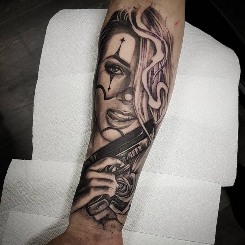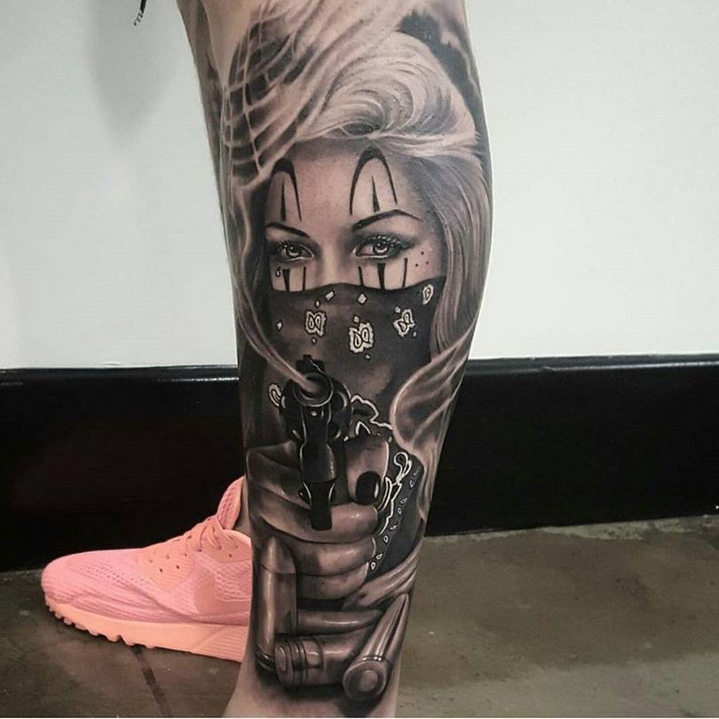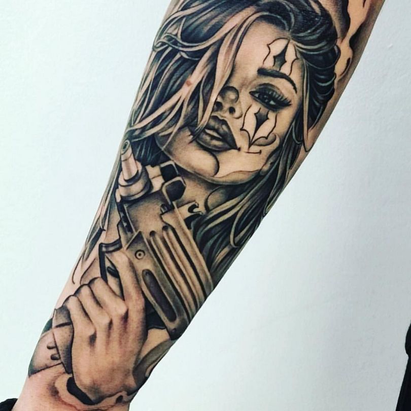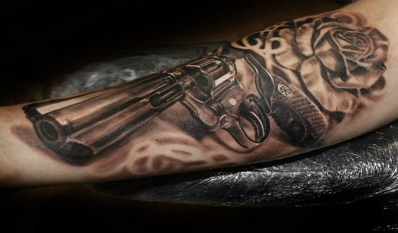 - Les armes sont une caractéristique essentielle de tout membre de gang hispanique. Les tatouages avec des armes à feu sont un hommage à la tradition, l'expression d'une attitude particulière envers la vie.