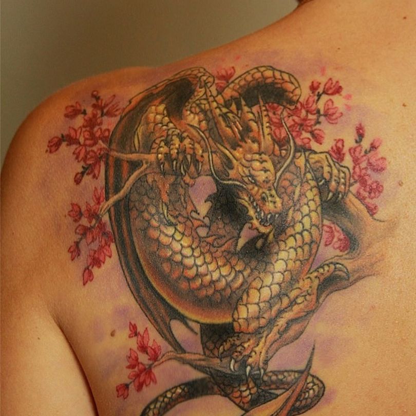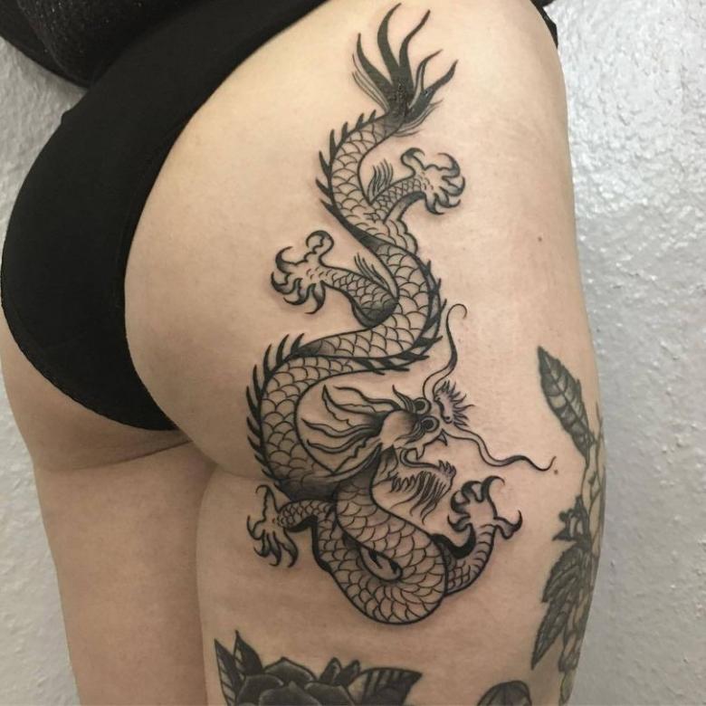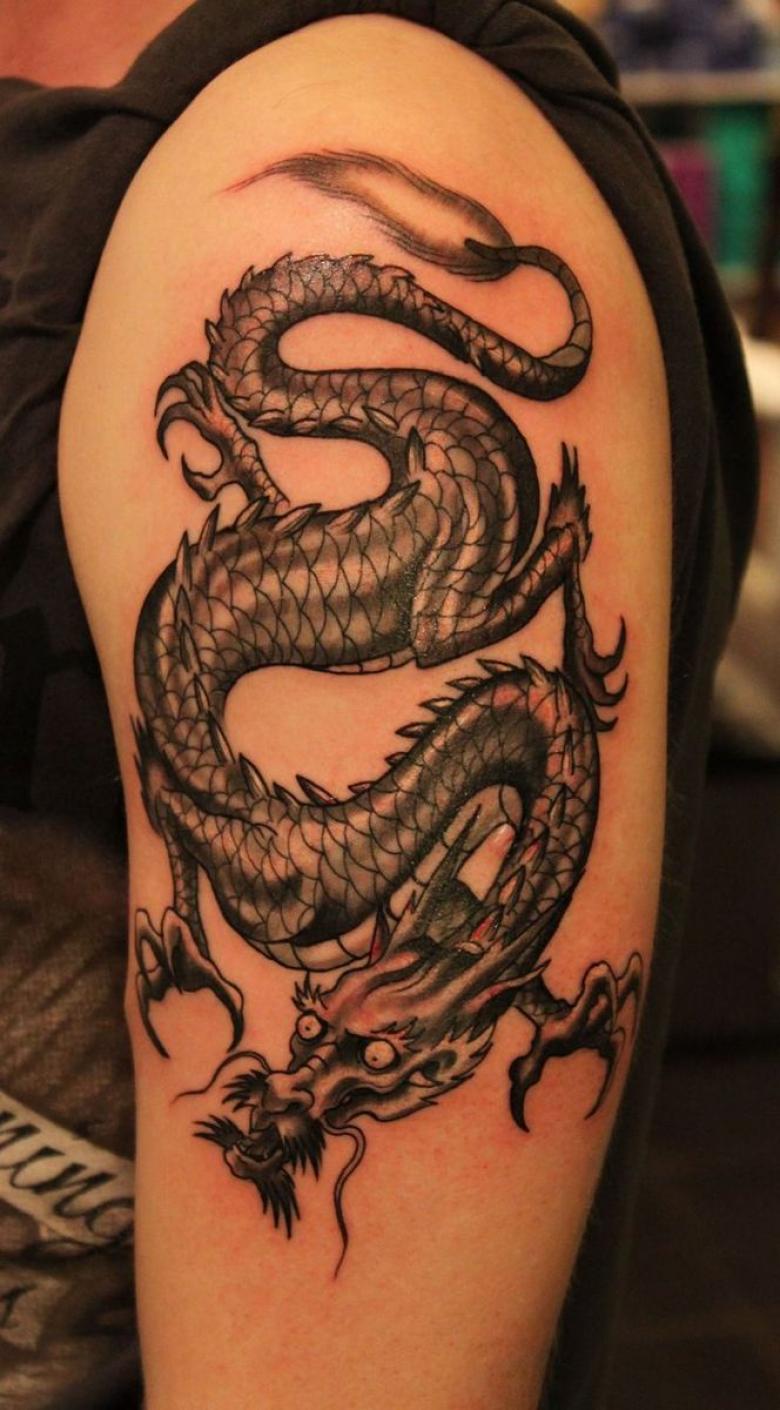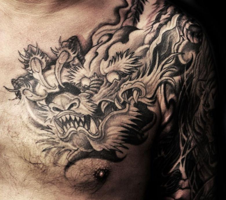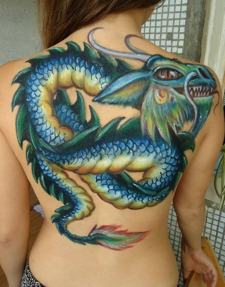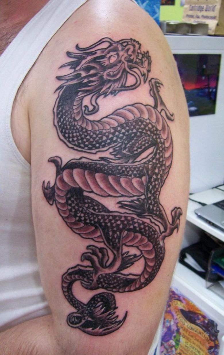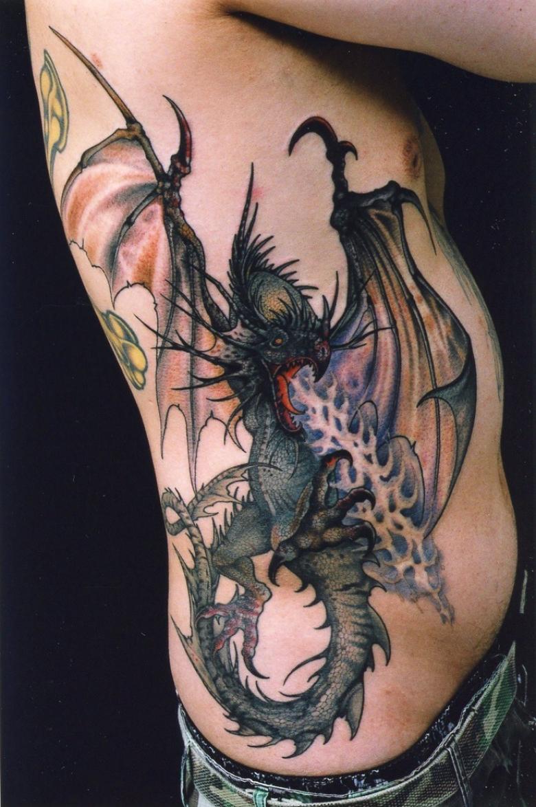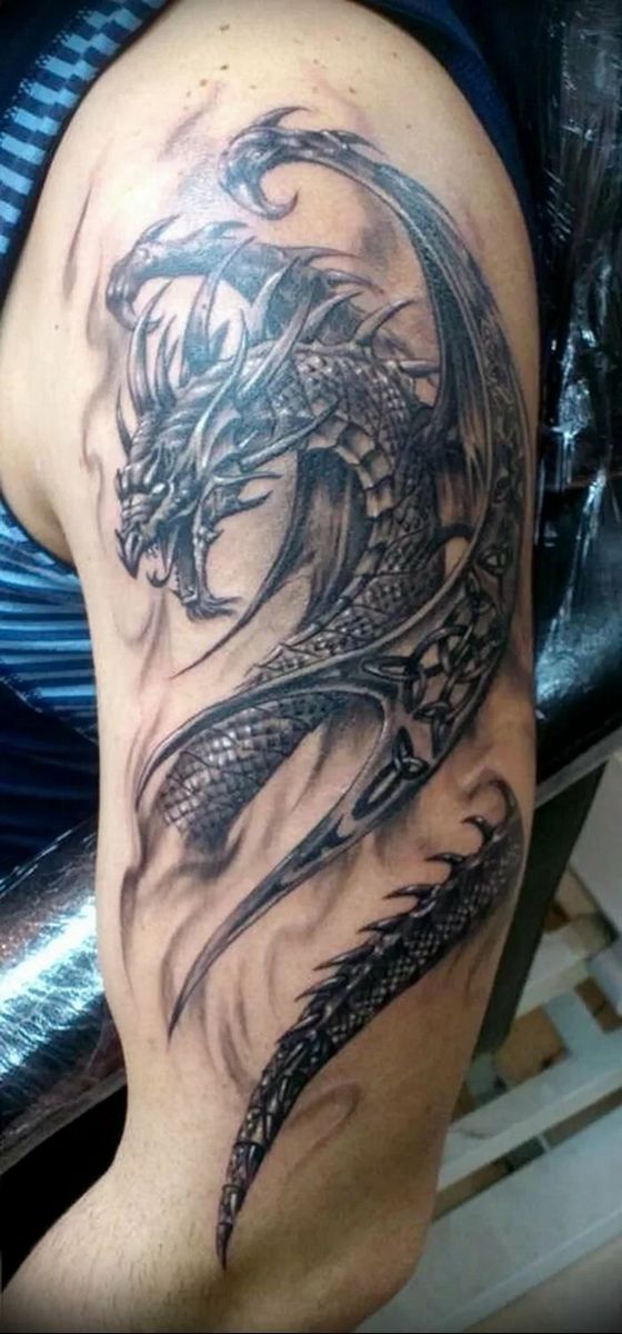 Un puissant lézard ailé en tout temps était populaire comme motif pour un tatouage. Souvent agressif et menaçant, le dragon sur le corps d'un guerrier était destiné à intimider l'ennemi. Dans le monde d'aujourd'hui, les tatouages sont faits plus pour des raisons esthétiques que pour le besoin réel de transmettre un message hostile, mais les dragons sont toujours respectés.