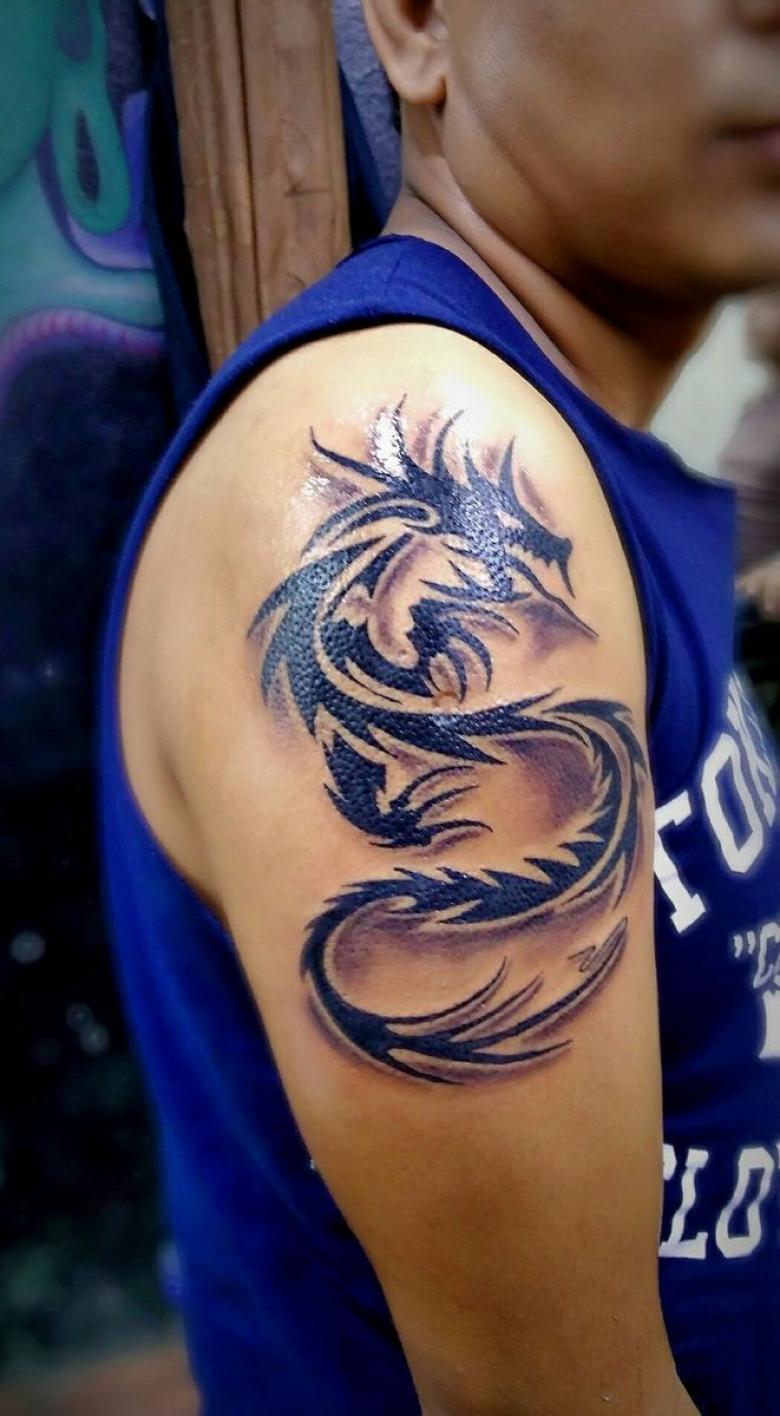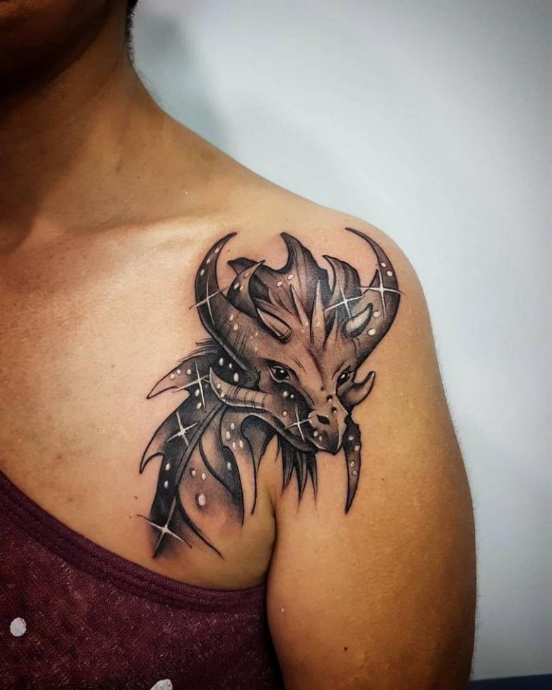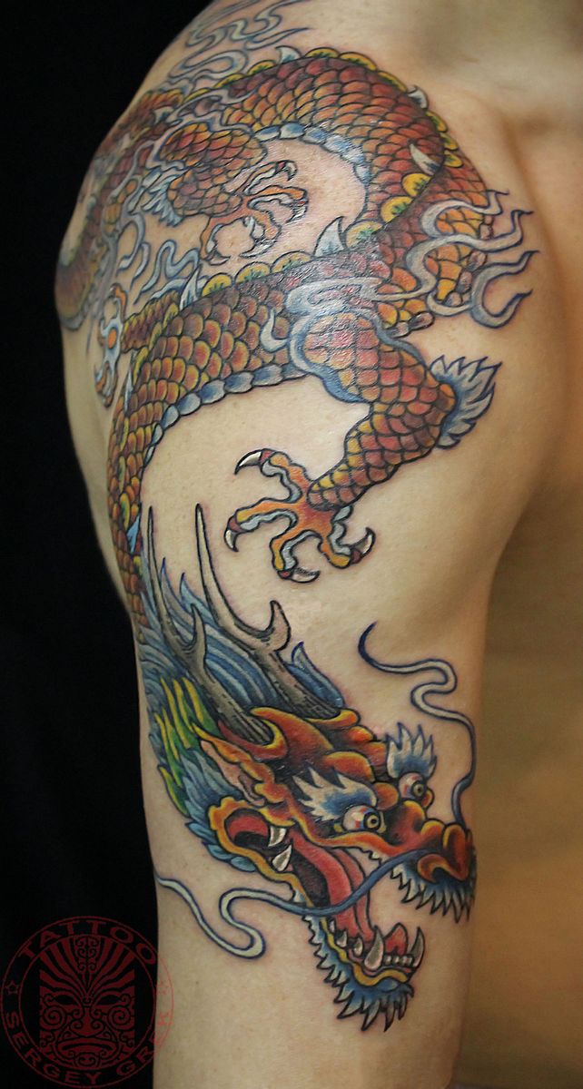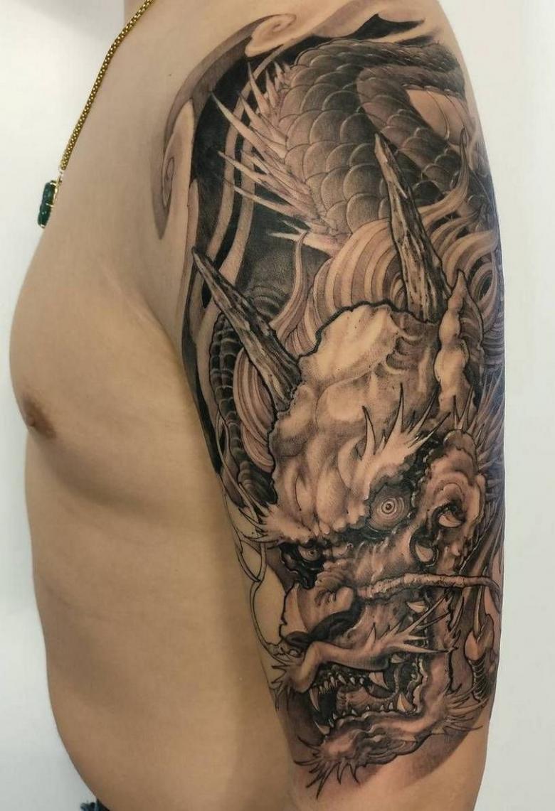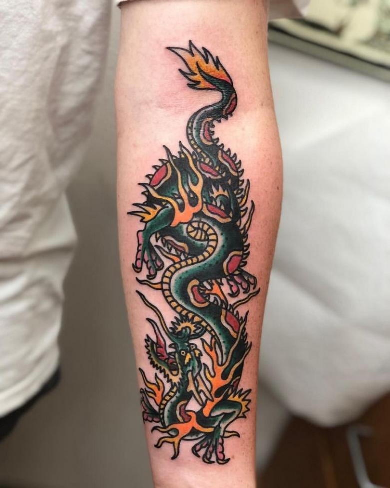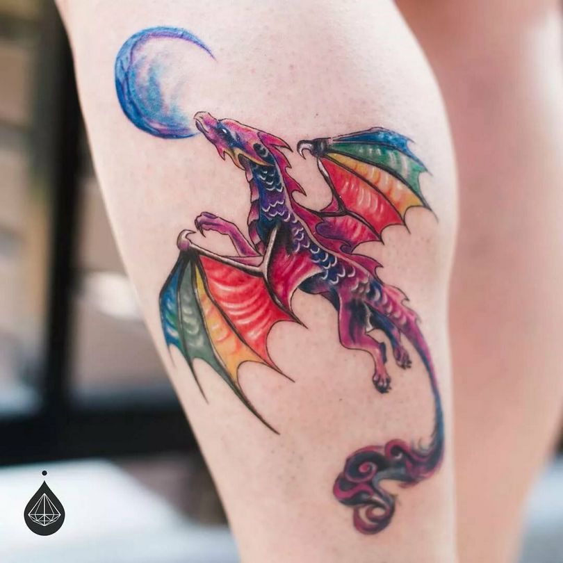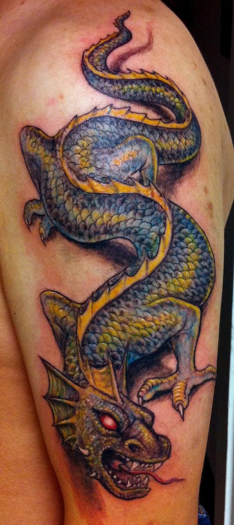 Un puissant lézard ailé en tout temps était populaire comme motif pour un tatouage. Souvent agressif et menaçant, le dragon sur le corps d'un guerrier était destiné à intimider l'ennemi. Dans le monde d'aujourd'hui, les tatouages sont faits plus pour des raisons esthétiques que pour le besoin réel de transmettre un message hostile, mais les dragons sont toujours respectés.