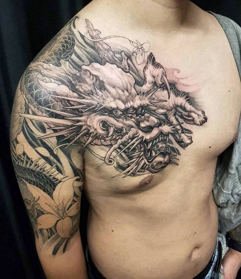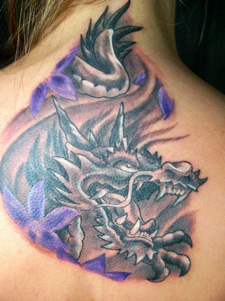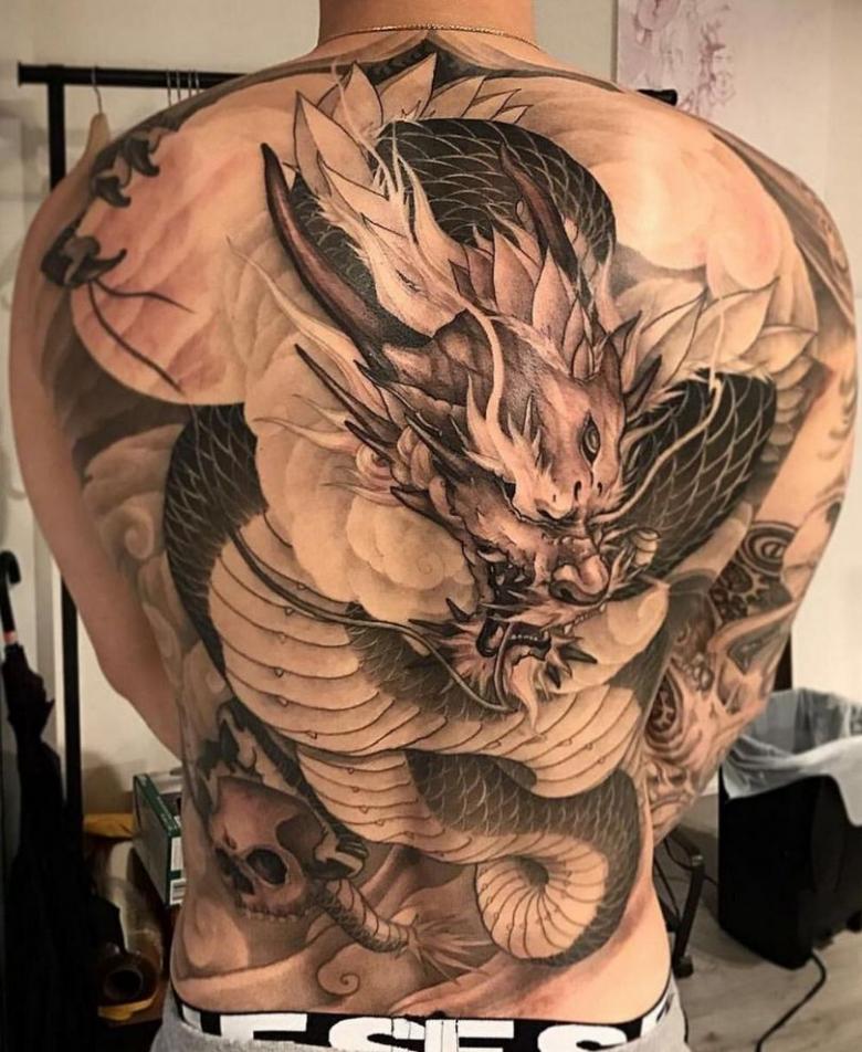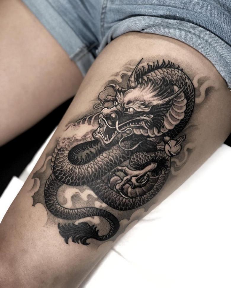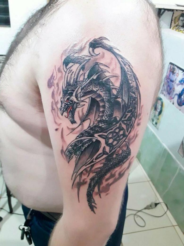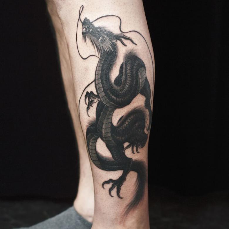 Ici, tout est clair. Selon la source, l'image du dragon est conforme au canon et est exécutée de manière aussi réaliste que possible. Écailles, membranes, griffes, flammes et nuage de fumée sortant de la bouche ouverte - plus c'est terrible, plus le tatoueur est compétent.