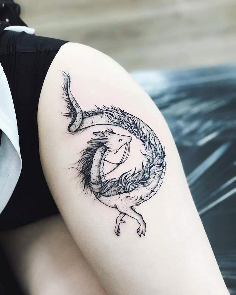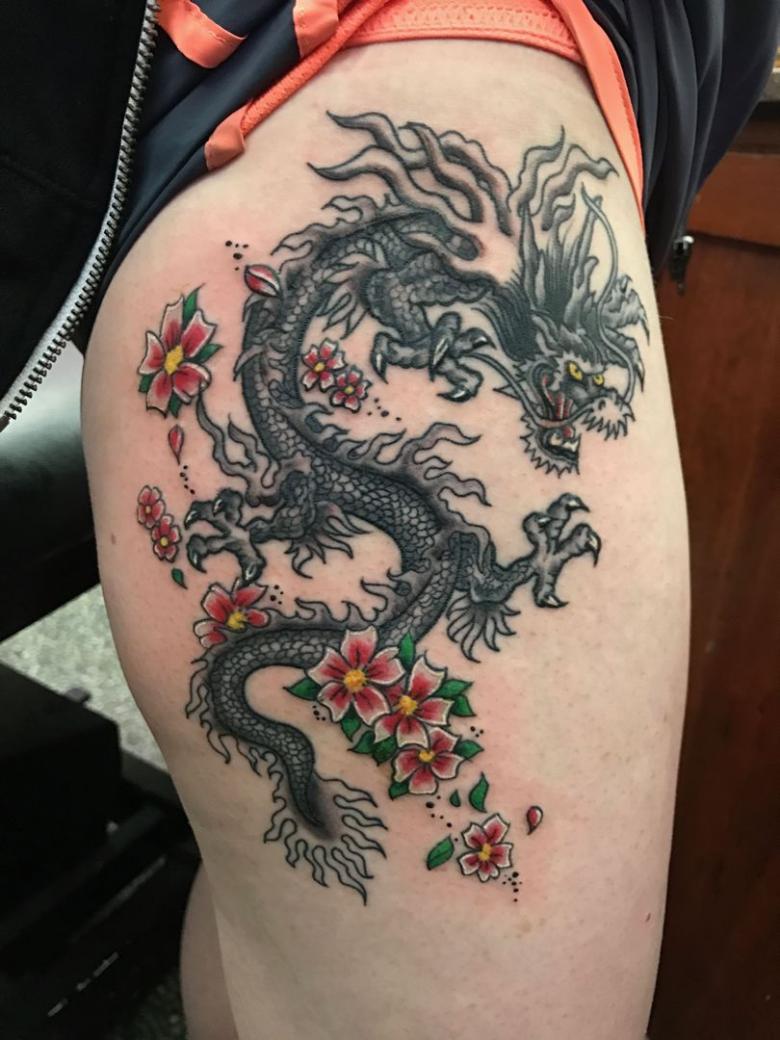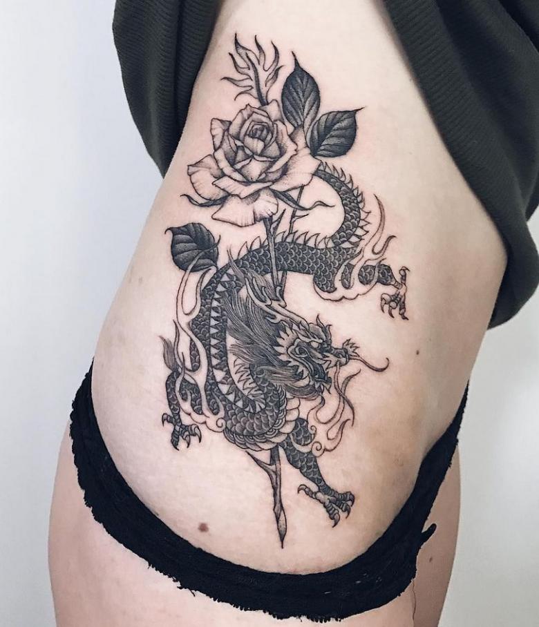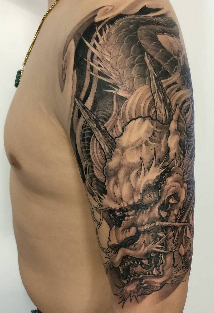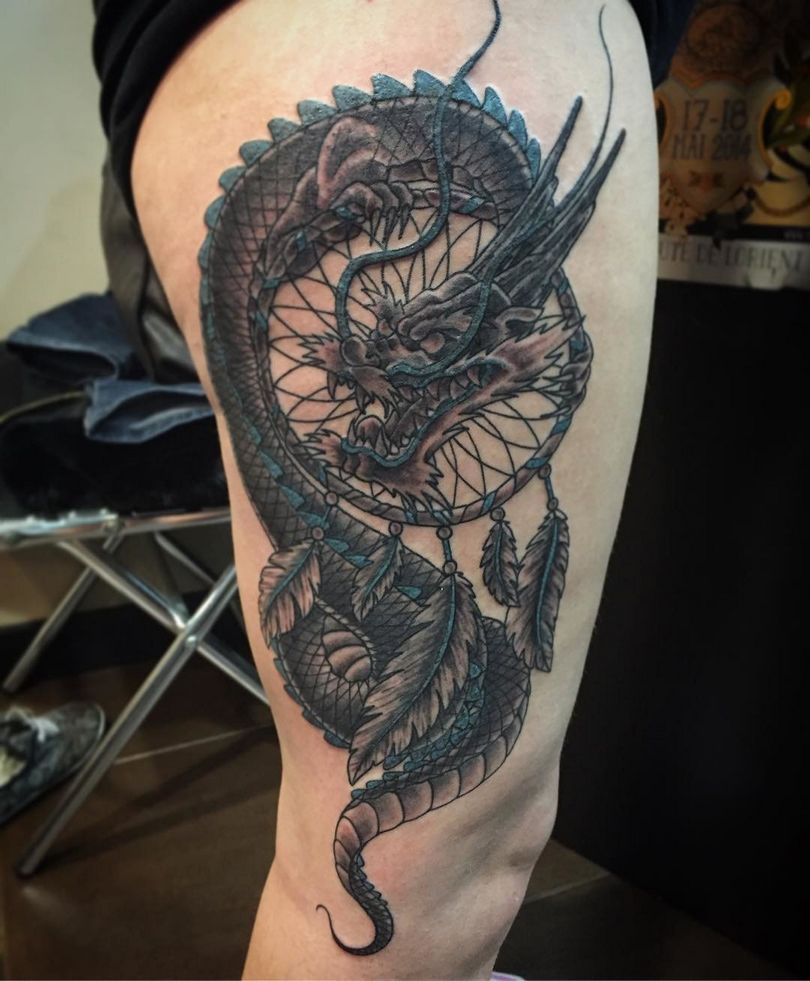 Ici, tout est clair. Selon la source, l'image du dragon est conforme au canon et est exécutée de manière aussi réaliste que possible. Écailles, membranes, griffes, flammes et nuage de fumée sortant de la bouche ouverte - plus c'est terrible, plus le tatoueur est compétent.