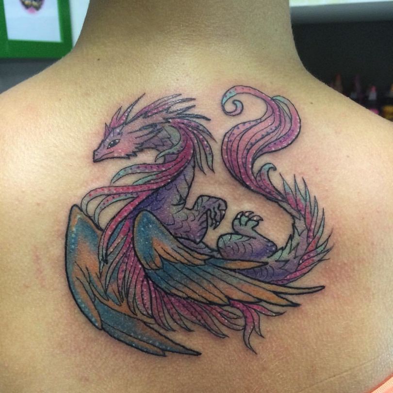 Les femmes sont moins susceptibles d'opter pour une agression grossière et manifeste. Ils sont plutôt déterminés à mettre en valeur la souplesse et la grâce de l'animal mythique dans leurs tatouages. Les filles romancent l'image d'un prédateur ailé en ajoutant des couleurs et des détails picturaux.