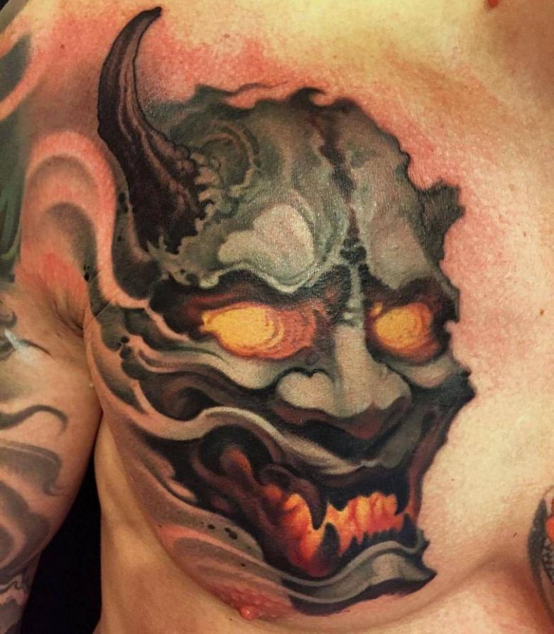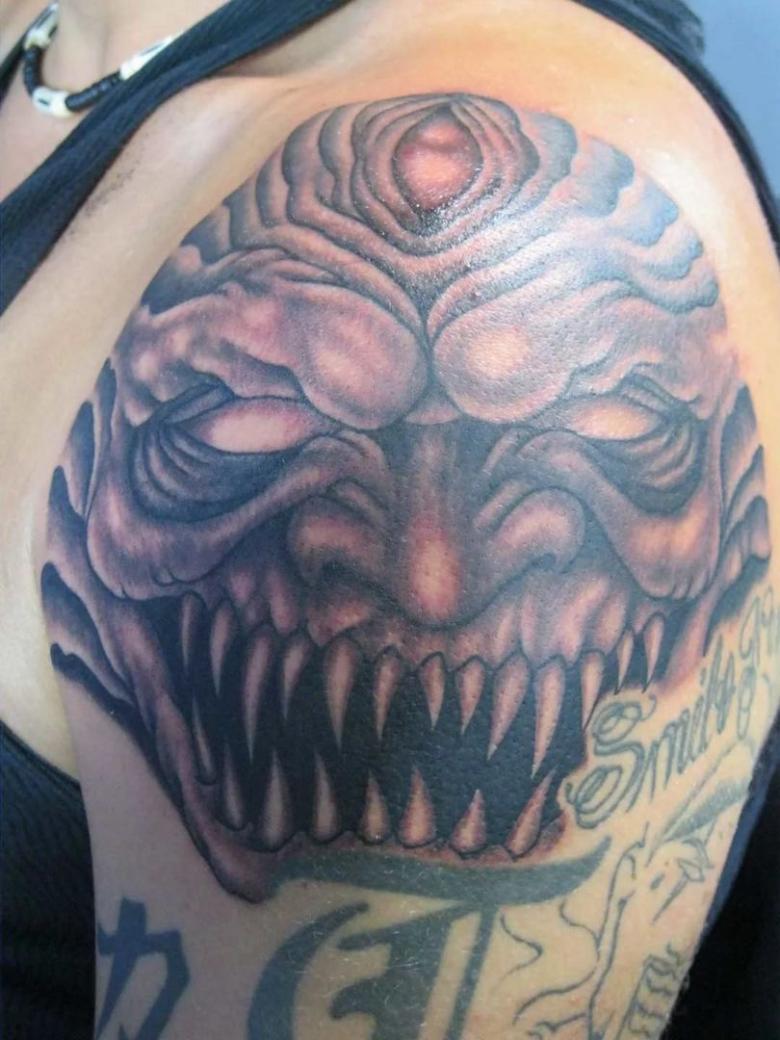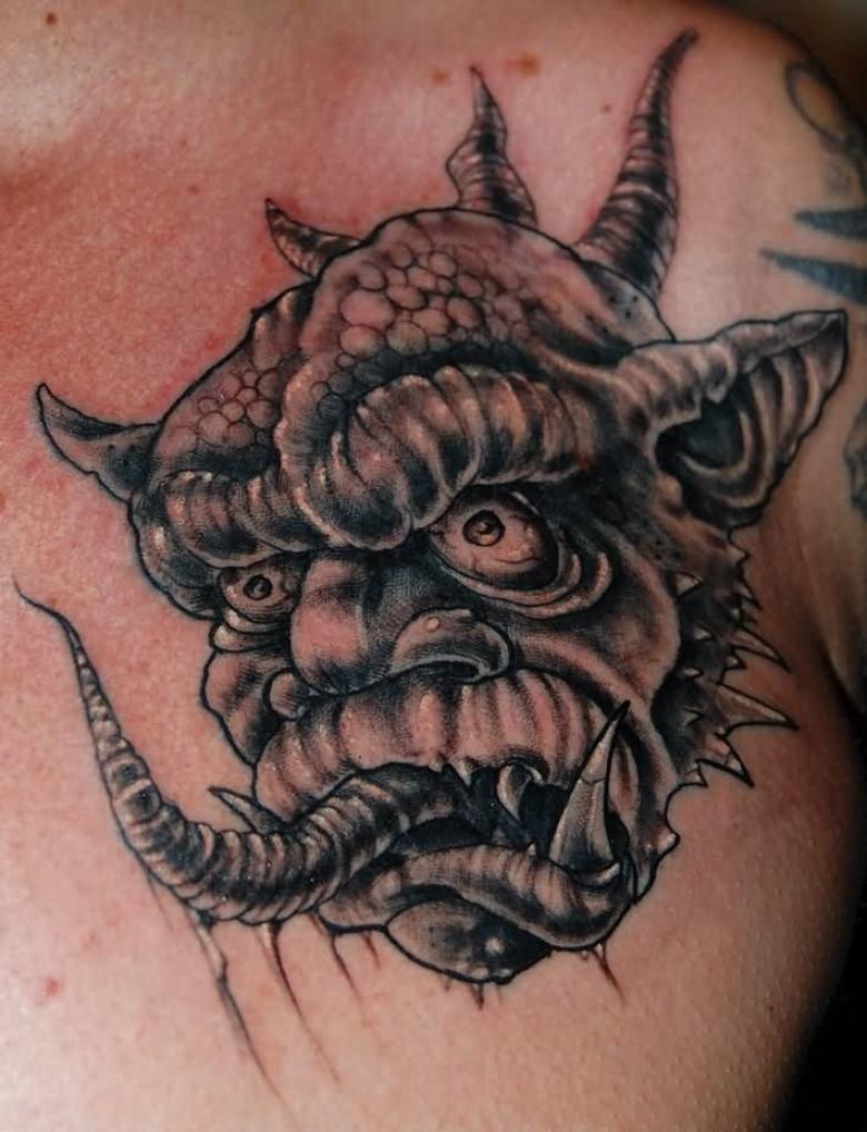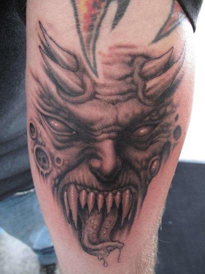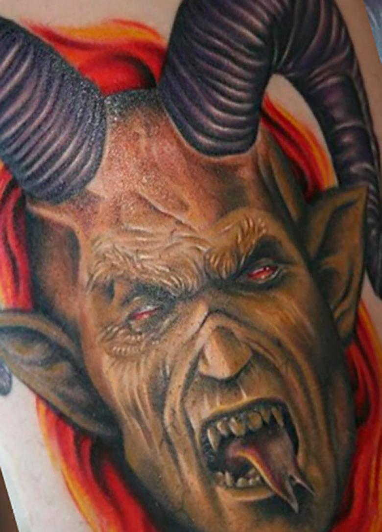 Voici un autre exemple classique de tatouage de diable satanique. L'image du diable avec sa langue qui sort et ses cornes rouges qui ornent sa tête de manière tout à fait horrible est une image que la plupart d'entre nous connaissent déjà. Il symbolise un comportement déviant et une attitude violente envers la vie.