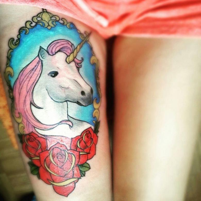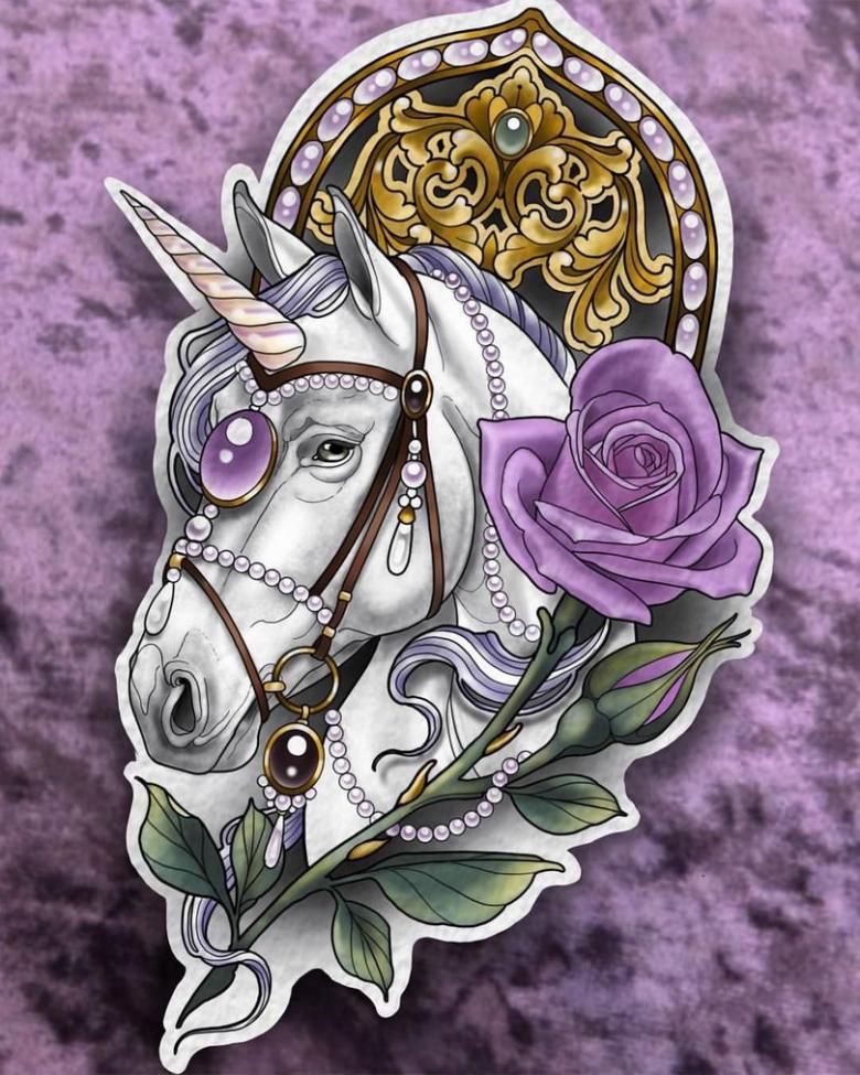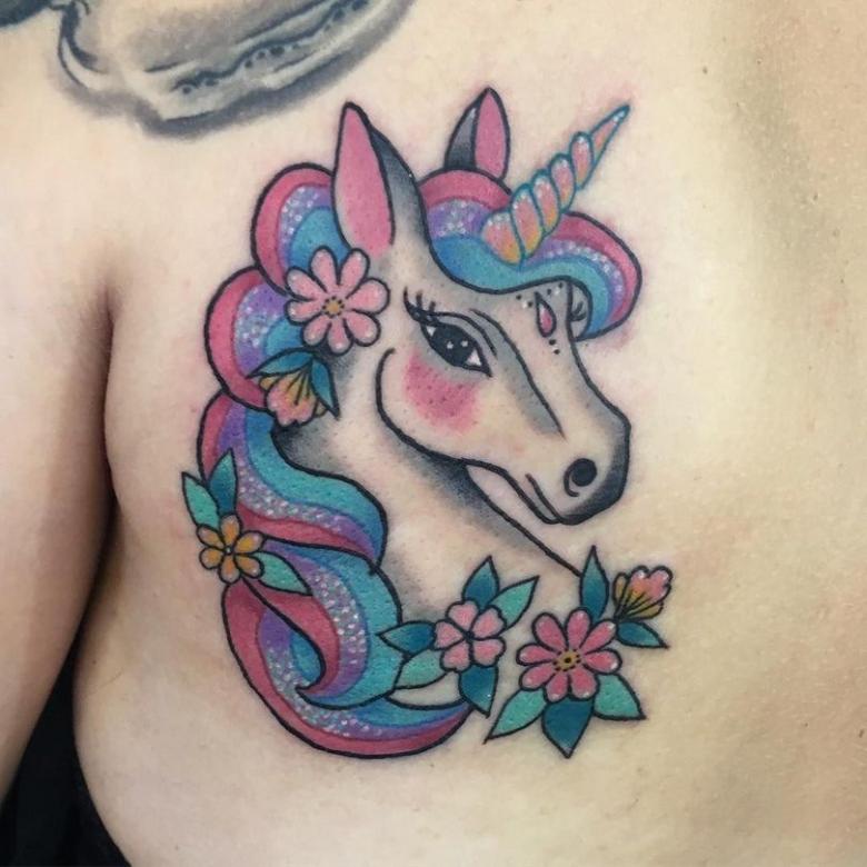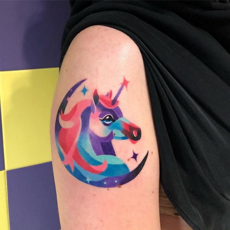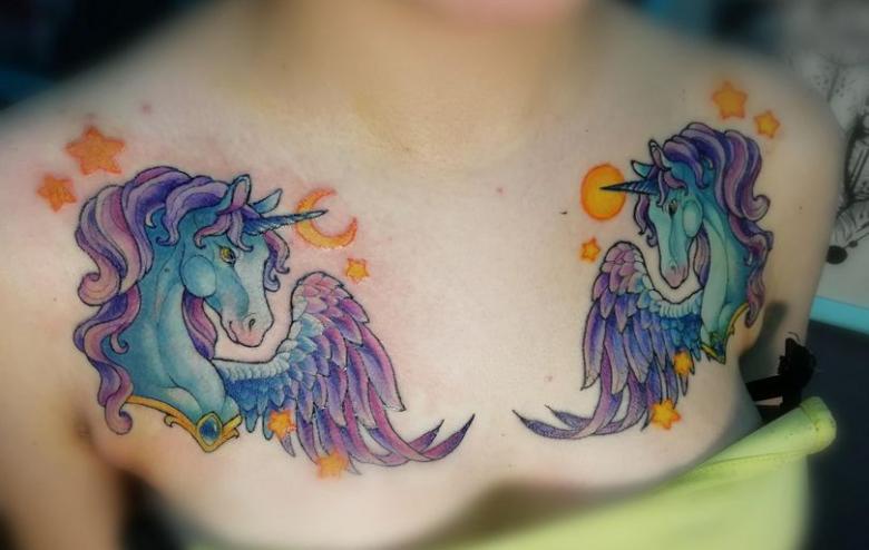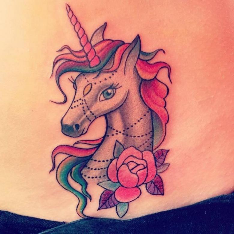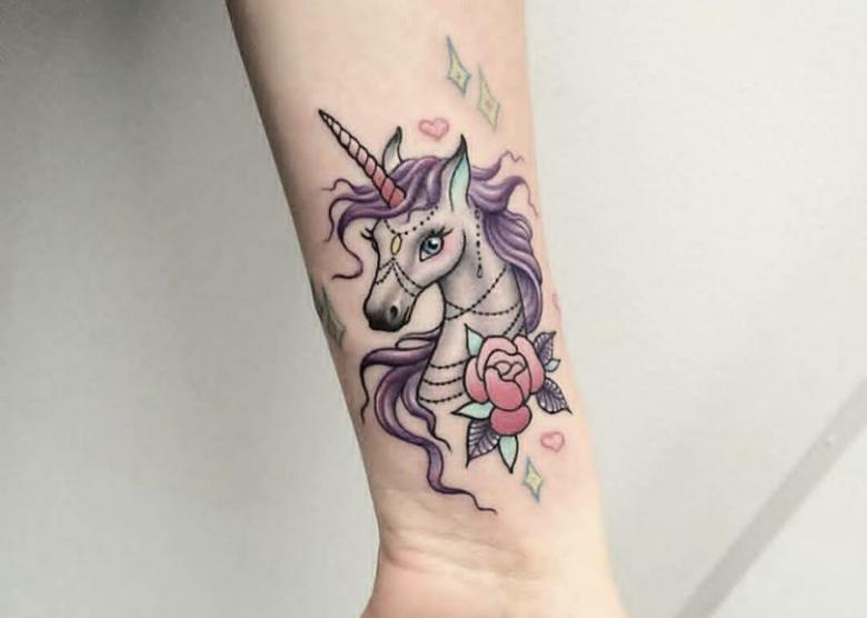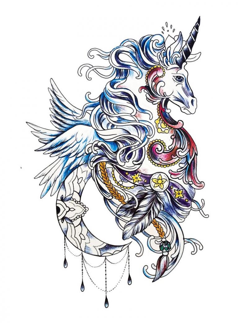 Le tatouage de licorne est une image féminine représentant l'âme pure et la conquête d'une puissance débridée. Il donne à une fille du mystère et du charme. Le cheval ailé signifie la perfection physique et morale, confirmant une position résolue contre les ennemis. Le porteur met en avant les qualités suivantes :
