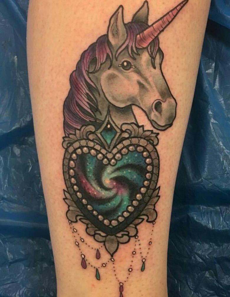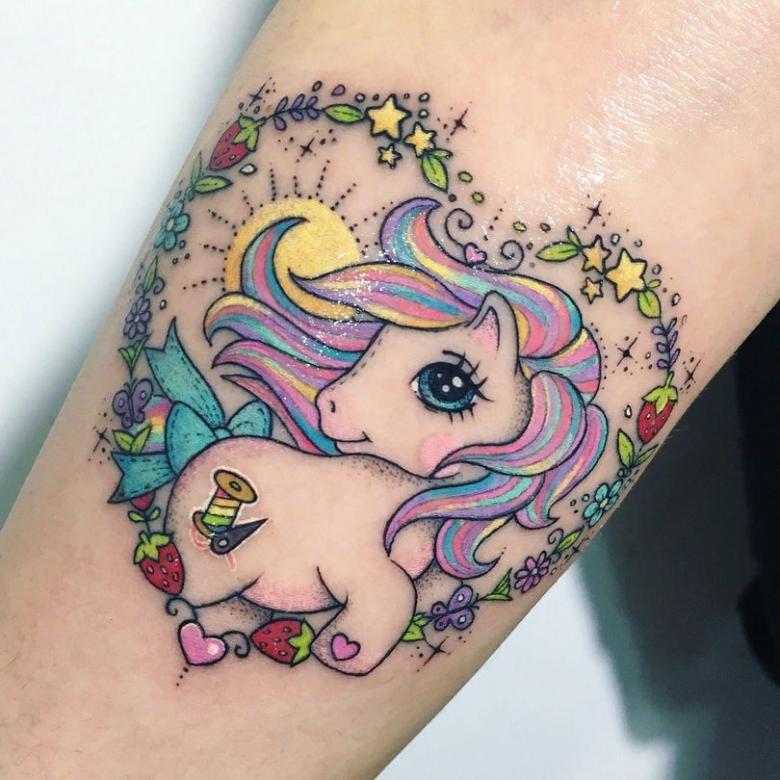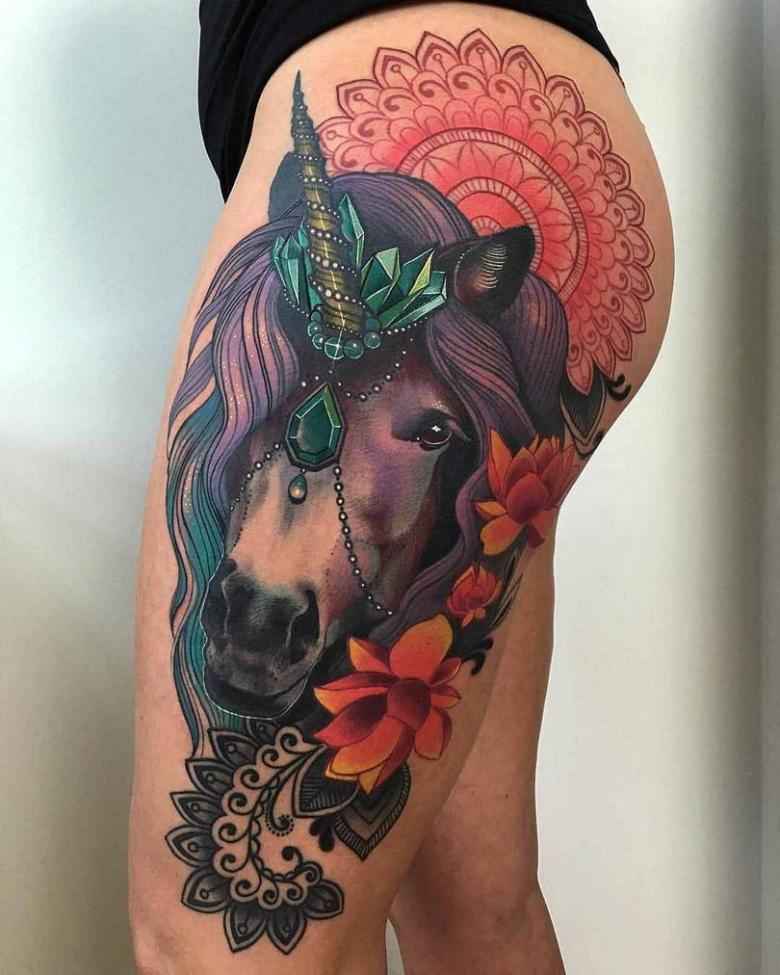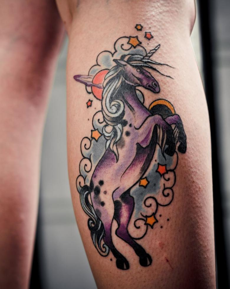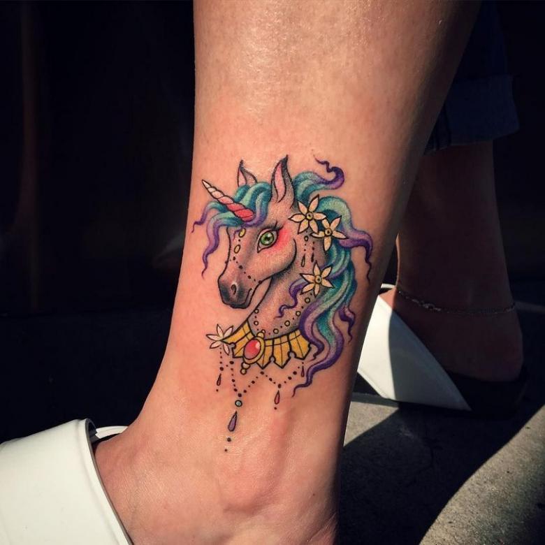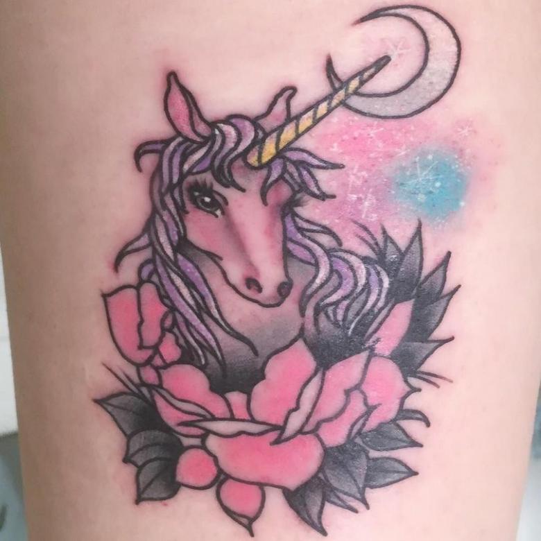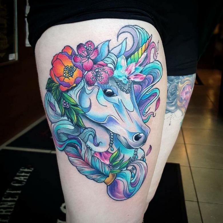Le tatouage de licorne est une image féminine représentant l'âme pure et la conquête d'une puissance débridée. Il donne à une fille du mystère et du charme. Le cheval ailé signifie la perfection physique et morale, confirmant une position résolue contre les ennemis. Le porteur met en avant les qualités suivantes :
