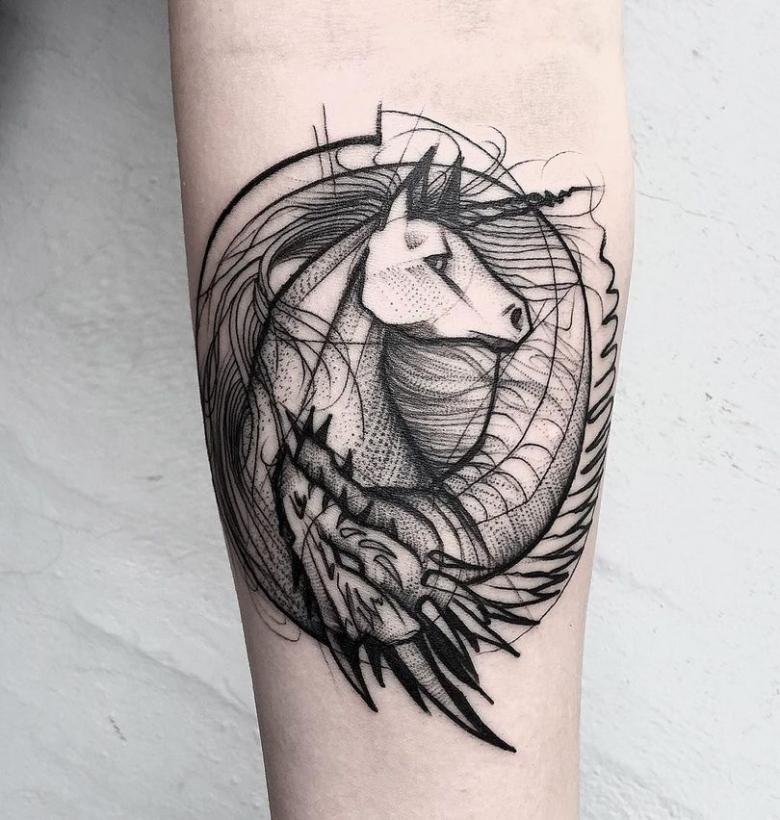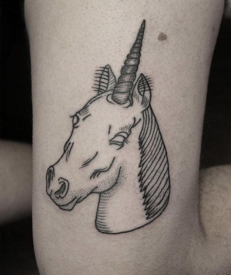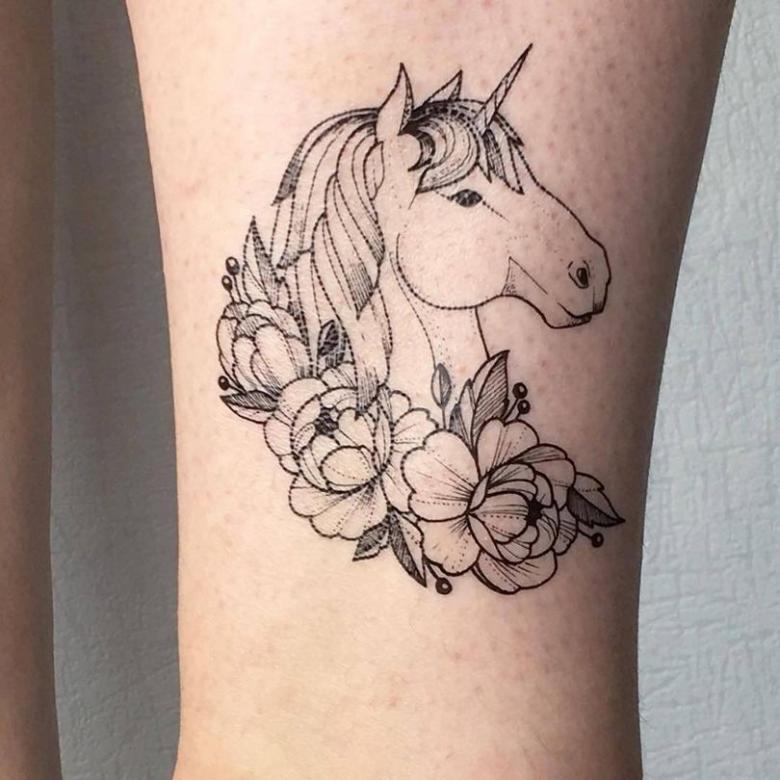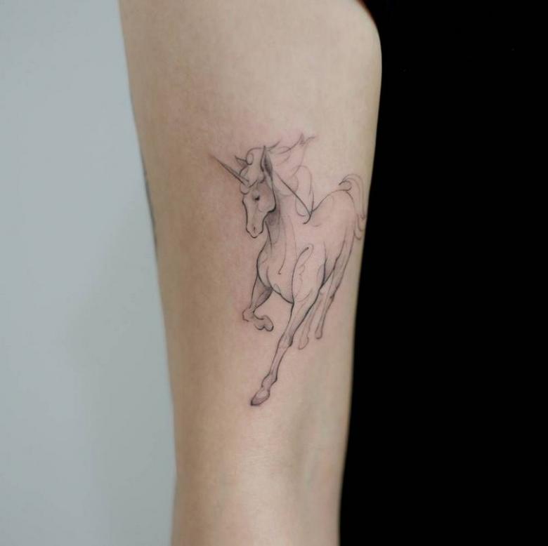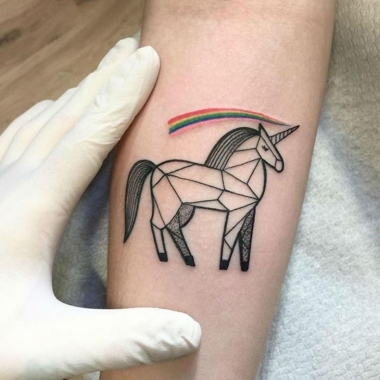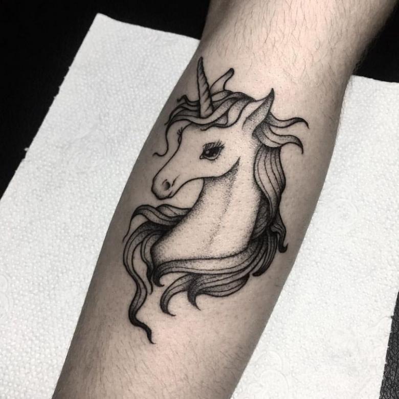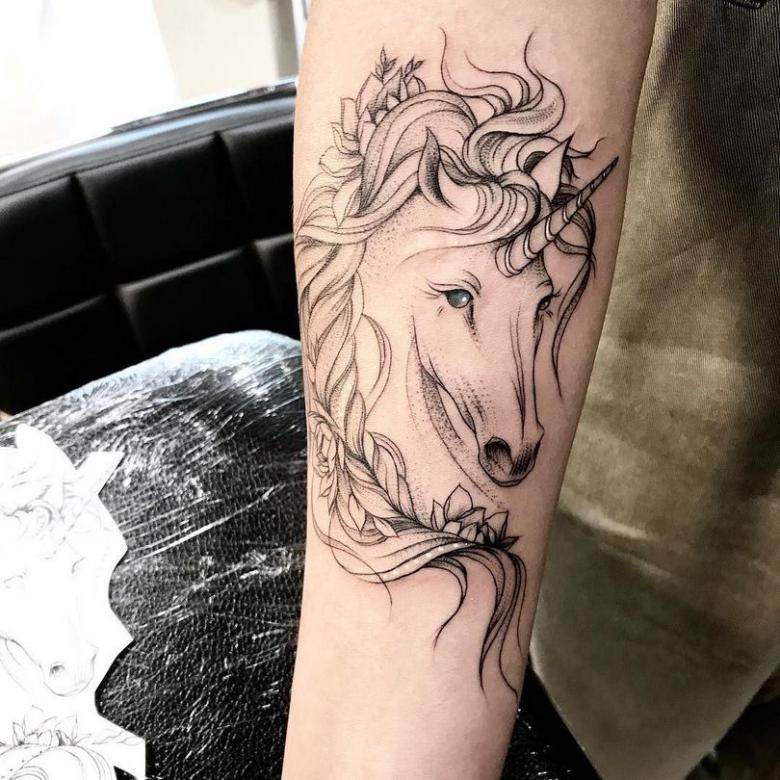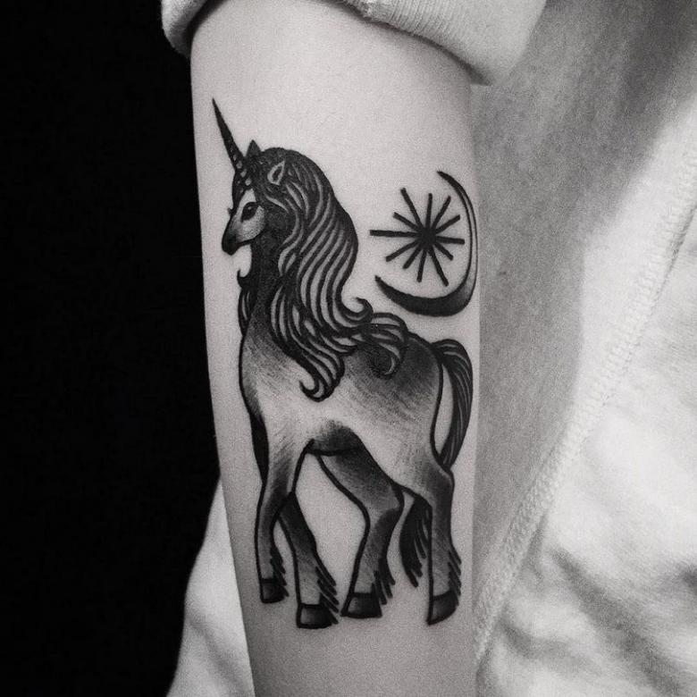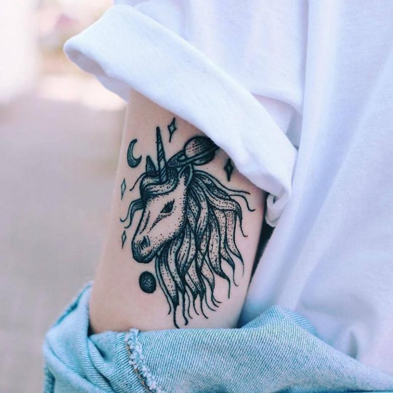 Tatouage licorne - significations pour les filles et les hommes, styles (noir et blanc, géométrie), beaux dessins, photos