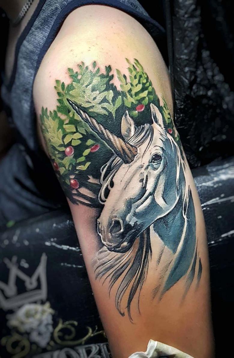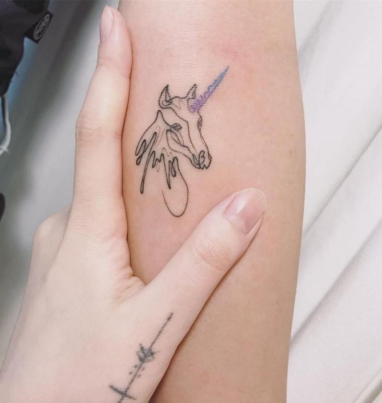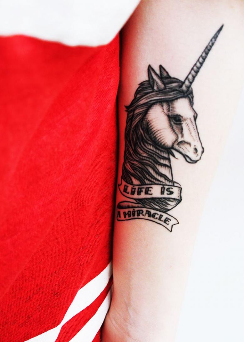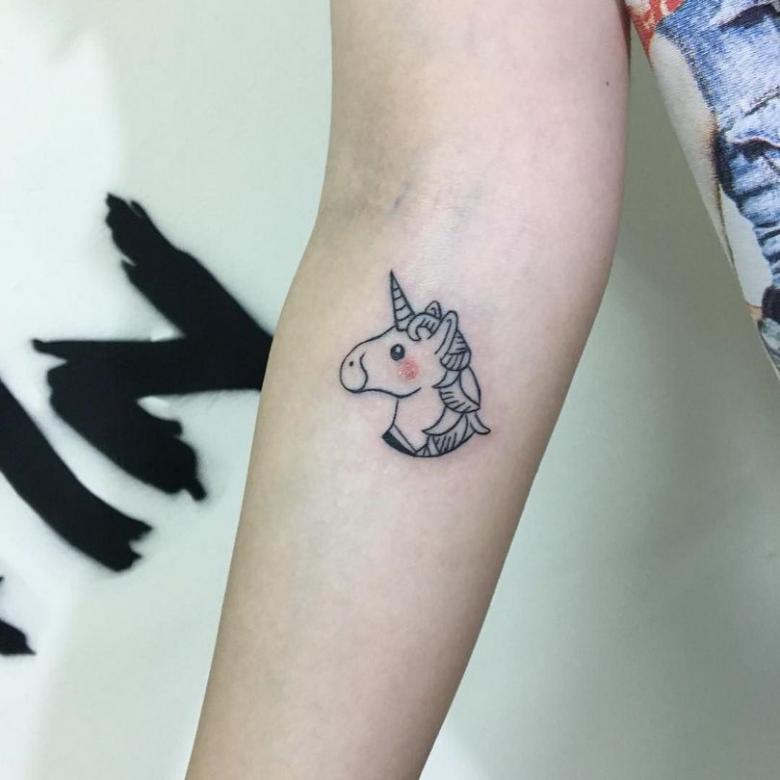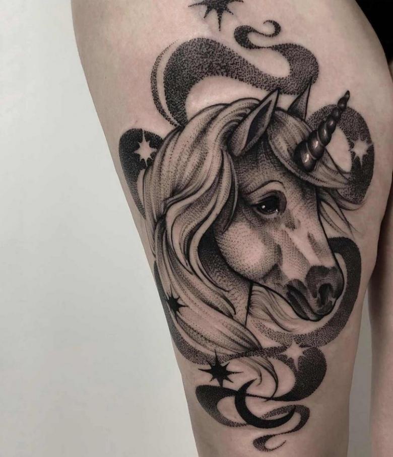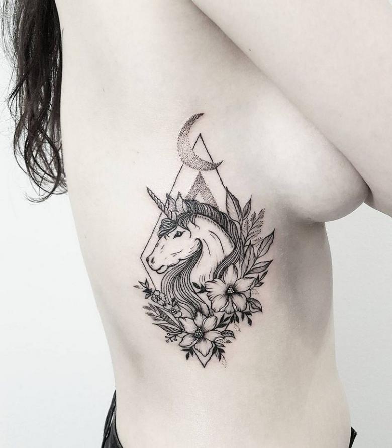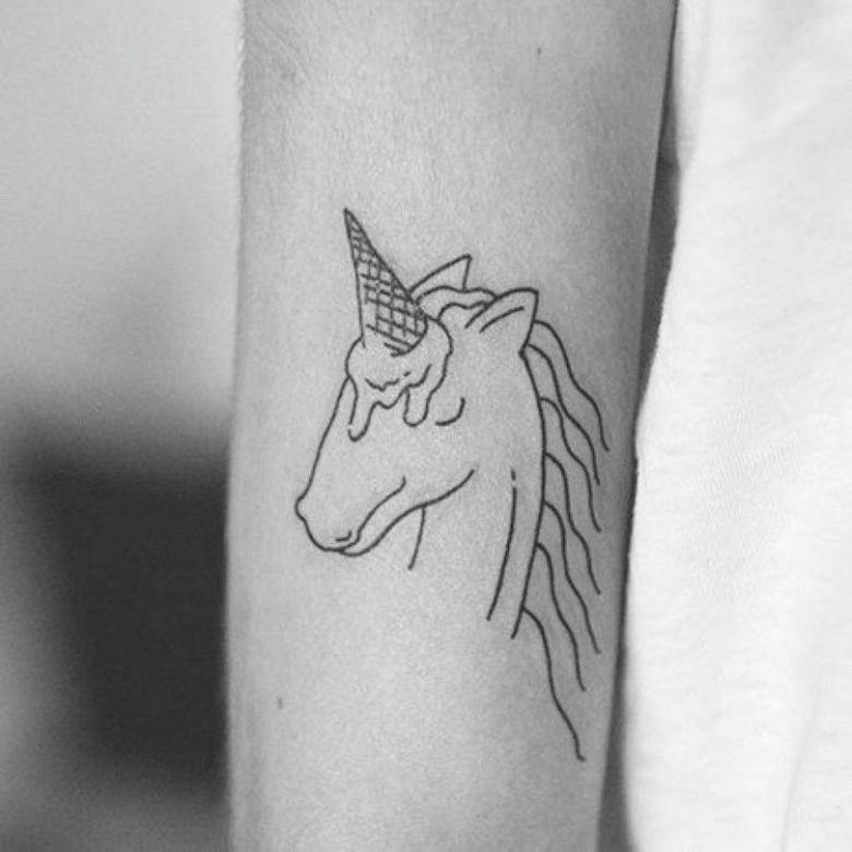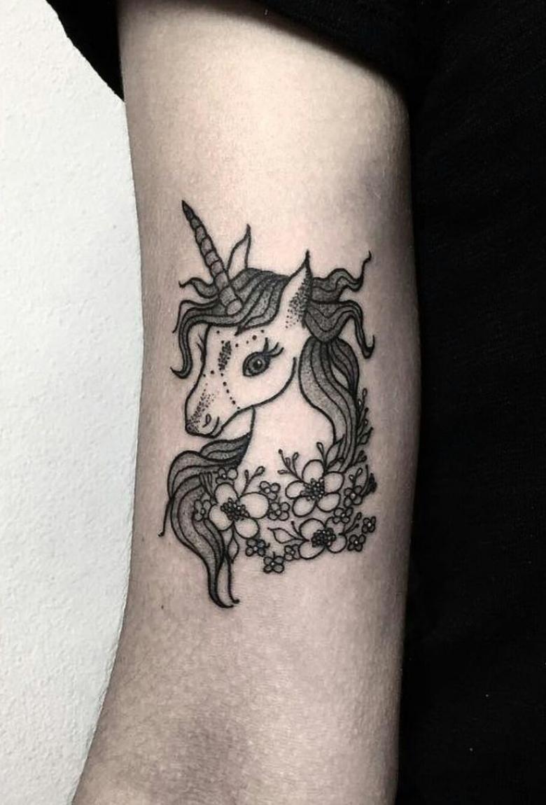 Tatouage licorne - significations pour les filles et les hommes, styles (noir et blanc, géométrie), beaux dessins, photos