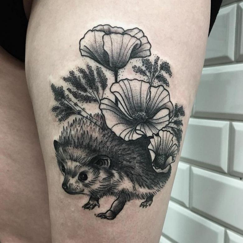 Si le tatouage montre un hérisson dans des fleurs, des baies et des champignons, il est probable que la jeune fille soit une véritable artisane de la cuisine. Elle cuisine des plats vraiment uniques que tous les membres de la famille apprécient. Une fille avec un tatouage de hérisson a tout ce qu'il faut à la maison. Pour les amis, elle devient un chef spirituel à suivre, dont les conseils peuvent être écoutés. La jeune fille aime offrir des cadeaux et offrir de délicieux repas à ses invités.