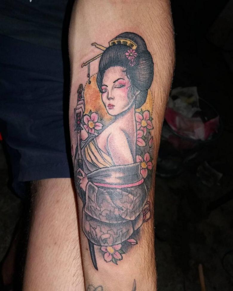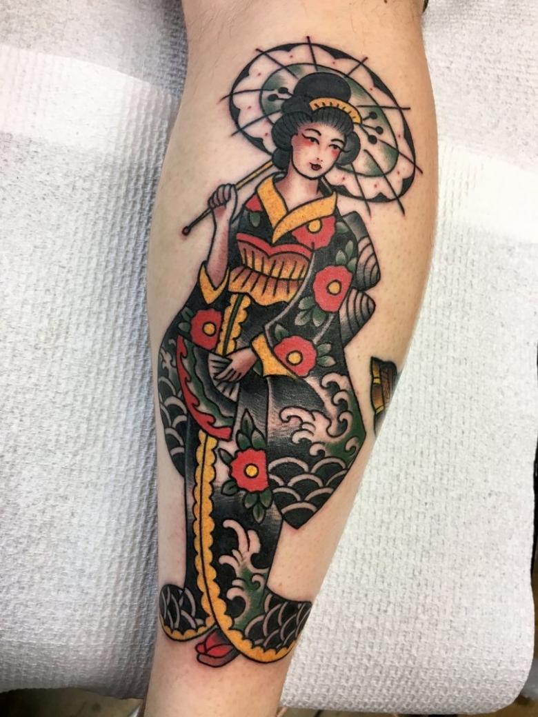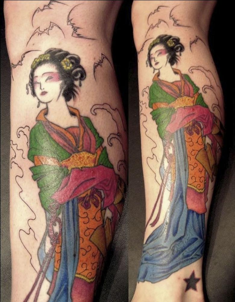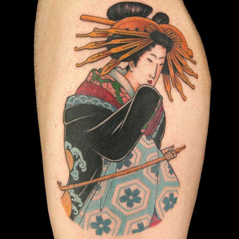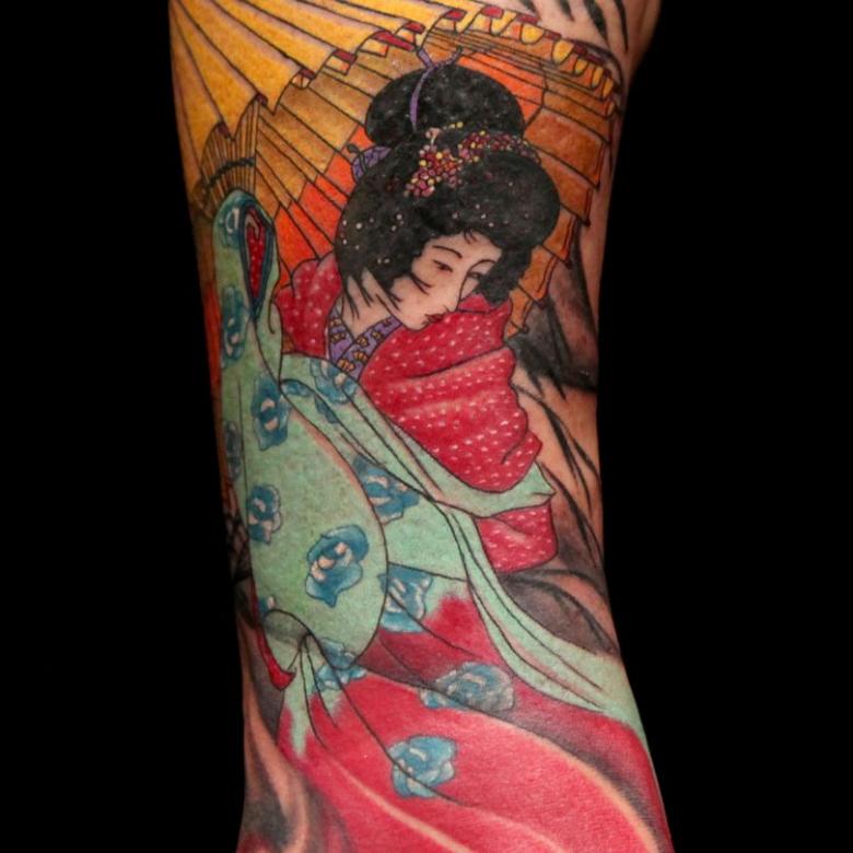 Une geisha en pied peut être représentée sur l'avant-bras ou dans le dos. Sur le bas de la jambe, d'ailleurs, le tatouage serait assez spectaculaire.