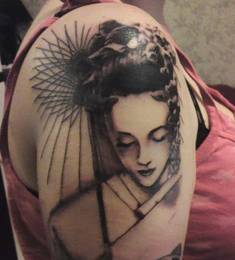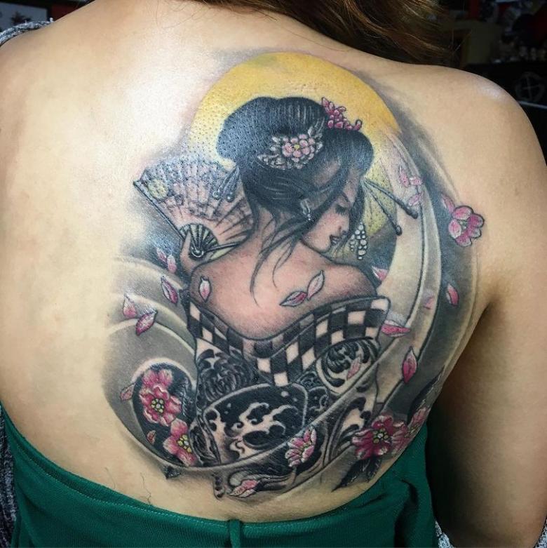 Un tatouage de geisha peut être réalisé sur n'importe quelle partie du corps. Pour être plus précis sur l'image et pour tracer clairement les détails, beaucoup choisissent le dos. Ici, la tentatrice peut être représentée avec un éventail ou un parapluie, juste assez d'espace.