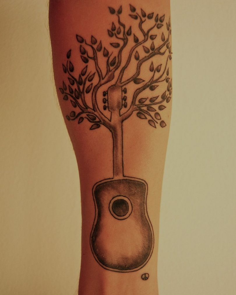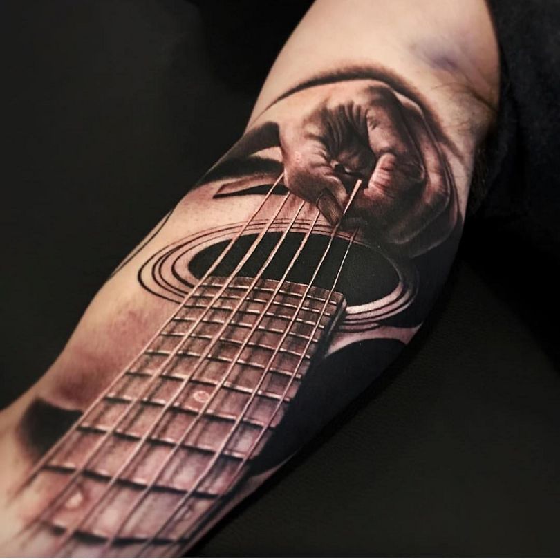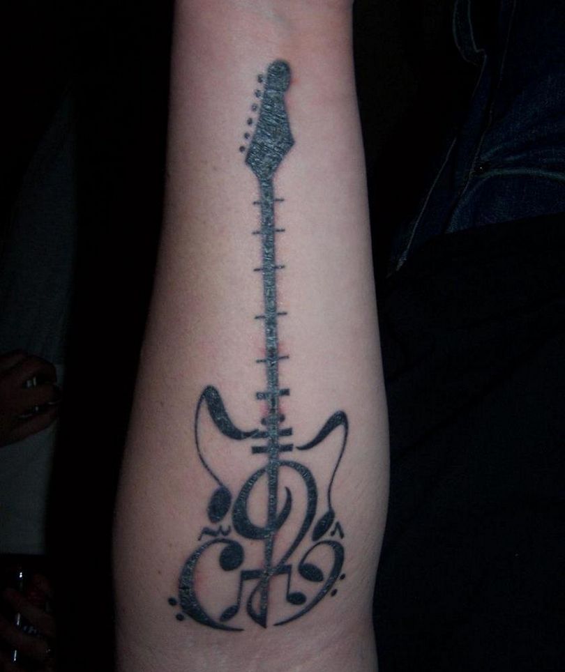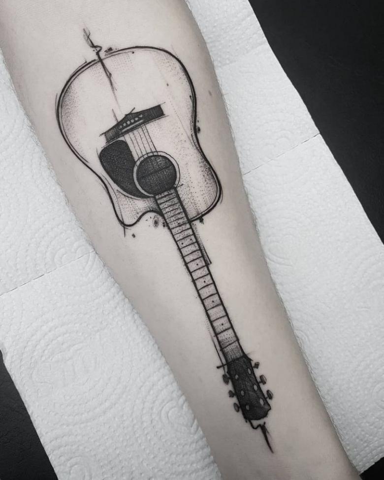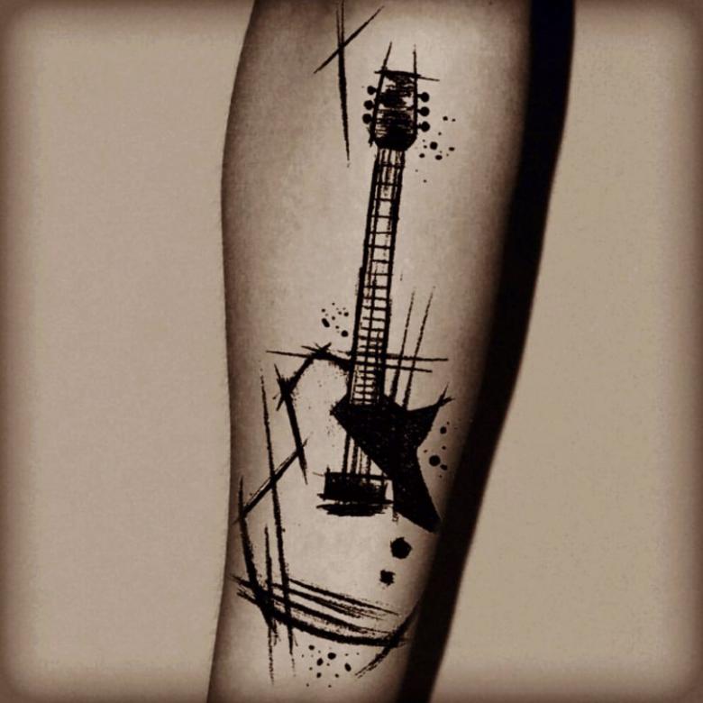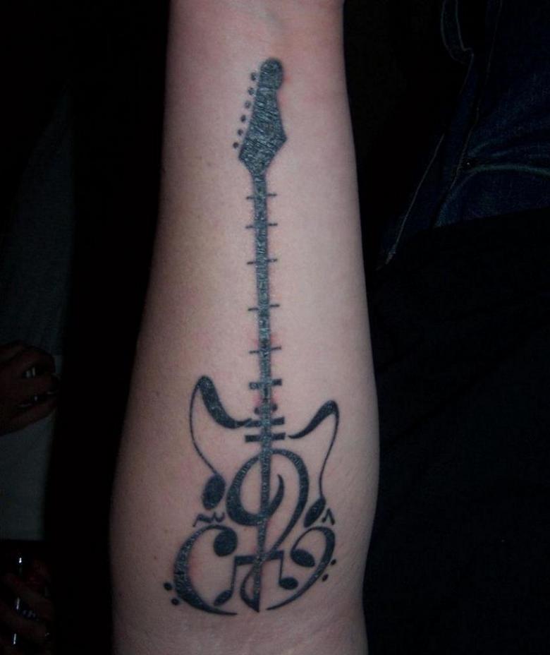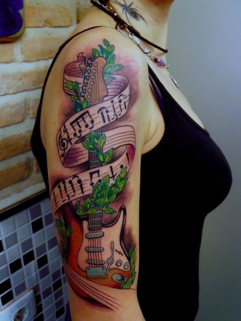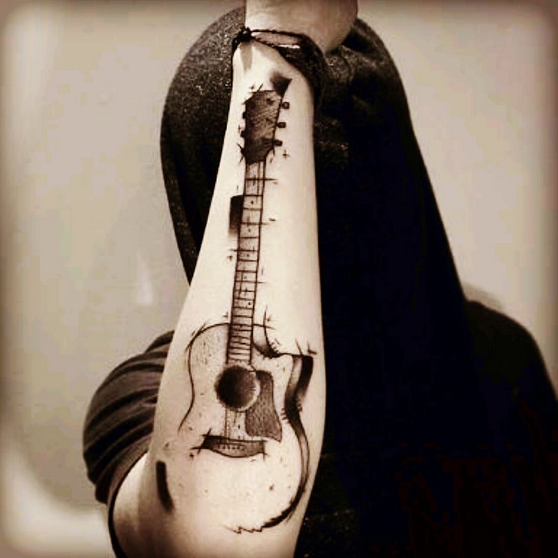 Tattoo guitare - design et signification du tatouage pour les filles et les hommes, où le placer (sur le bras, l'épaule), photos amusantes