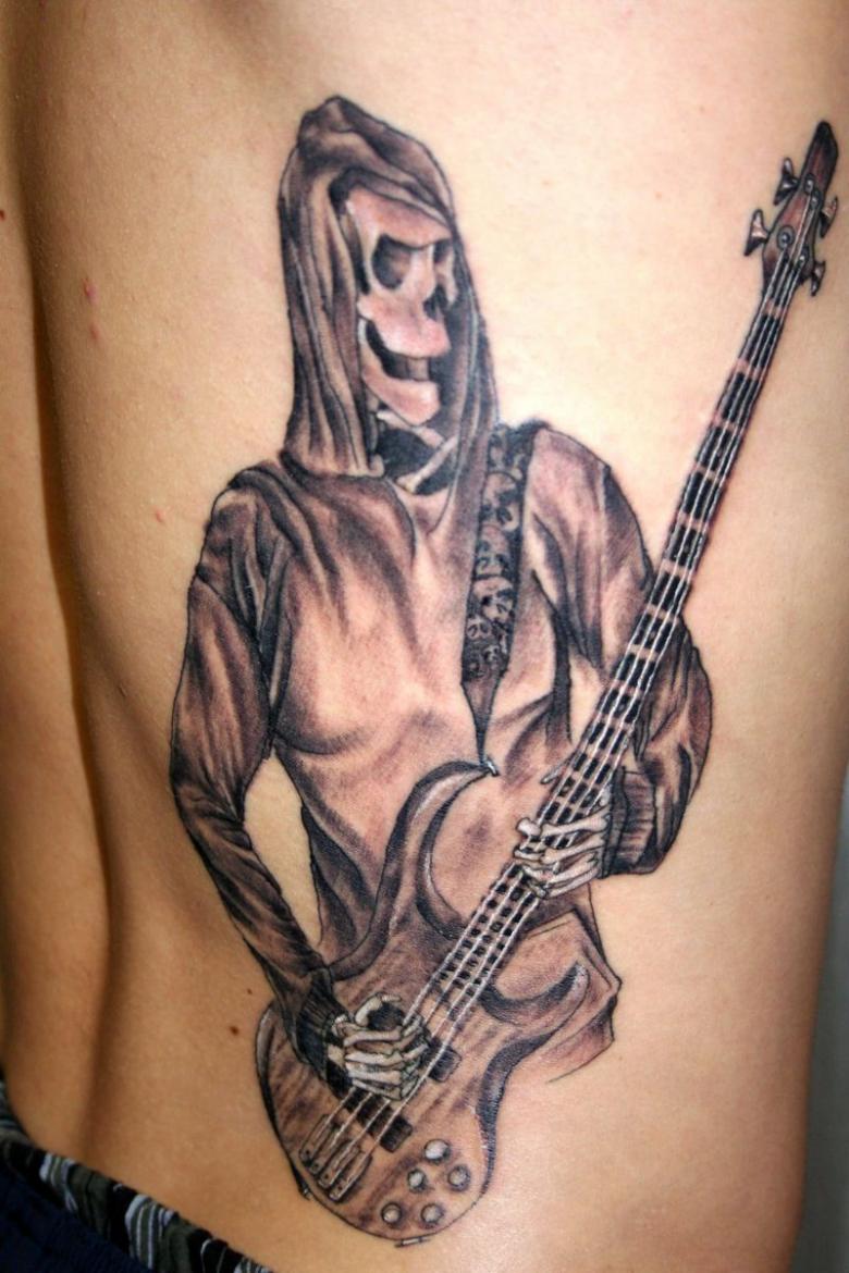 - Dessin d'un squelette avec une guitare. Exprime son mépris pour la mort. Particulièrement fréquents au Mexique, ces tatouages sont inscrits par ceux qui sont classés dans le cercle criminel. Souvent, un texte est ajouté au dessin de la guitare.