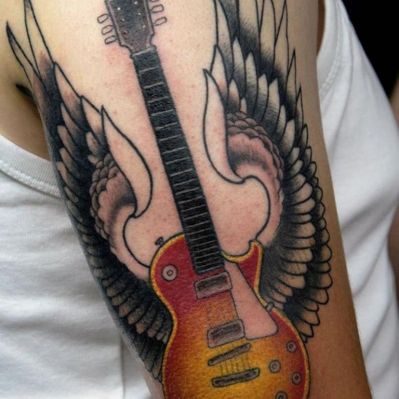 Une guitare avec des ailes rappelle une vie libre, la créativité et l'épanouissement personnel. Des tatouages similaires sont également utilisés comme talisman : une image portée d'une guitare aide à la concentration, à la réalisation des rêves, à la persévérance.