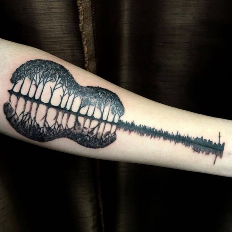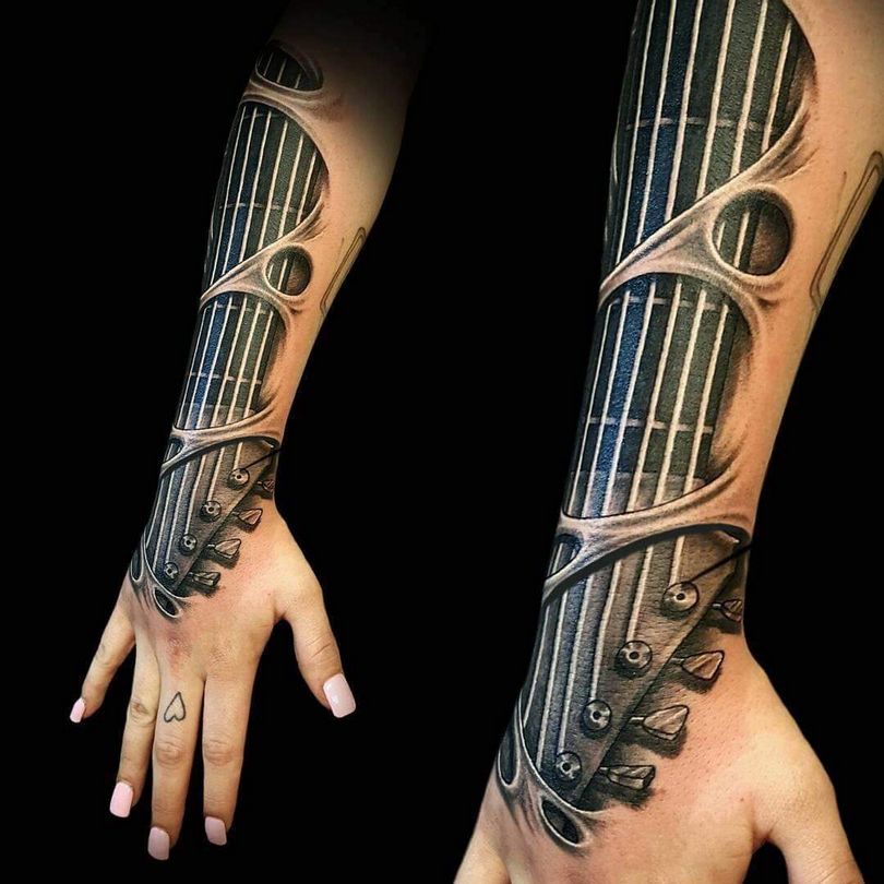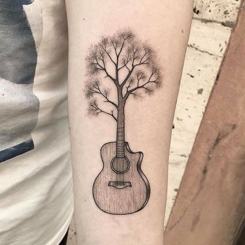 Certains mélomanes préfèrent bourrer l'instrument de notes et d'accords qui explosent dans les cordes de la guitare. Certains futurs tatoueurs réalisent un dessin à partir d'une photo de leur propre instrument ou utilisent un croquis tout fait.