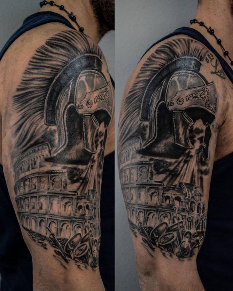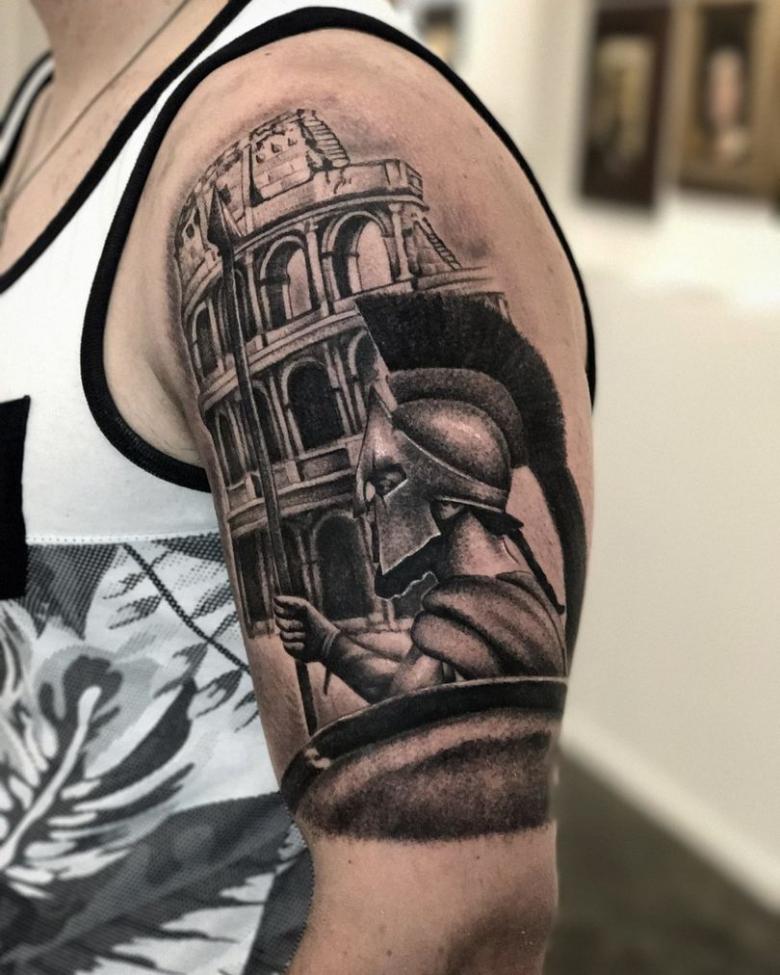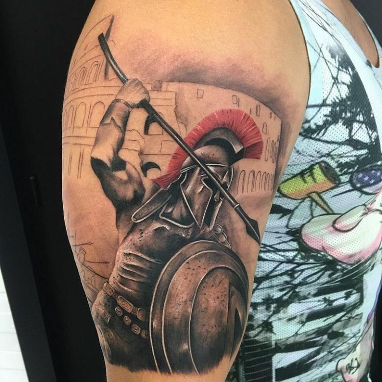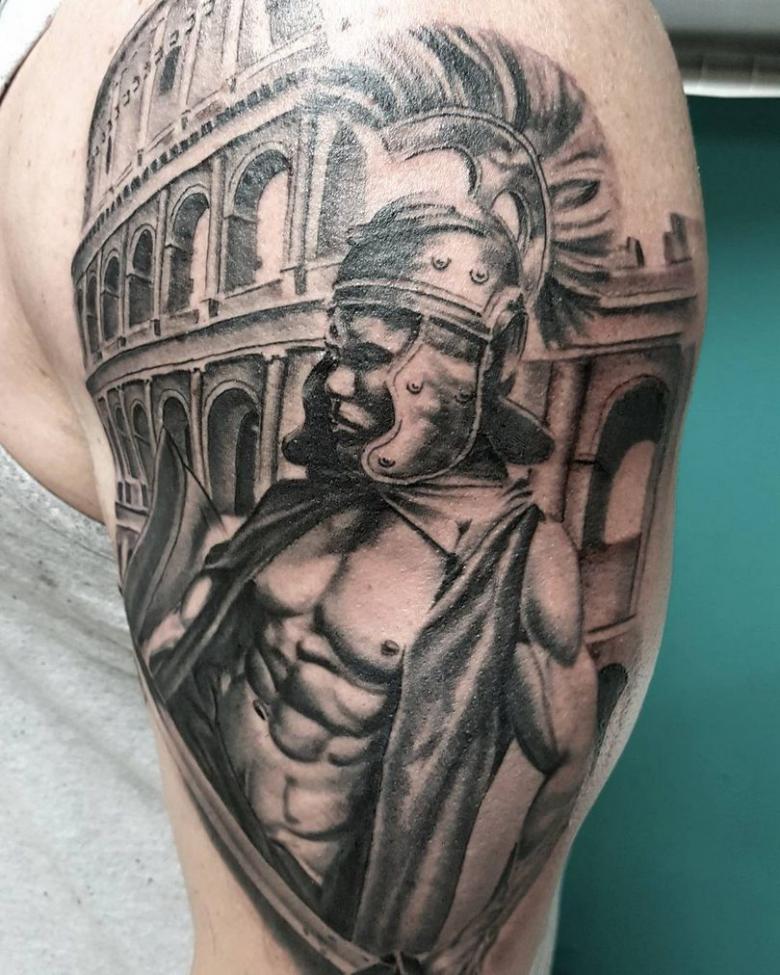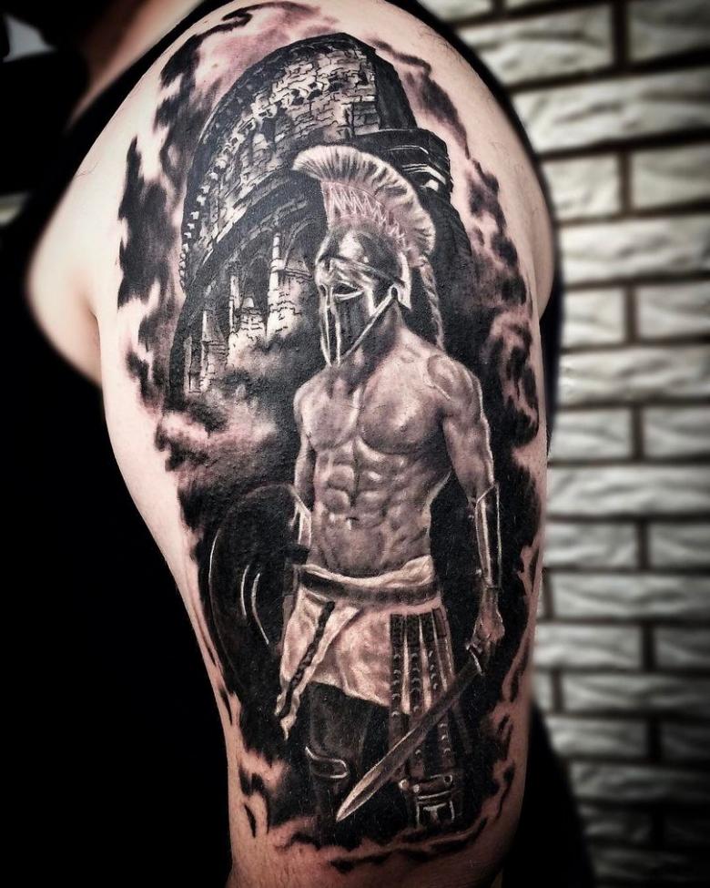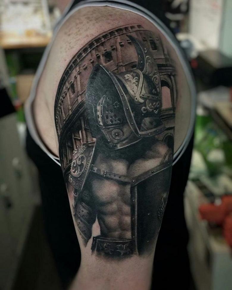 Les tatouages de gladiateurs volumineux et réalistes sont parfaits sur l'épaule car il y a suffisamment d'espace pour créer une image détaillée. Ceci est particulièrement avantageux si l'épaule est massive et musclée.