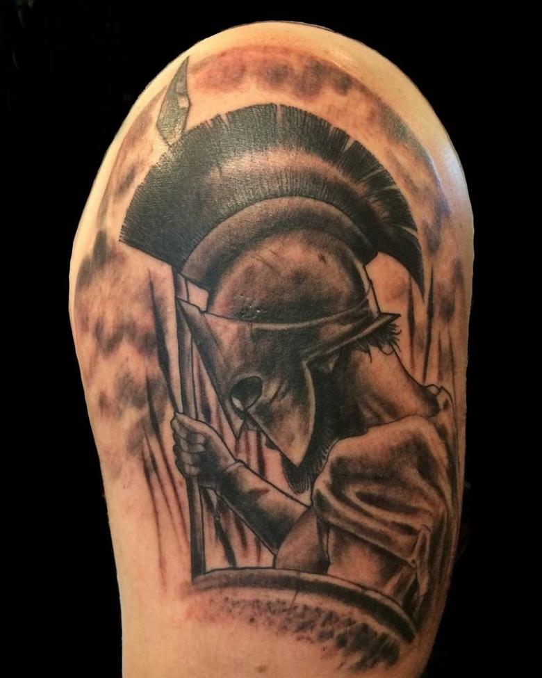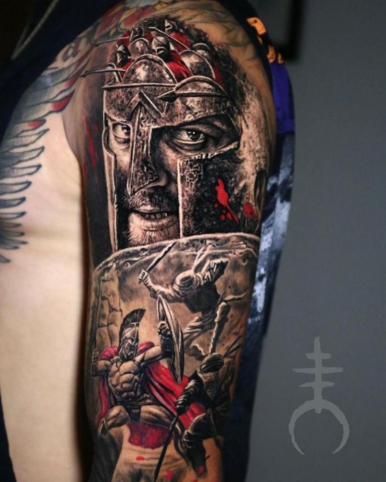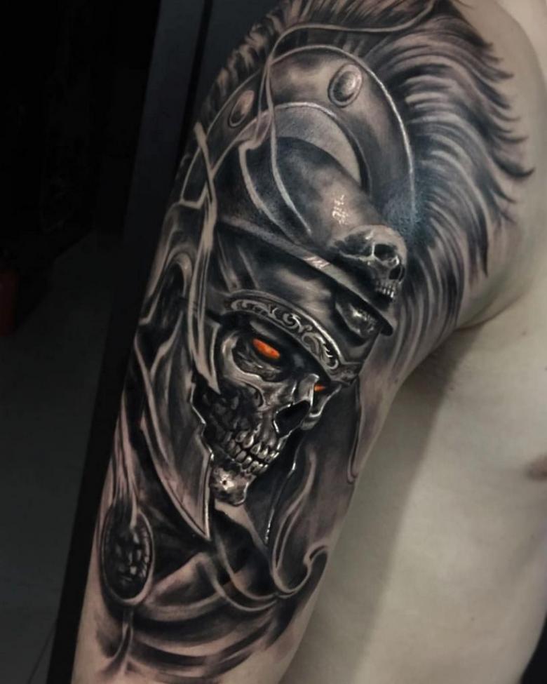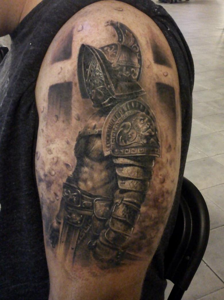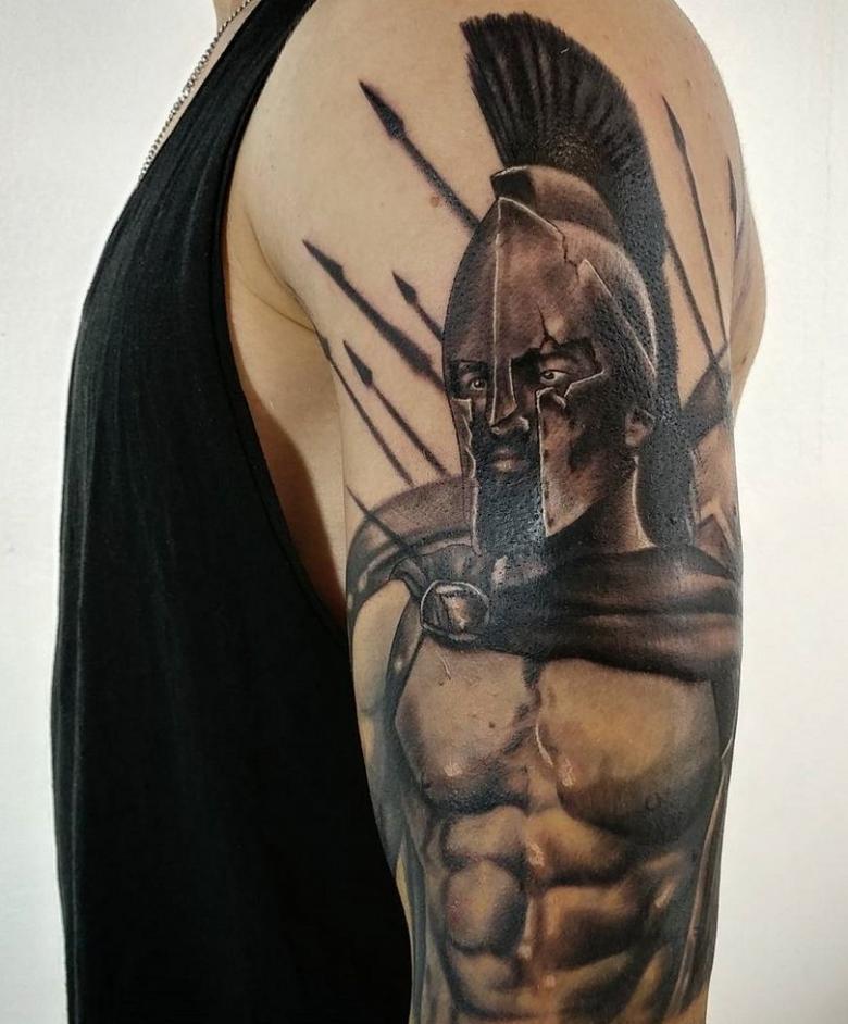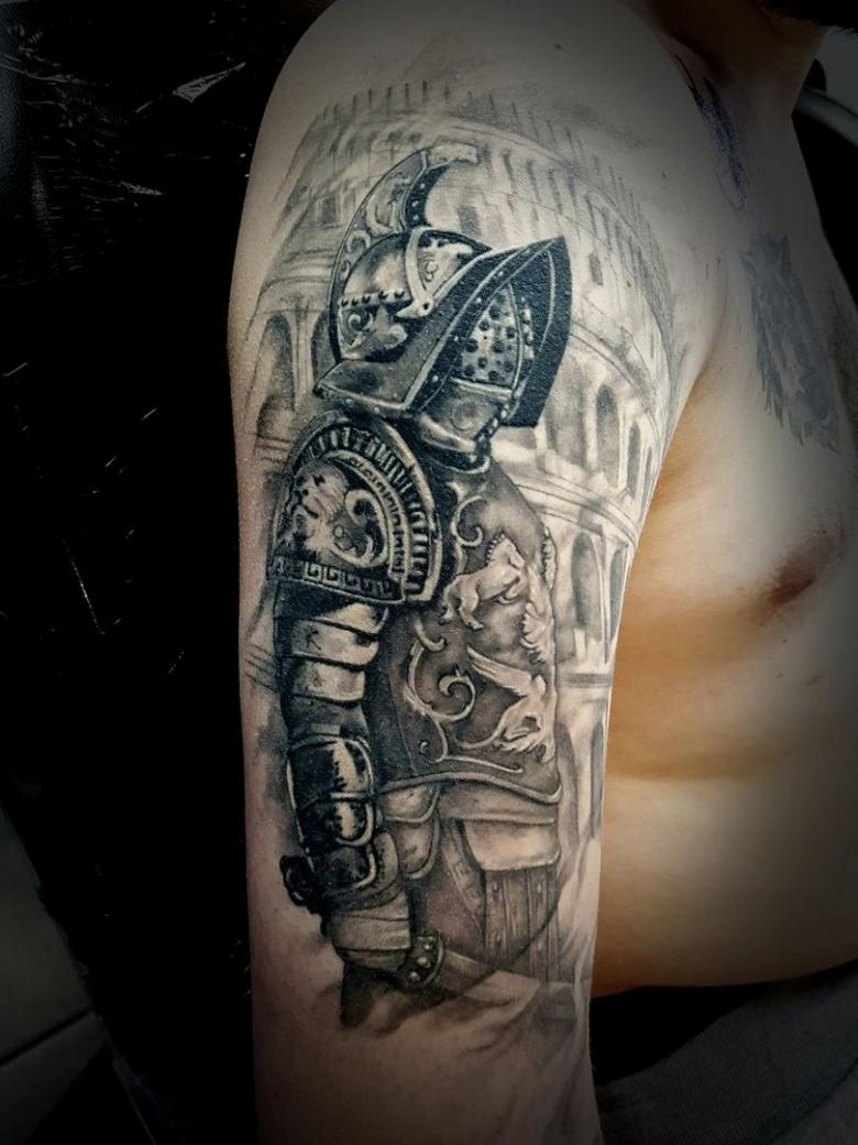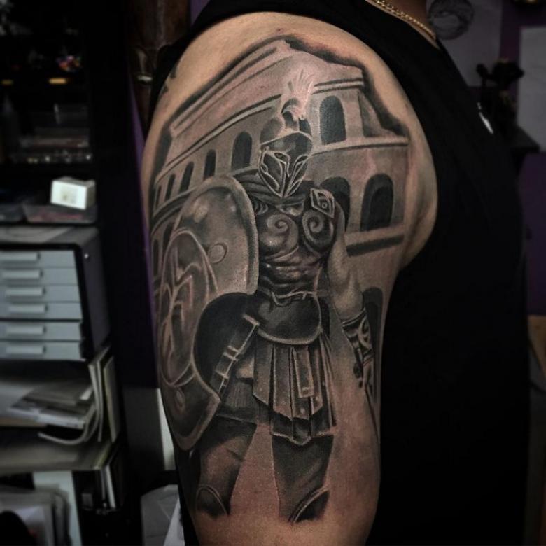 Les tatouages de gladiateurs volumineux et réalistes sont parfaits sur l'épaule car il y a suffisamment d'espace pour créer une image détaillée. Ceci est particulièrement avantageux si l'épaule est massive et musclée.