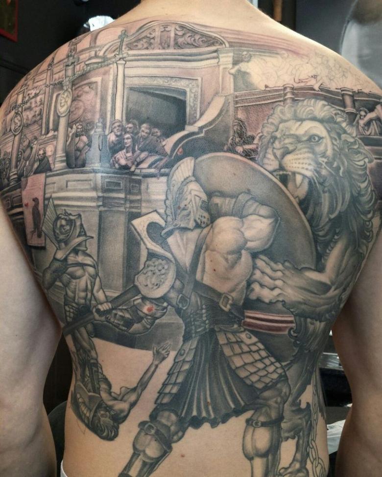 Cependant, on choisit plus souvent le dos ou la poitrine, car le développement physique du corps n'est pas important ici. Dans tous les cas, le maître disposera de beaucoup d'espace pour la création d'un travail de qualité. L'essentiel est de trouver une photo appropriée avec un gladiateur ou un thème donné.