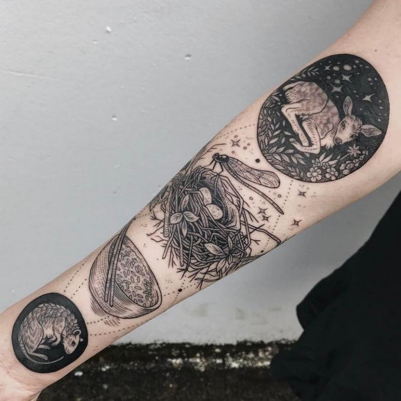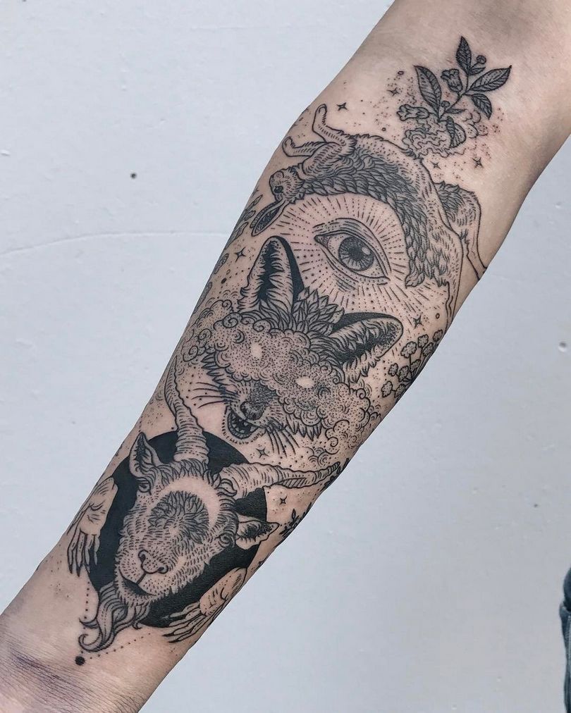 En choisissant un tatouage de style graphique, les clients ne sont pas limités dans leurs désirs. Dans le salon, vous pouvez demander des croquis tout prêts, mais il n'est pas interdit de décrire vos idées et d'exprimer vos souhaits. Les filles demandent souvent des motifs subtils et gracieux, tandis que les hommes préfèrent les images d'animaux qui combinent les qualités suivantes : force, persévérance, endurance.