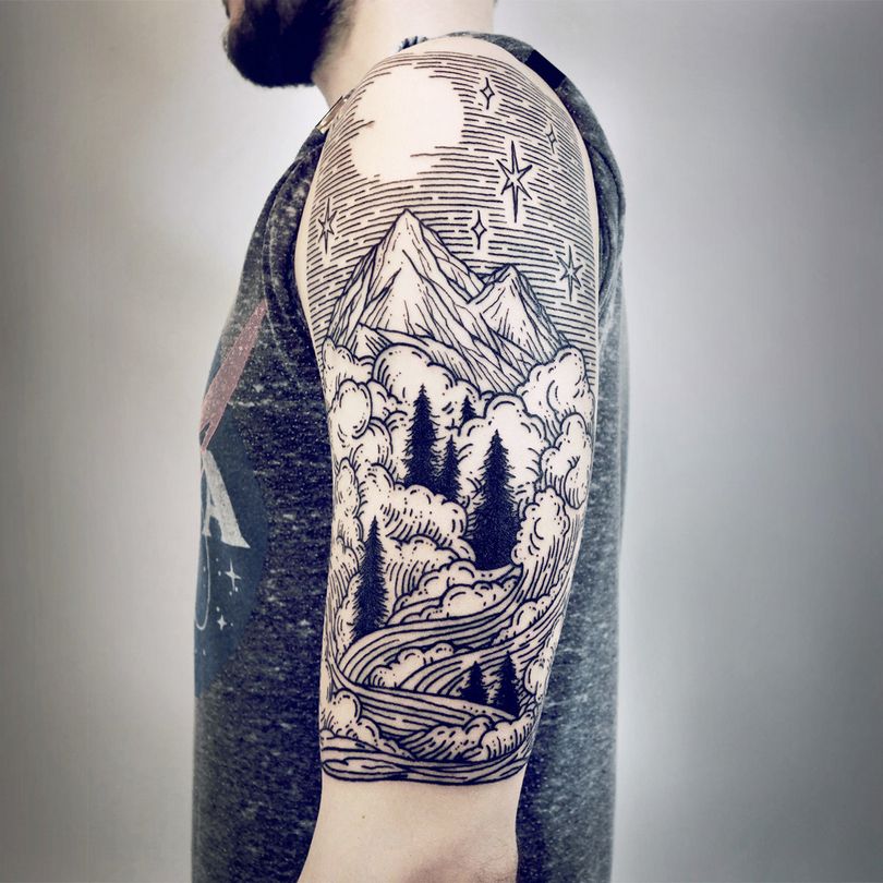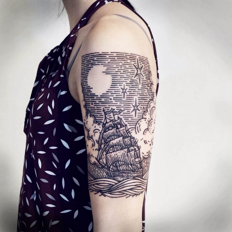 Les tatouages de style graphique sont devenus populaires au 21e siècle. Les esquisses à part entière sont apparues en 2000, les maîtres s'inspirant d'anciennes gravures d'artistes, créées au Moyen Âge.
