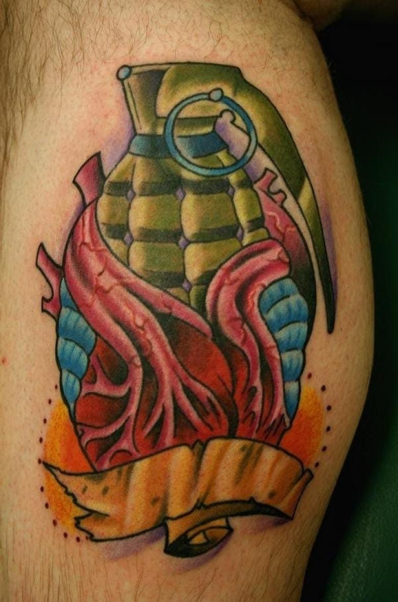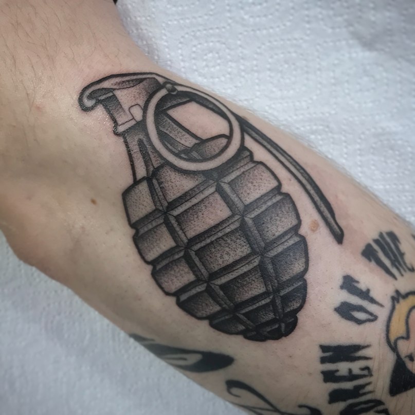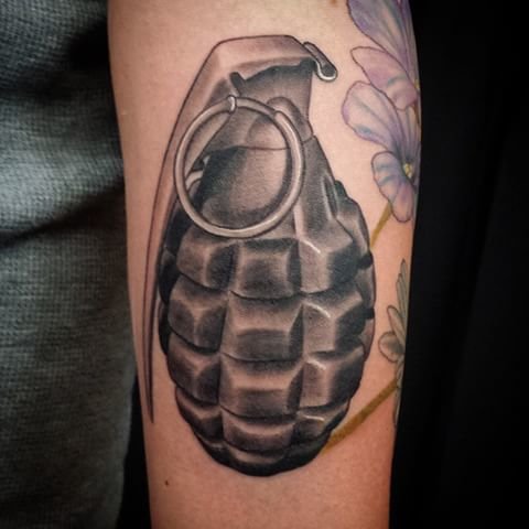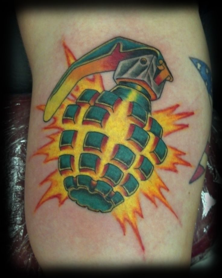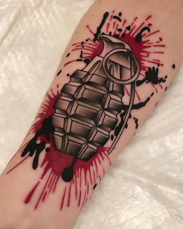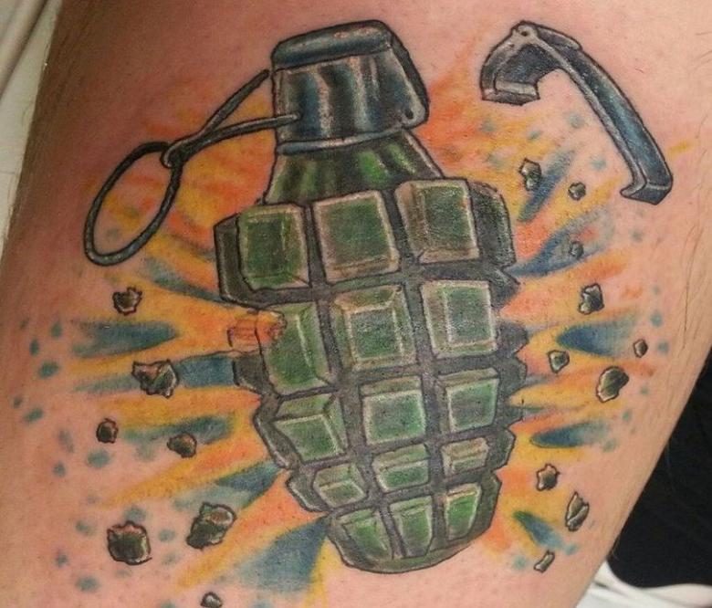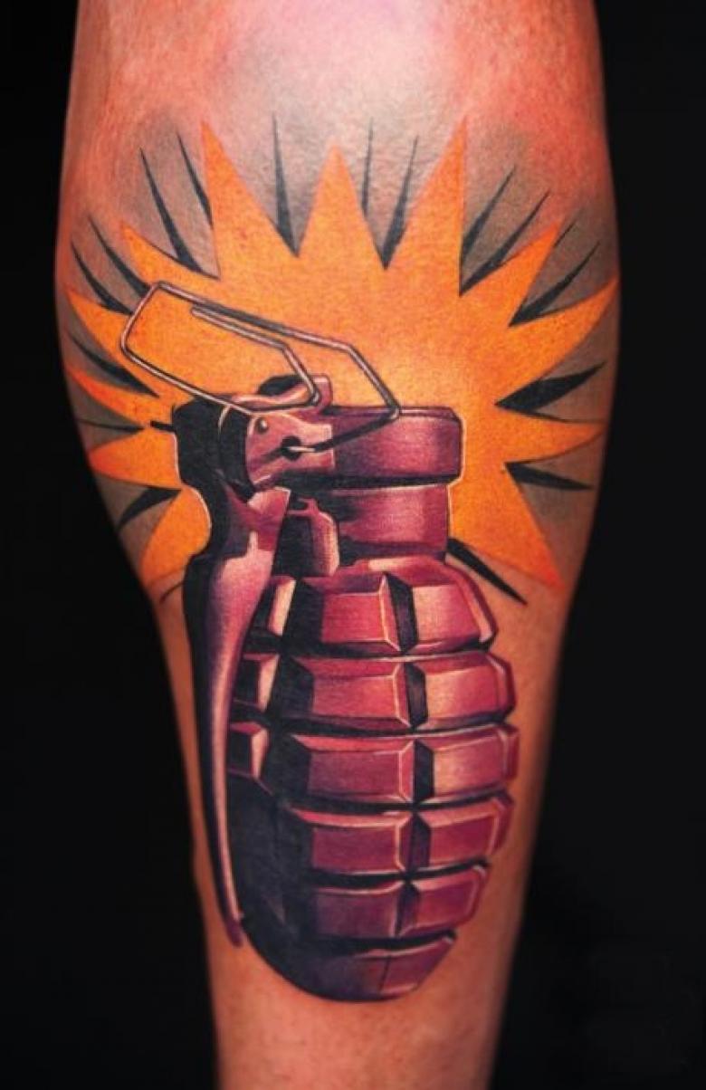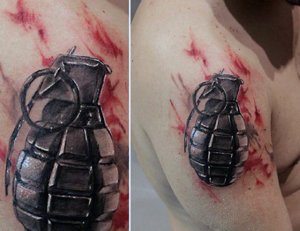 Le tatouage de grenade peut être aussi naturaliste que possible, ou bien il peut être symbolique, où seuls le contour et la couleur permettent de deviner le sujet visé. Généralement, le tatouage est complété par des éléments explosifs associatifs. Il n'est pas rare que l'encre noire soit combinée avec du rouge, ce qui ajoute de la couleur.