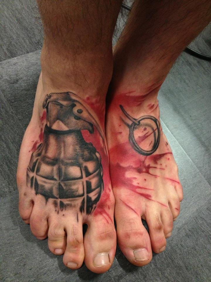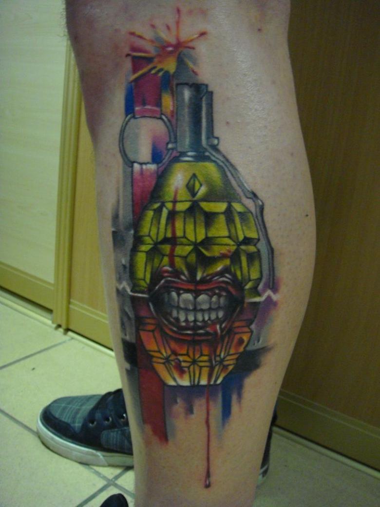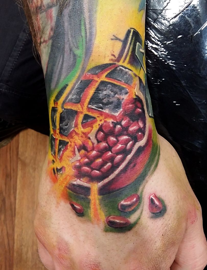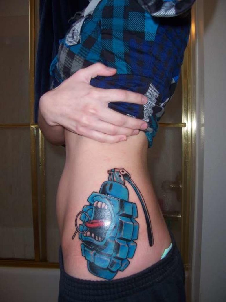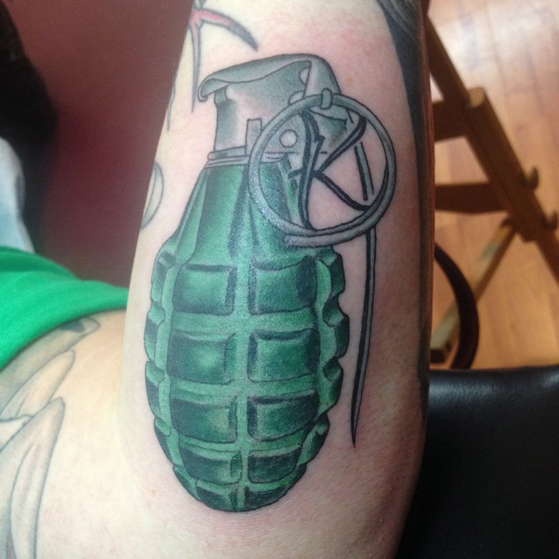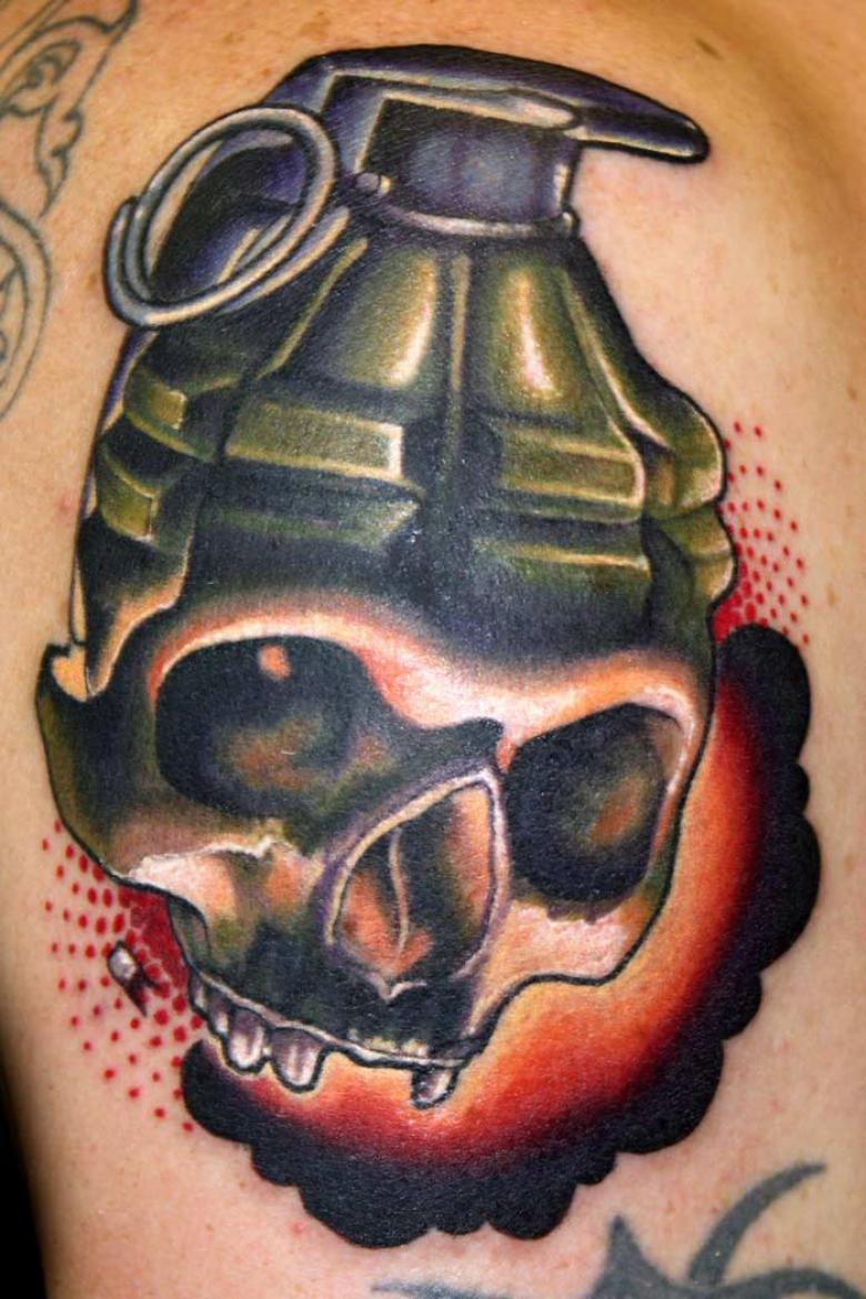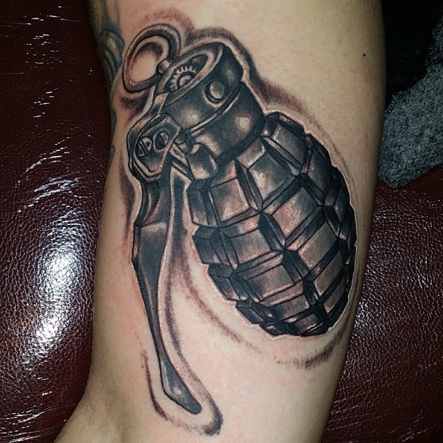 Le tatouage de grenade peut être aussi naturaliste que possible, ou bien il peut être symbolique, où seuls le contour et la couleur permettent de deviner le sujet visé. Généralement, le tatouage est complété par des éléments explosifs associatifs. Il n'est pas rare que l'encre noire soit combinée avec du rouge, ce qui ajoute de la couleur.