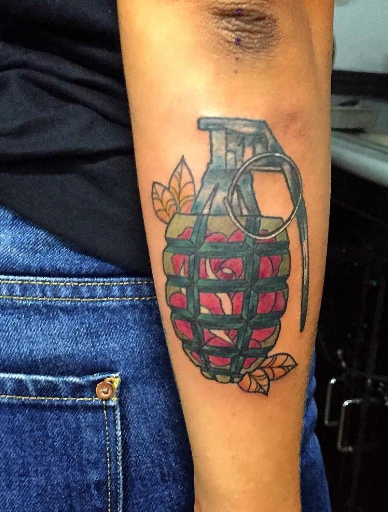 Bien que très répandue chez les hommes, certaines femmes choisissent la grenade en raison de leur nature martiale ou de leur passion pour l'art de la guerre et l'amour des armes. Le tatouage peut dissimuler une forte personnalité prête à repousser toute attaque de l'extérieur.