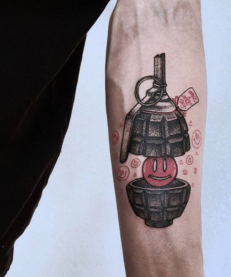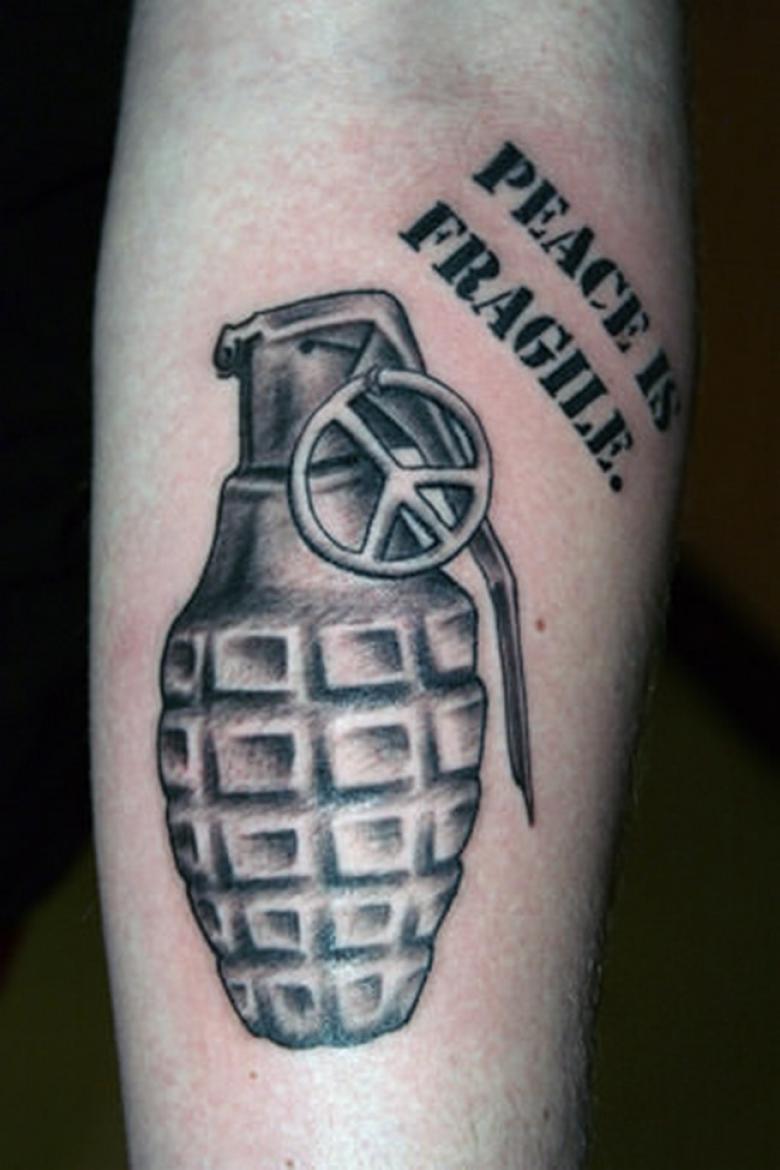 Les motifs pacifistes se retrouvent dans la combinaison d'objets incompatibles, par exemple grenade et ananas, grenade et cœur. Parfois, le tatouage est complété par des personnages de dessins animés, comme une tortue par association avec le célèbre dessin animé "Tortues Ninja".