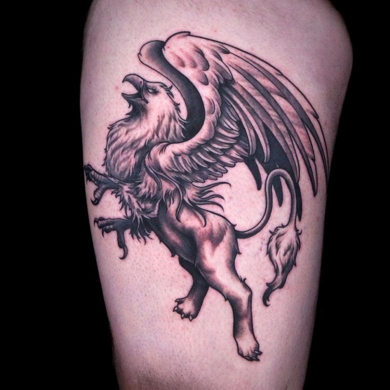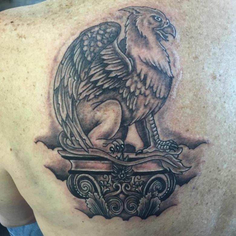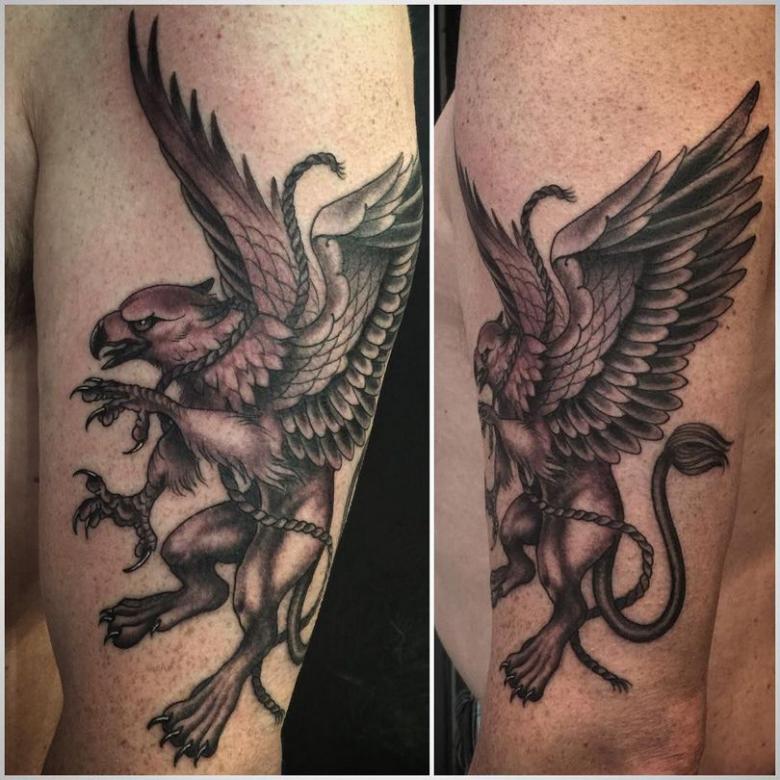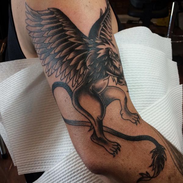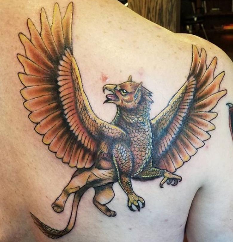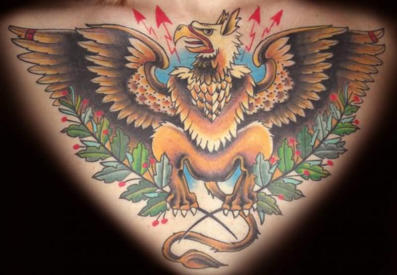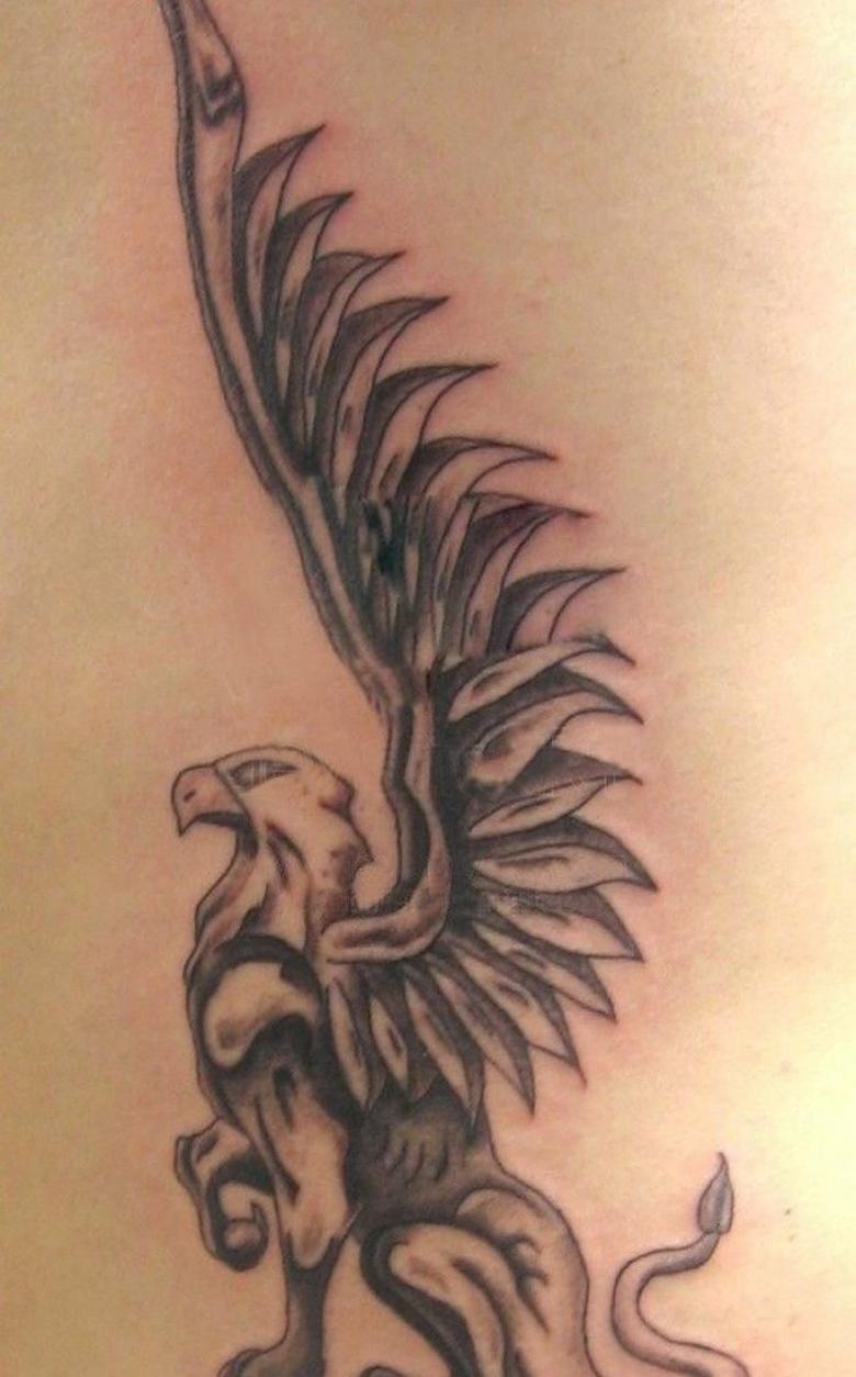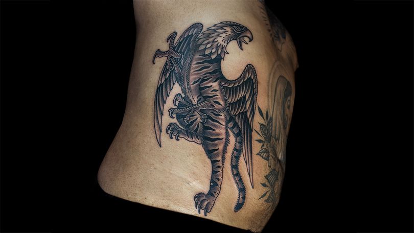 Ce tatouage permanent représente une bête mythique issue des légendes des anciens. Il s'agit d'une créature ailée composée d'un corps de lion, d'une puissante tête d'aigle et d'une queue de serpent.