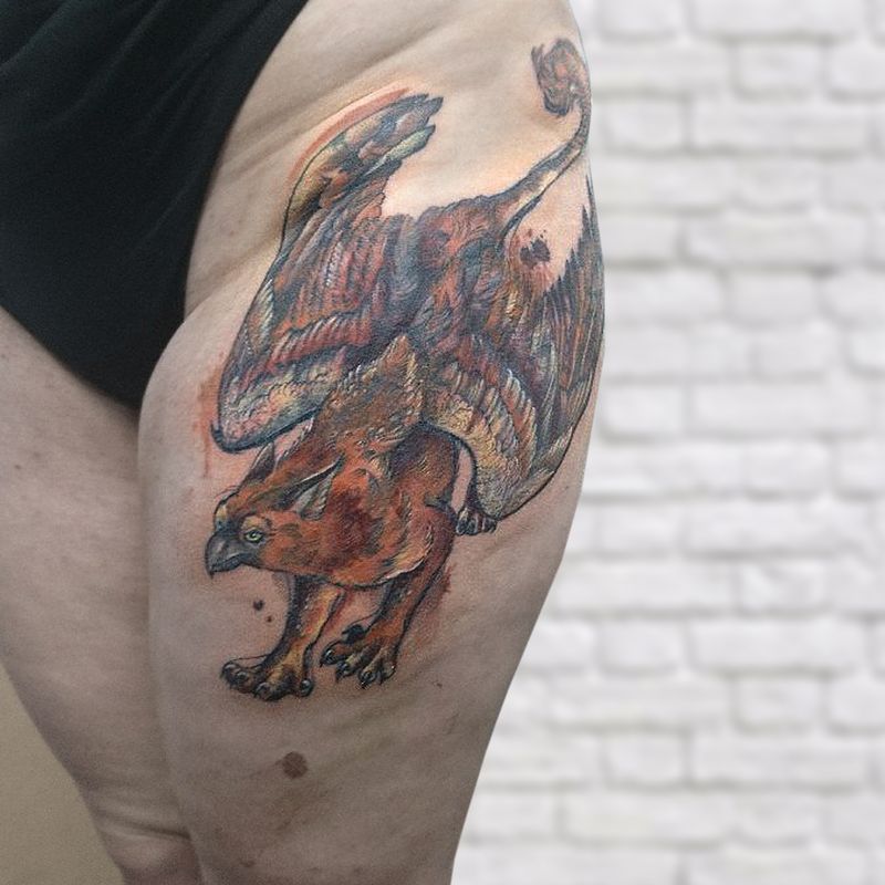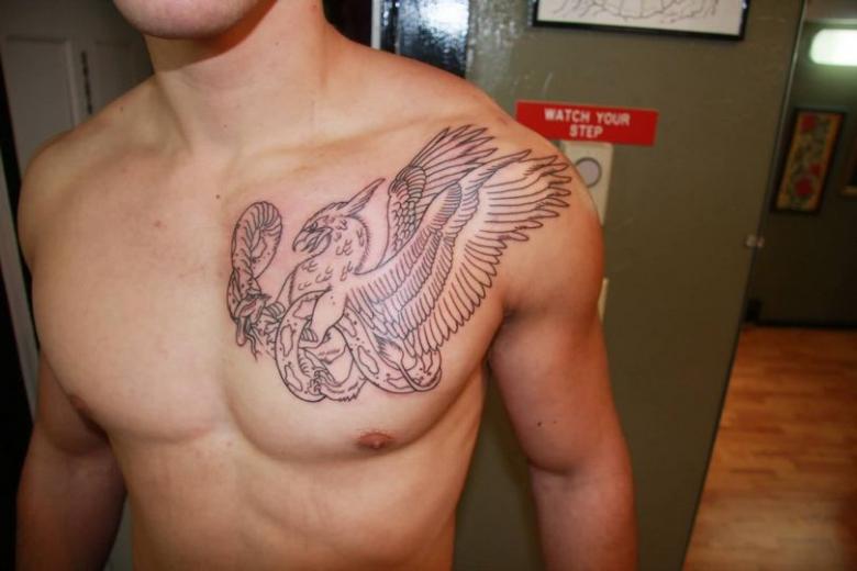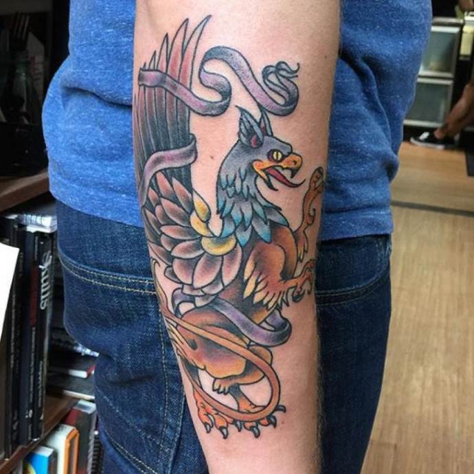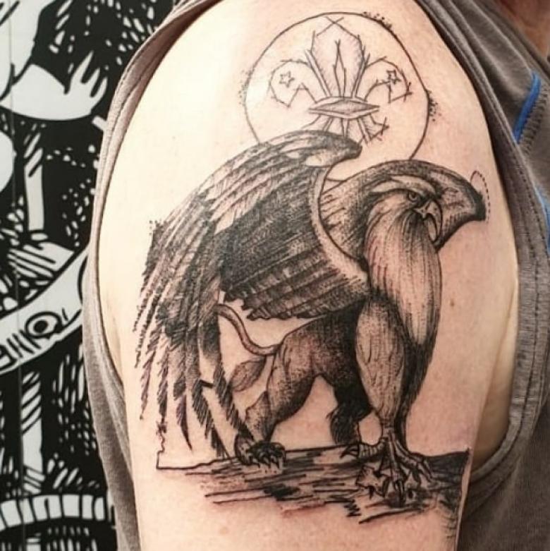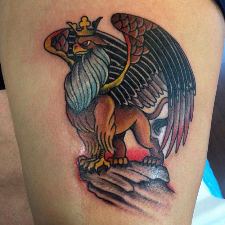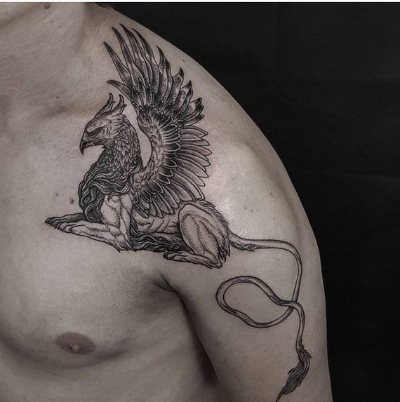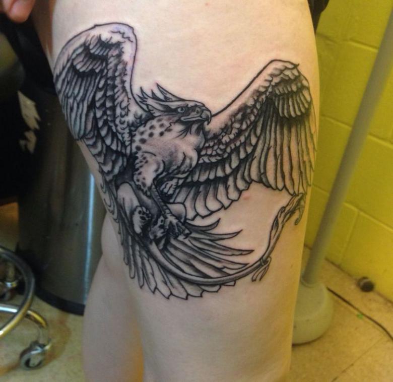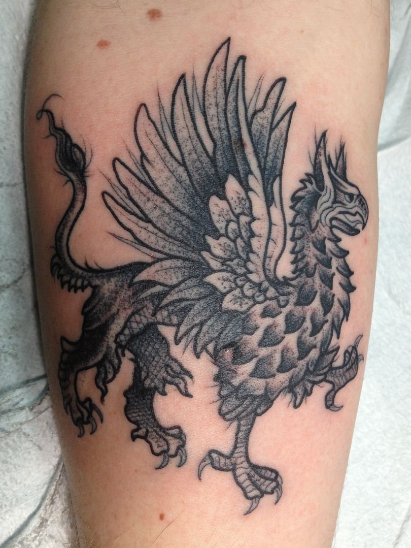 Ce tatouage permanent représente une bête mythique issue des légendes des anciens. Il s'agit d'une créature ailée composée d'un corps de lion, d'une puissante tête d'aigle et d'une queue de serpent.