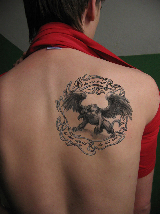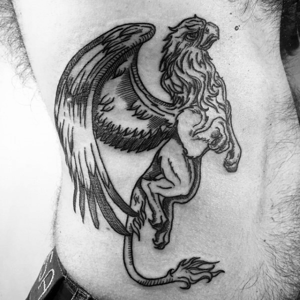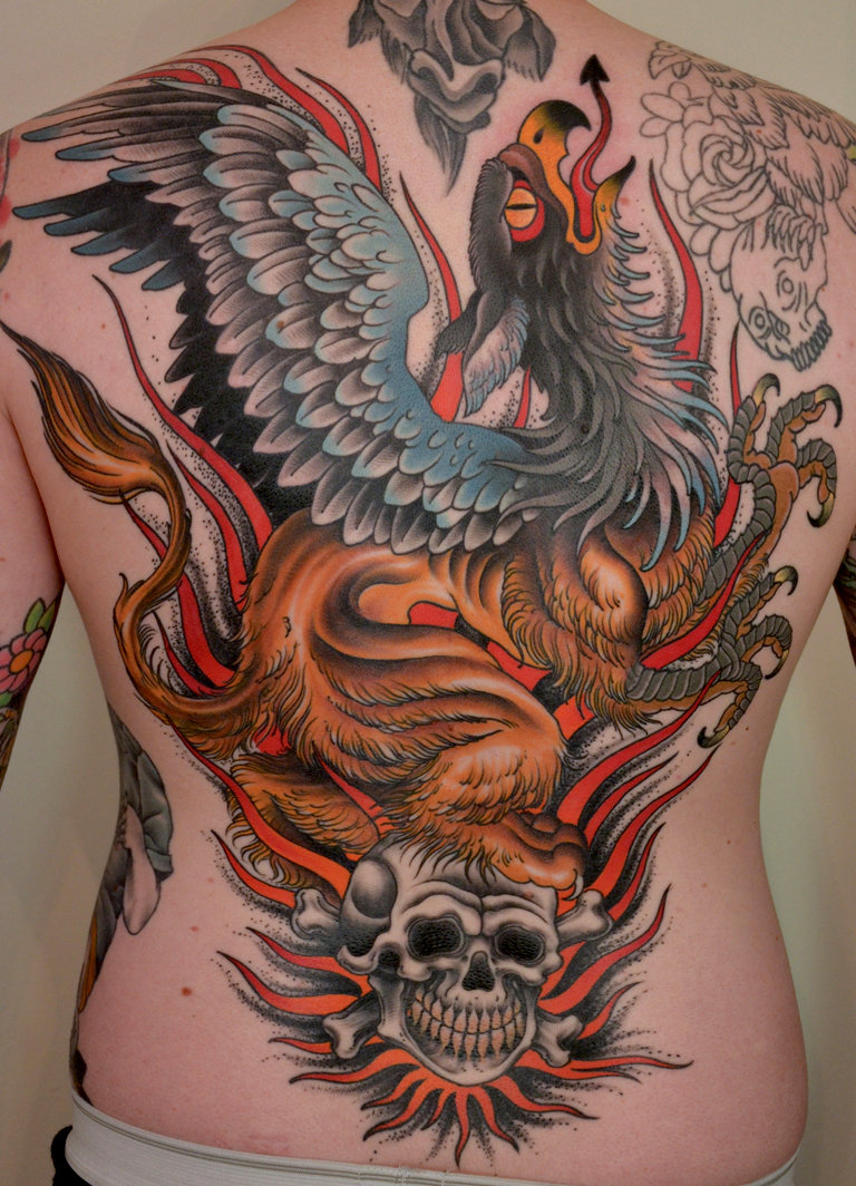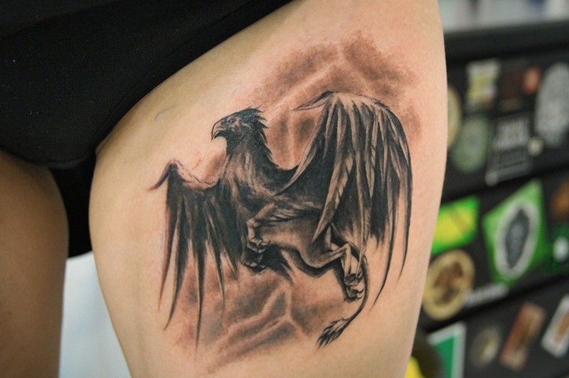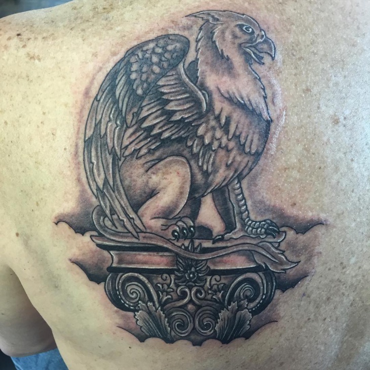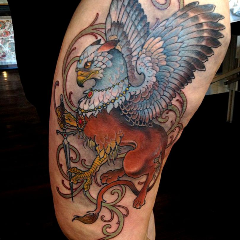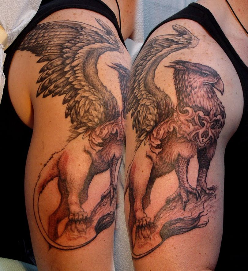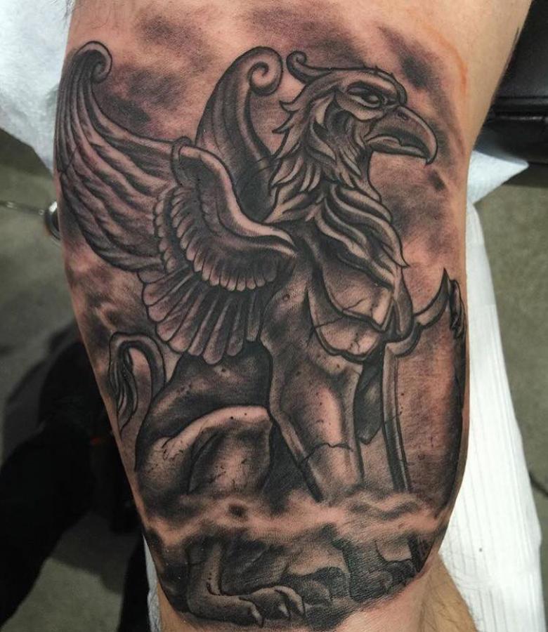 Ce tatouage permanent représente une bête mythique issue des légendes des anciens. Il s'agit d'une créature ailée composée d'un corps de lion, d'une puissante tête d'aigle et d'une queue de serpent.