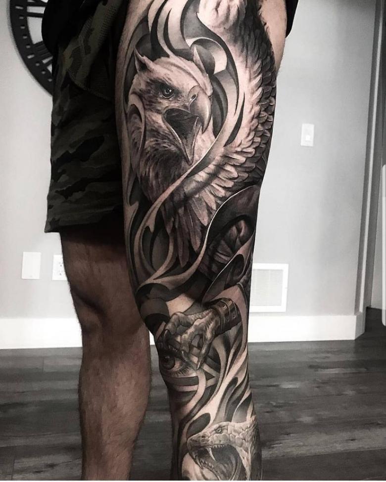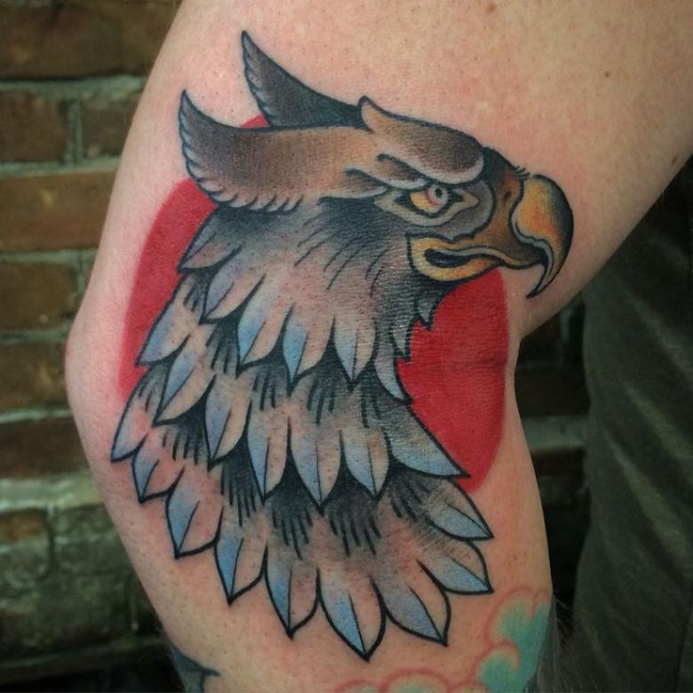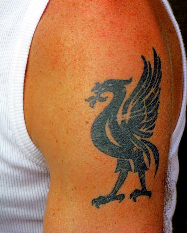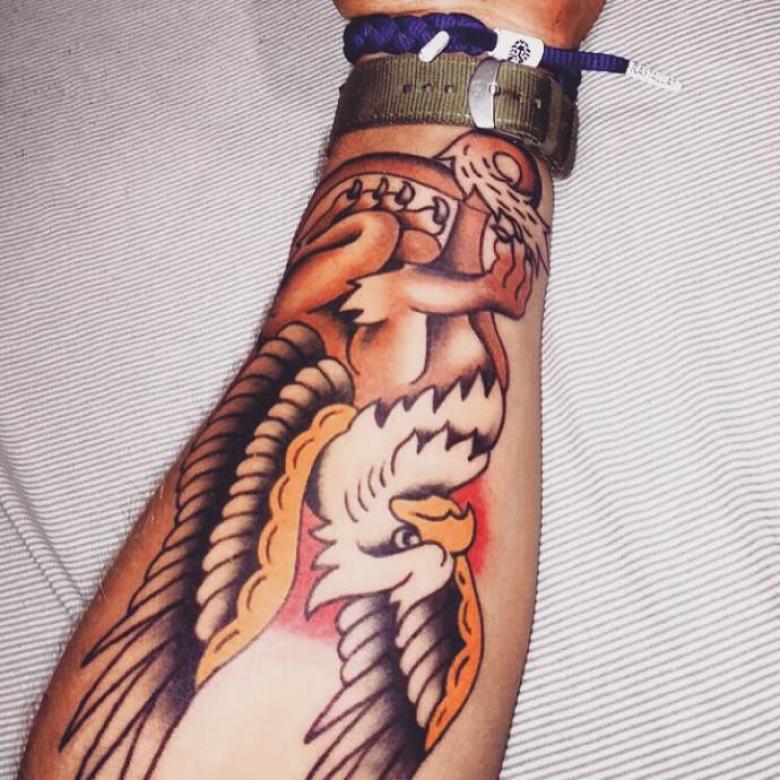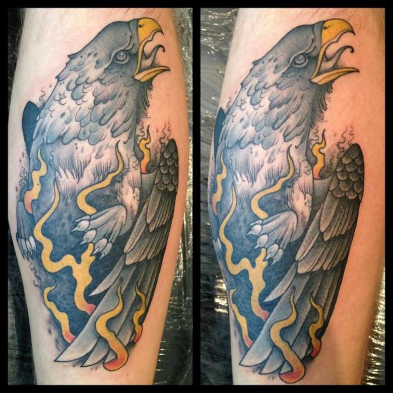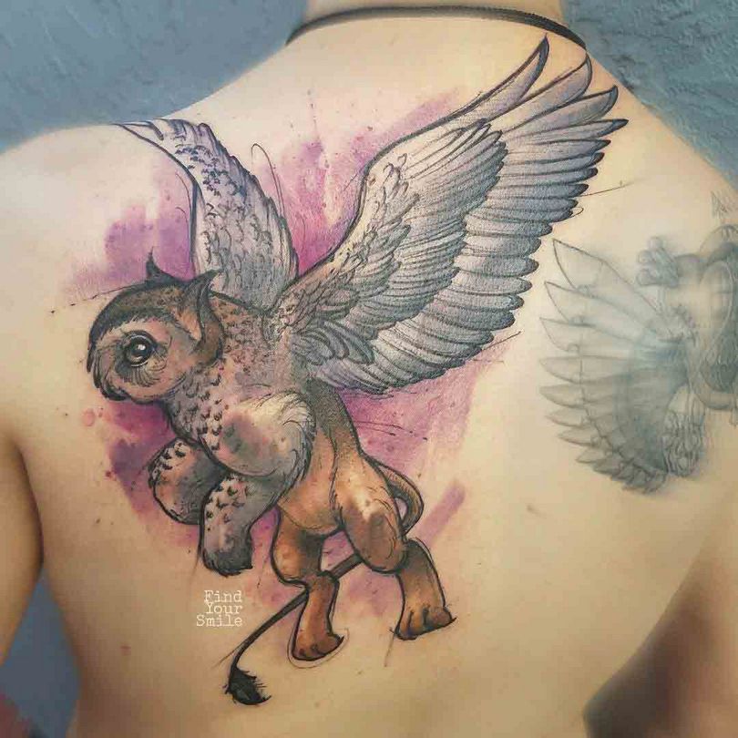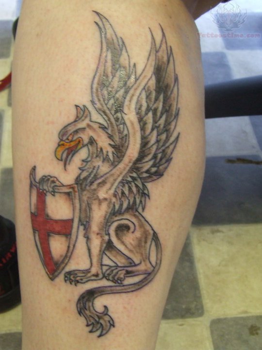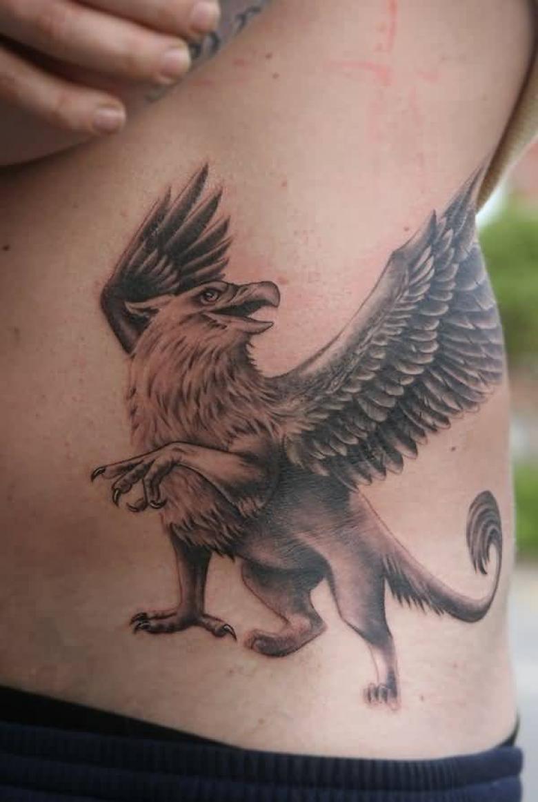 Ce tatouage permanent représente une bête mythique issue des légendes des anciens. Il s'agit d'une créature ailée composée d'un corps de lion, d'une puissante tête d'aigle et d'une queue de serpent.