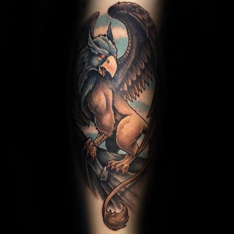 Un tatouage de griffon convient aux personnes courageuses et orientées vers un but. Pour remplir cette image peut être celui qui est habitué à être un chef de file, de ne pas plier sous la pression de la malchance des événements de la vie, supprimer de la voie de l'adversité, de combiner la force spirituelle et physique.