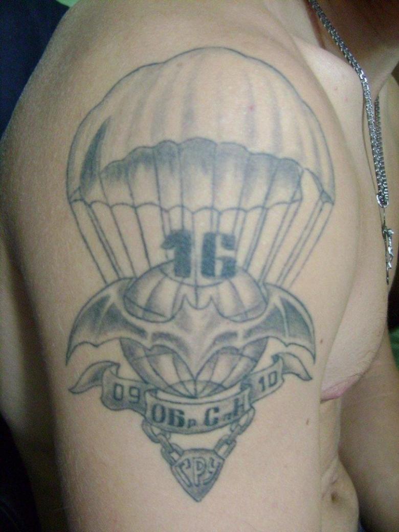 Le deuxième tatouage le plus populaire du GRU est le parachute à voilure ouverte. On le retrouve dans 90% des cas, le plus souvent comme un signe direct d'être un parachutiste aéroporté.