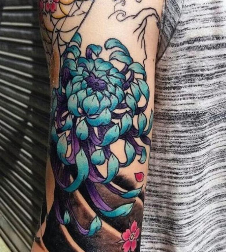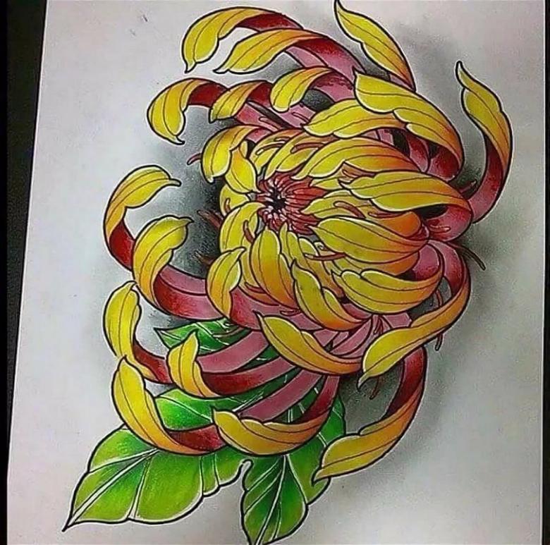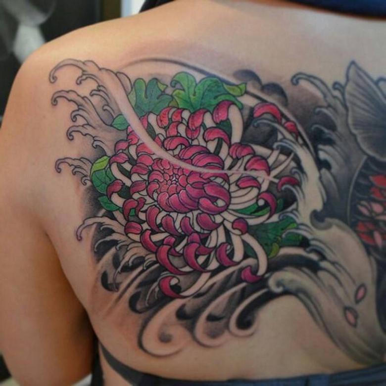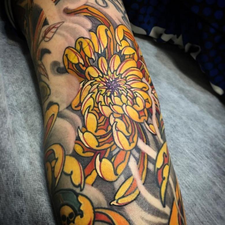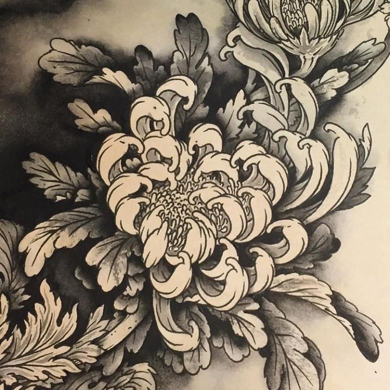 Les chrysanthèmes ne peuvent être tatoués que par les membres de la famille impériale et sont un attribut des souverains, signifiant force, puissance, indestructibilité et influence. On trouve de nombreuses images de cette fleur dans l'art du Japon - sur les gravures, dans les peintures et dans les poèmes (hokku, tanka).