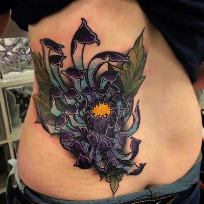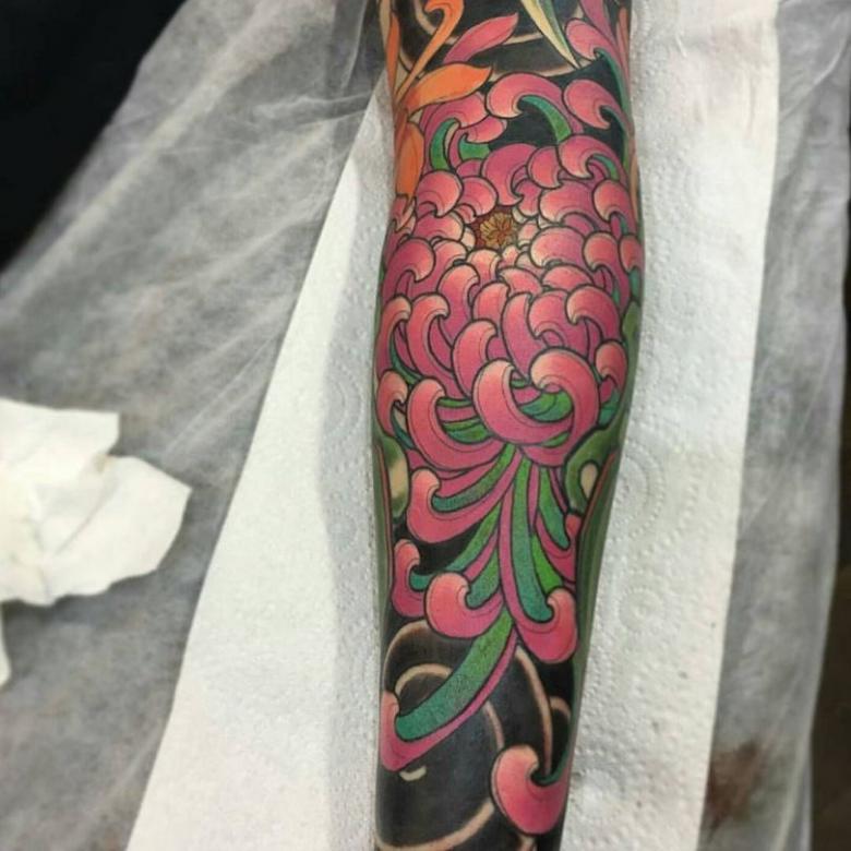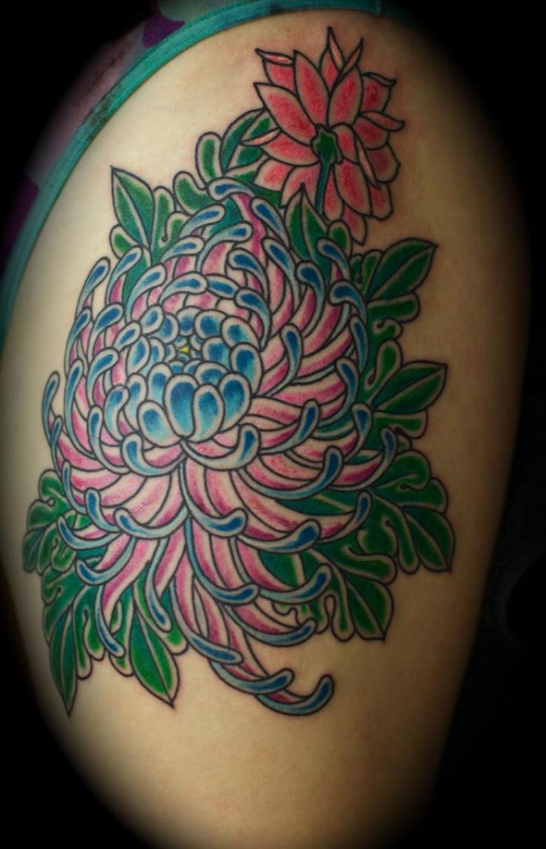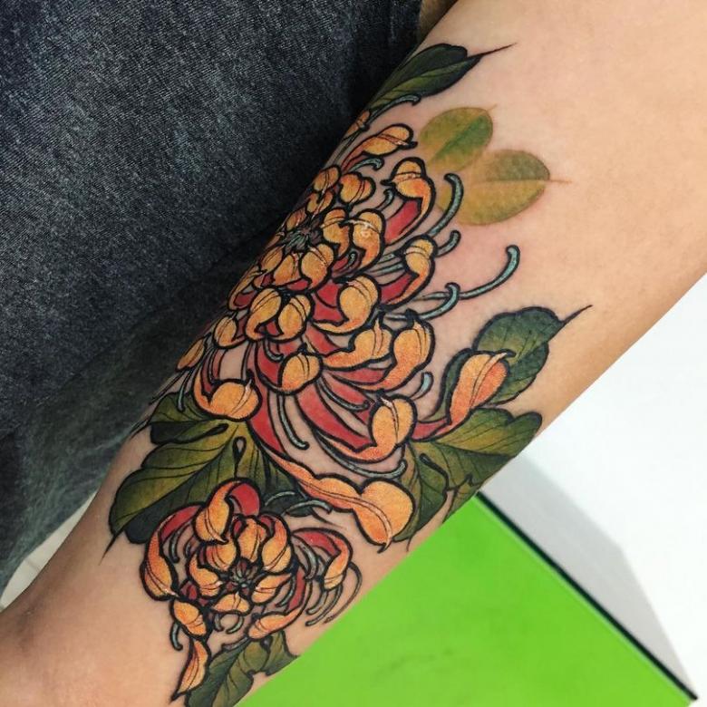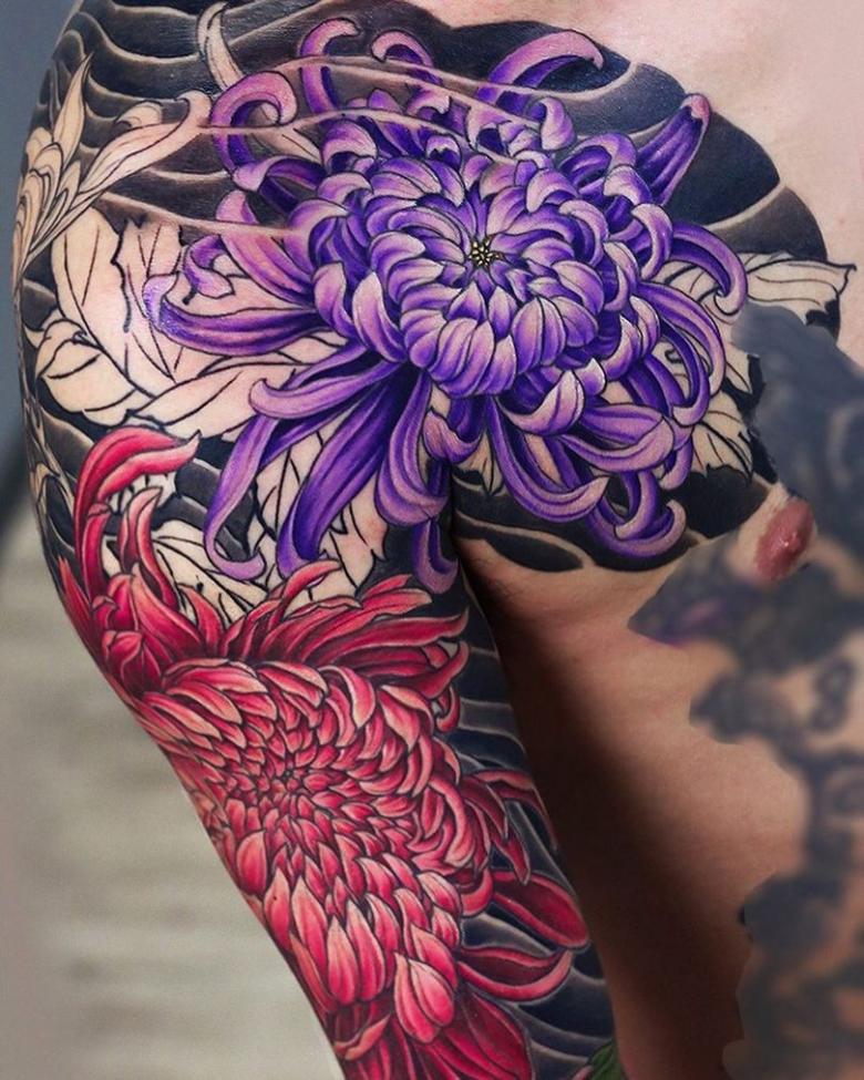Les chrysanthèmes ne peuvent être tatoués que par les membres de la famille impériale et sont un attribut des souverains, signifiant force, puissance, indestructibilité et influence. On trouve de nombreuses images de cette fleur dans l'art du Japon - sur les gravures, dans les peintures et dans les poèmes (hokku, tanka).